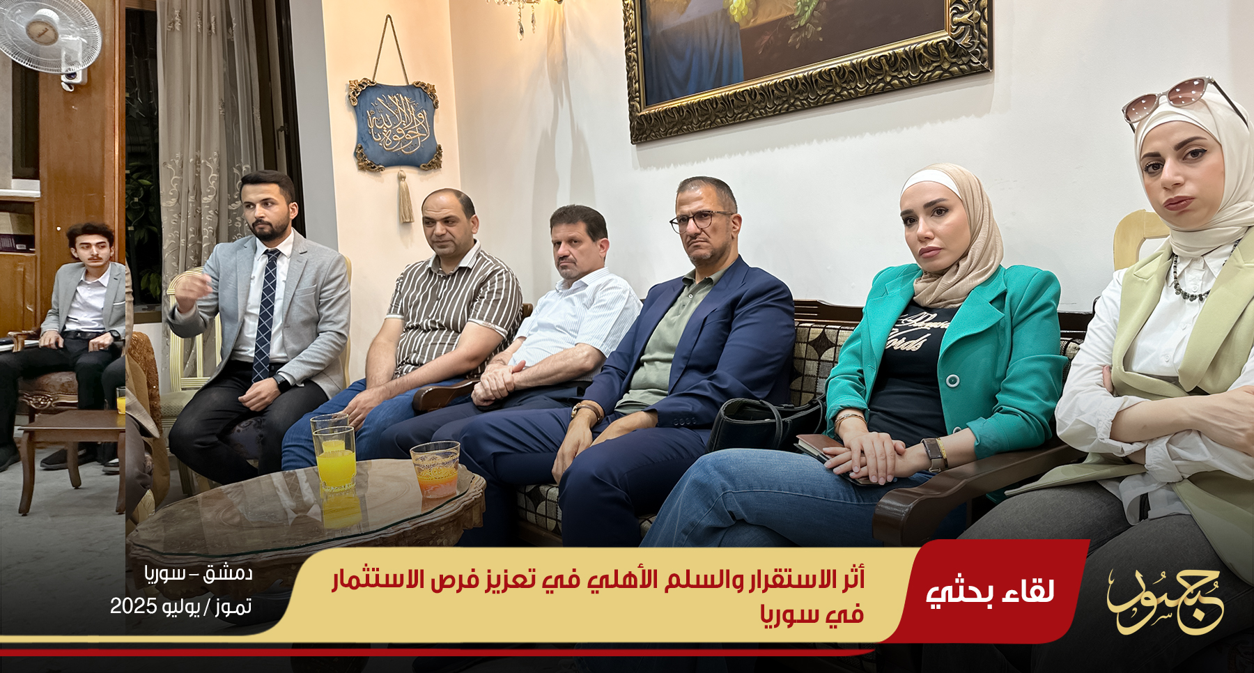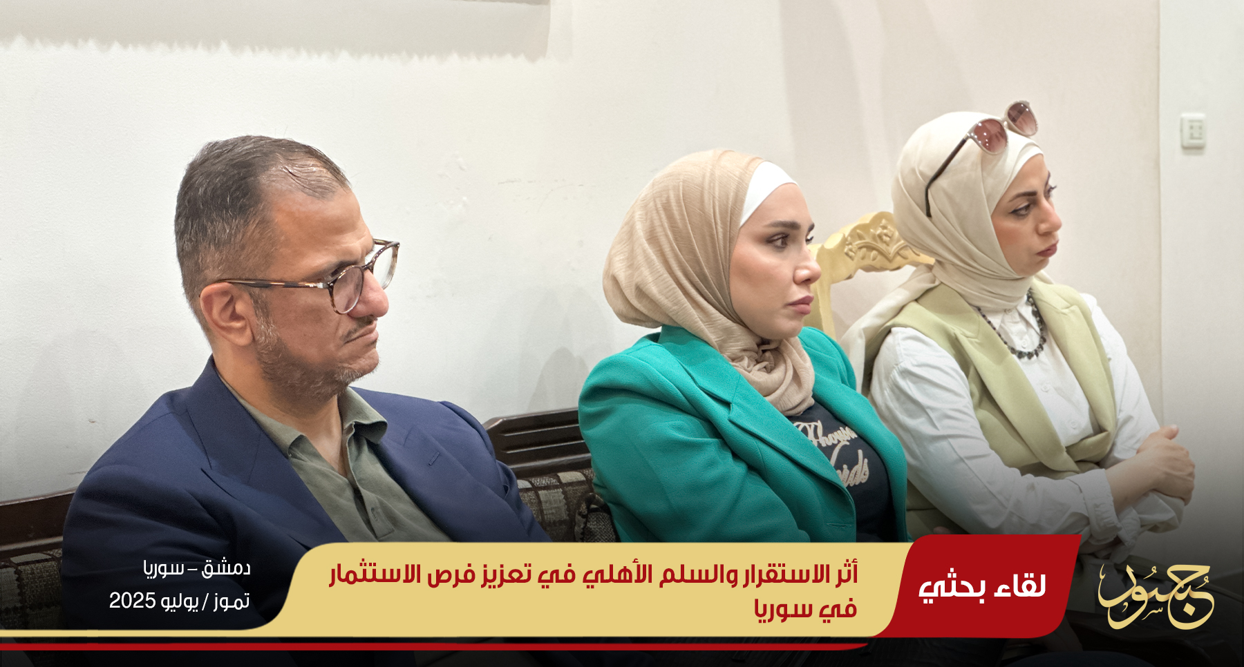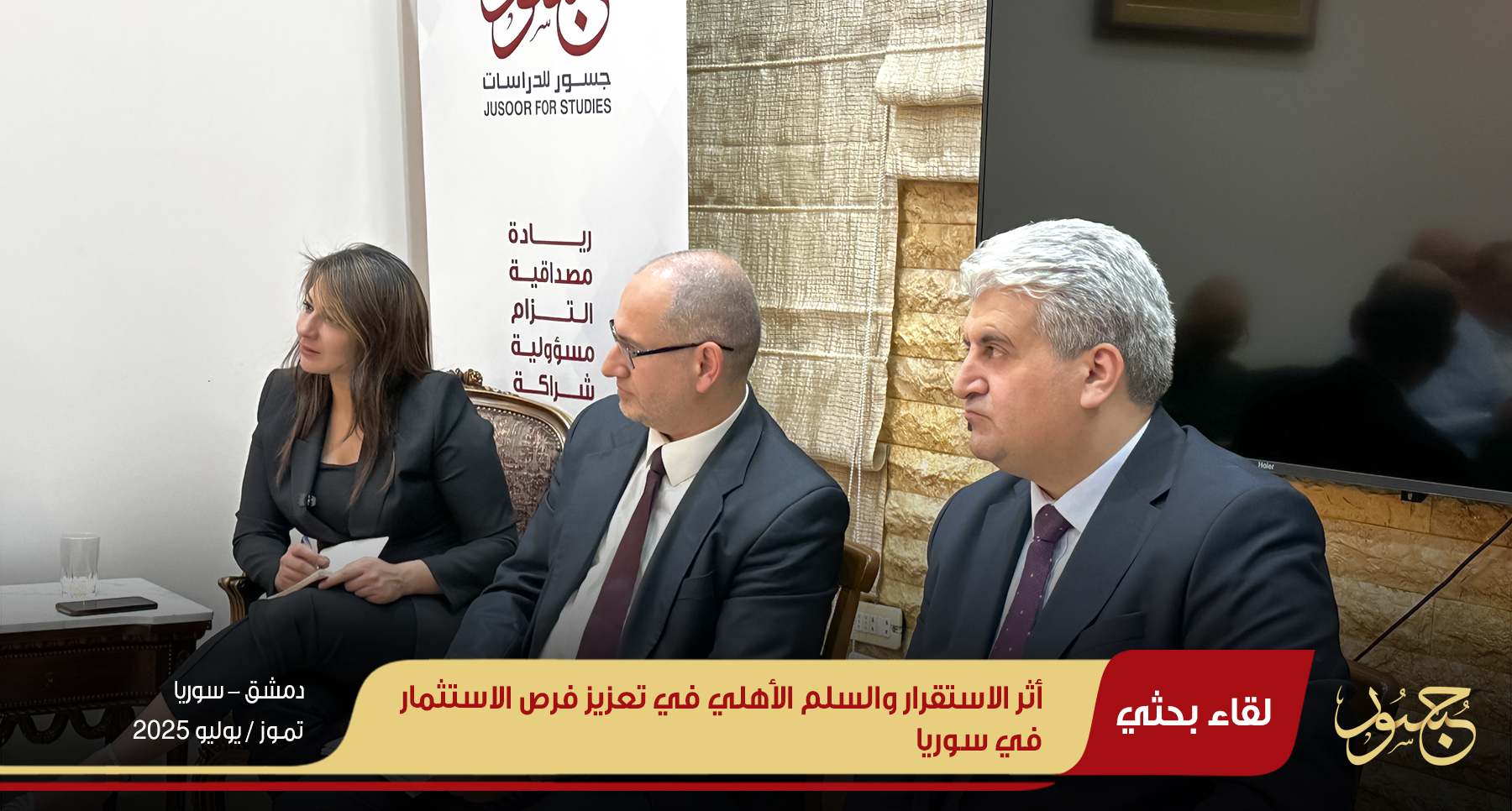 في ظل التوترات الأمنية التي تشهدها بعض المناطق السورية، والتي قد تشكل تهديداً للسلم الأهلي وتعيق فرص الاستثمار، نظم مركز جسور للدراسات جلسة حوارية بعنوان: "تأثير الاستقرار والسلم الأهلي على الفرص الاستثمارية في سوريا"، وذلك مساء الخميس 24 تموز/يوليو 2025، بمقر المركز في مدينة دمشق.