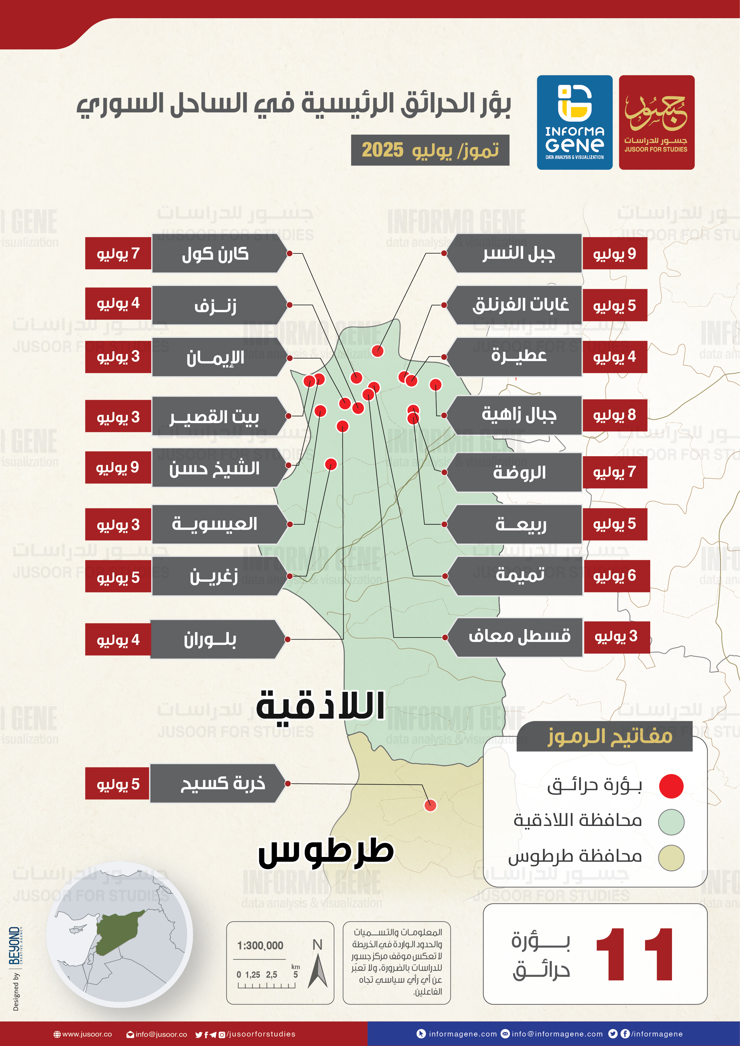 يشهد الساحل السوري منذ 30 حزيران/ يونيو 2025 حرائق كبيرة، ورغم الجهود الكبيرة التي تبذلها الحكومة السورية لإخمادها فإن بعض النقاط ما تزال نشطة، وسط شكوك بافتعالها أو بعض البؤر فيها، التي وصل عددها إلى 10 نقاط في محافظتَي اللاذقية وطرطوس،