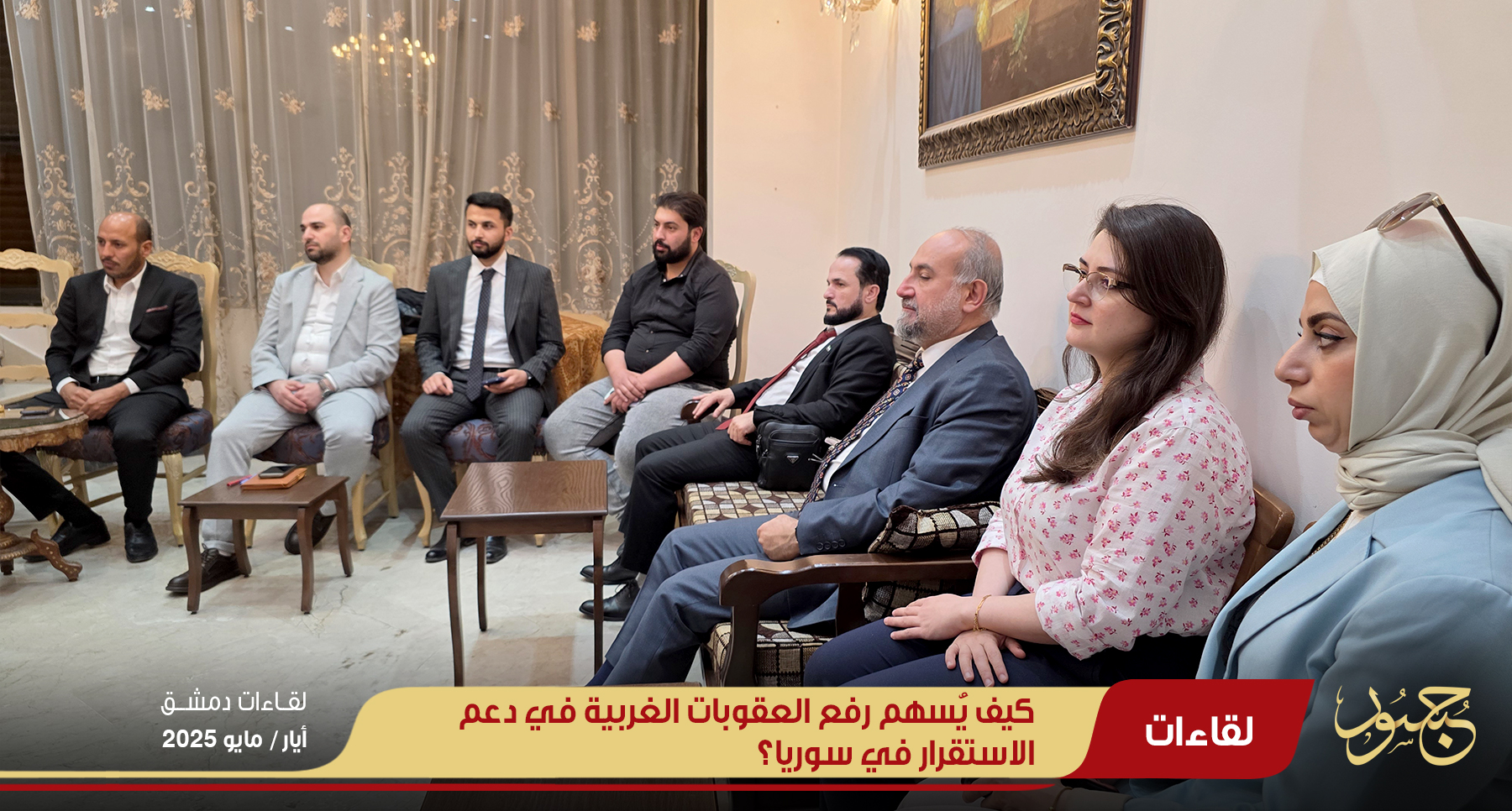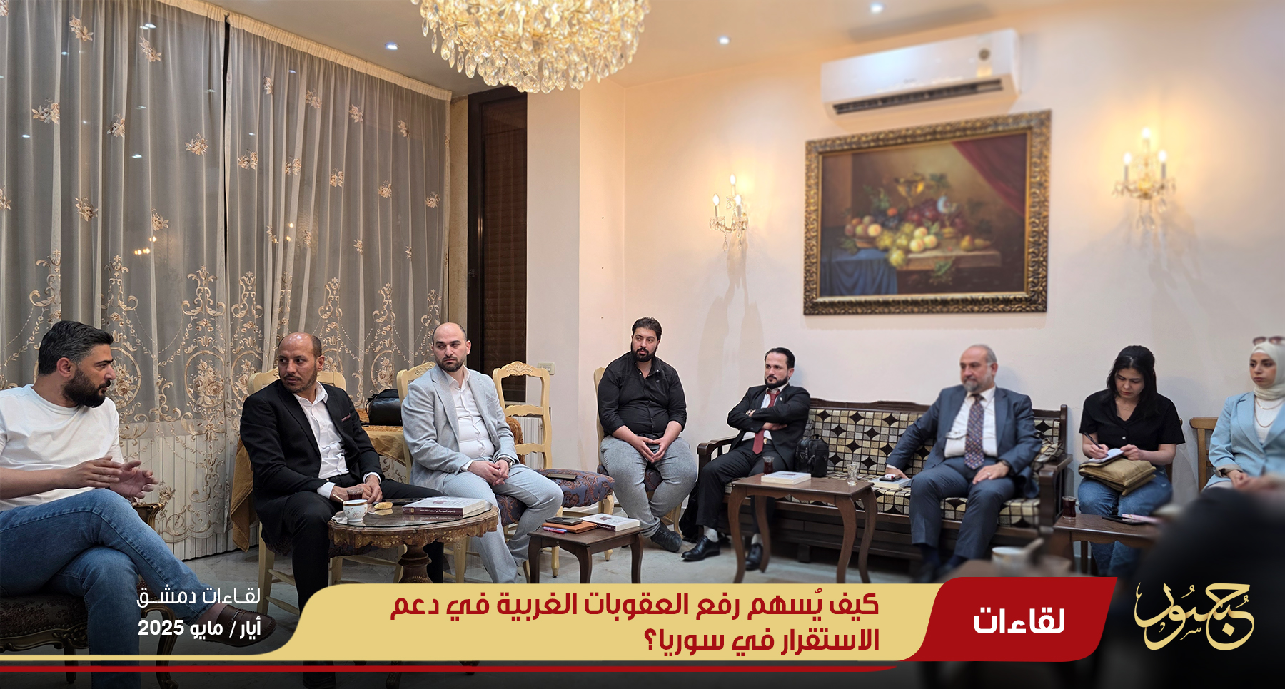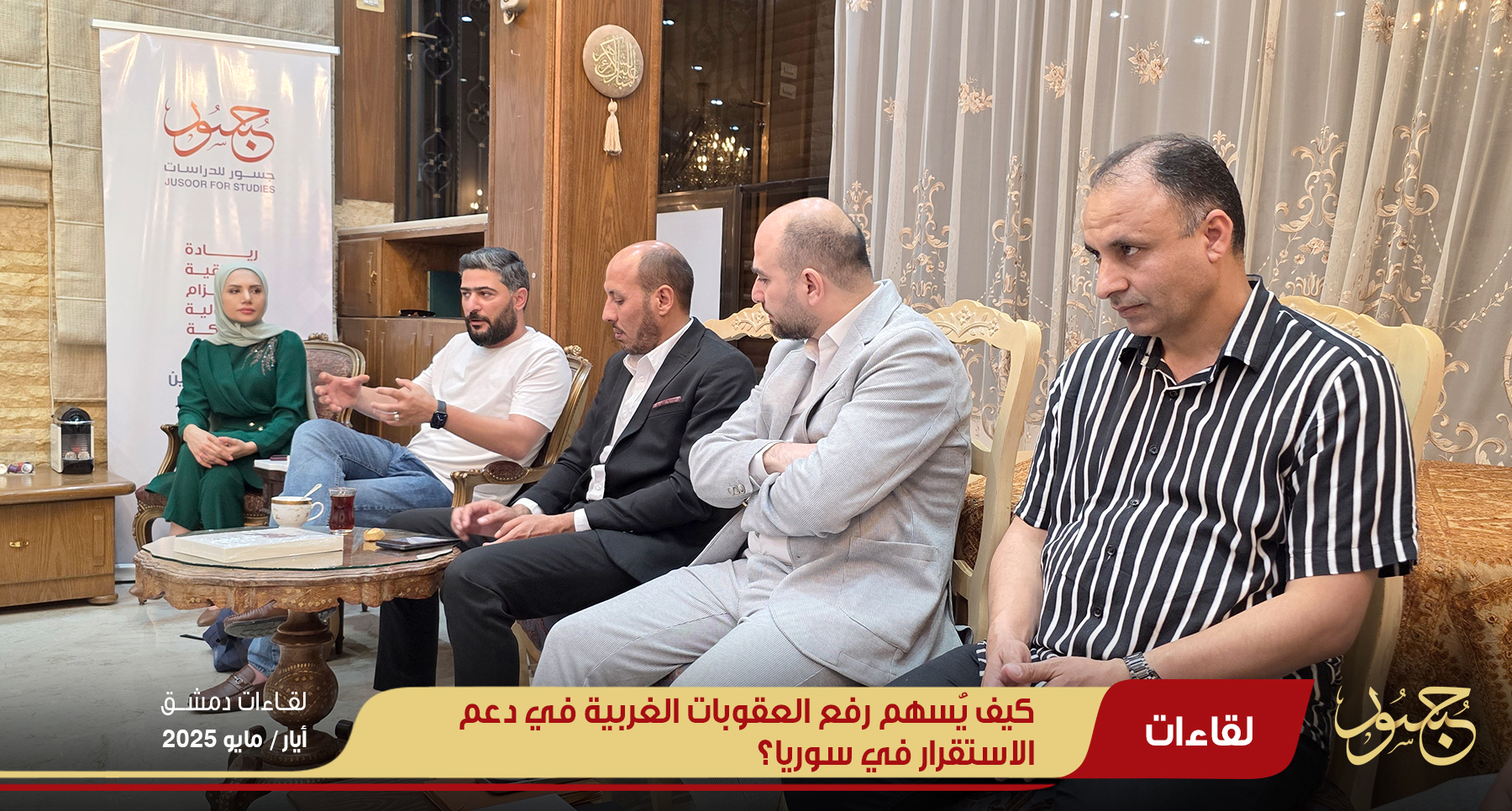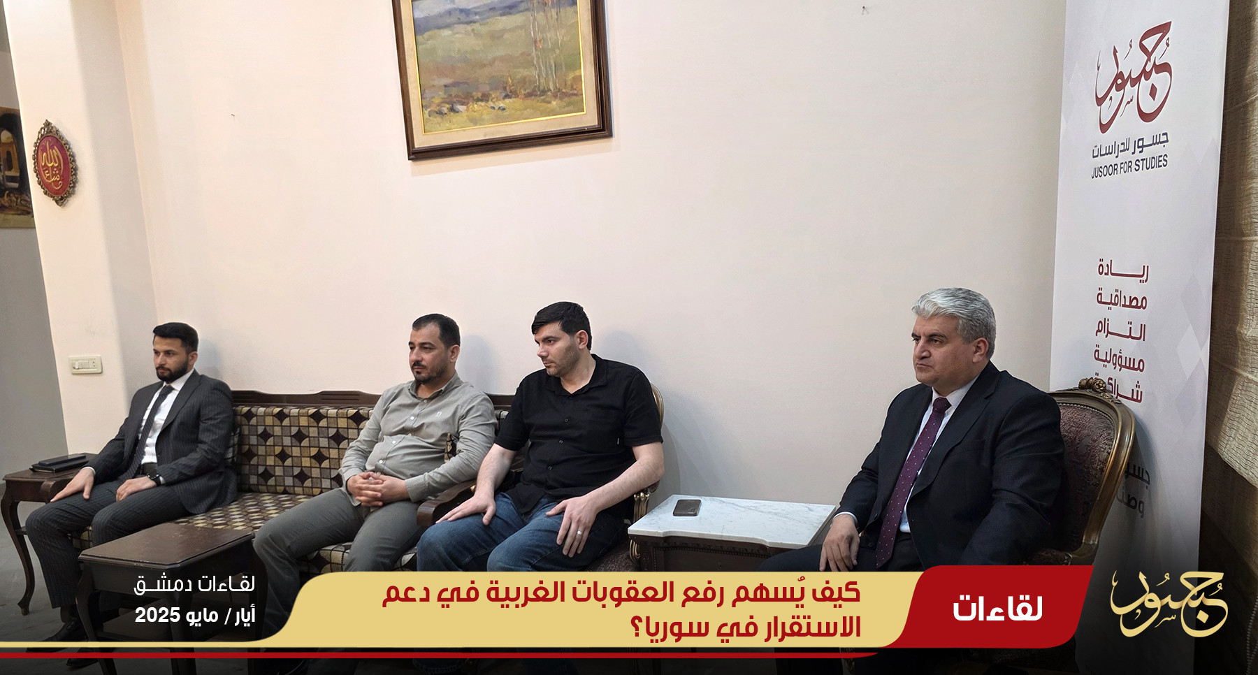 نظّم مركز جسور للدراسات لقاءً حوارياً بعنوان: "كيف يسهم رفع العقوبات الغربية في دعم الاستقرار في سوريا؟" وذلك مساء الخميس 22 أيار/ مايو 2025، في مكتبه الرئيسي بالعاصمة دمشق، بحضور نخبة من الخبراء والباحثين والفاعلين في المجالين الاقتصادي والسياسي، إلى جانب ممثلين عن منظمات المجتمع المدني والإعلام.