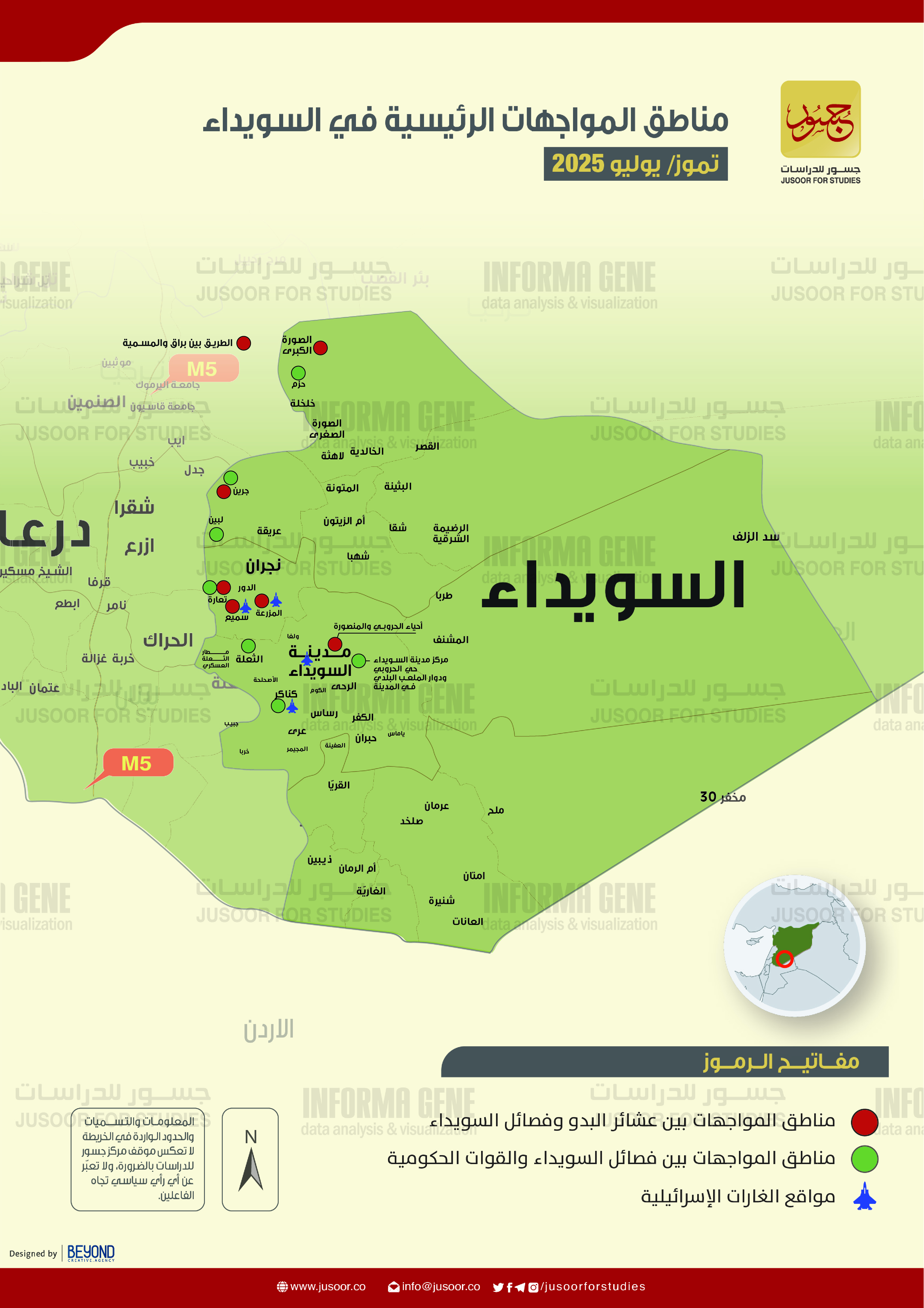 شهدت السويداء اشتباكات عسكرية بدأت على شكل مواجهات بين عشائر البدو وفصائل السويداء، امتدت على 11 نقطة، شملت أحياء وقرى وبلدات في الريف الشمالي والغربي للمحافظة، ومع تدخُّل القوات الحكومية لتأمين المدنيين وفض الاشتباك توسعت مناطق المواجهات مع عناصر الفصائل المحلية في السويداء على 12 نقطة مواجهة من بينها مركز المدينة.