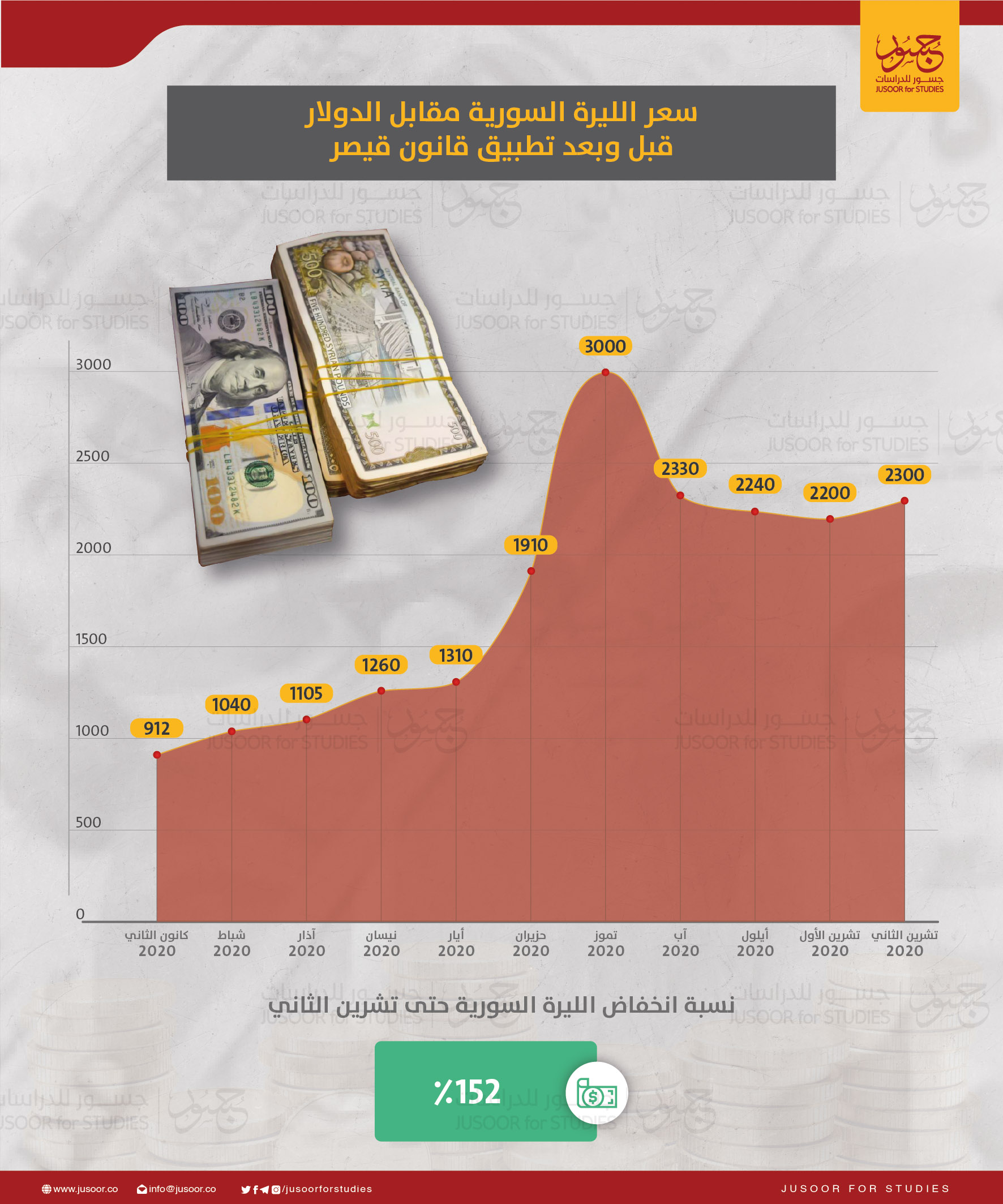 شهدت الليرة انخفاضاً ملحوظاً على خلفية التخوف من تطبيق قانون قيصر، فنلاحظ أن هناك ارتفاعاً أكثر من المعتاد في قيمة الدولار مقابل الليرة منذ مطلع أيار-مايو 2020، حيث ارتفع السعر من قرابة 1500 ليرة سورية لكل دولار إلى أكثر من 3500 ليرة سورية لكل دولار في الأسبوع الثاني من حزيران-يونيو، ثم عادت للاستقرار عند قرابة من 1800 ليرة أواخر الشهر نفسه.