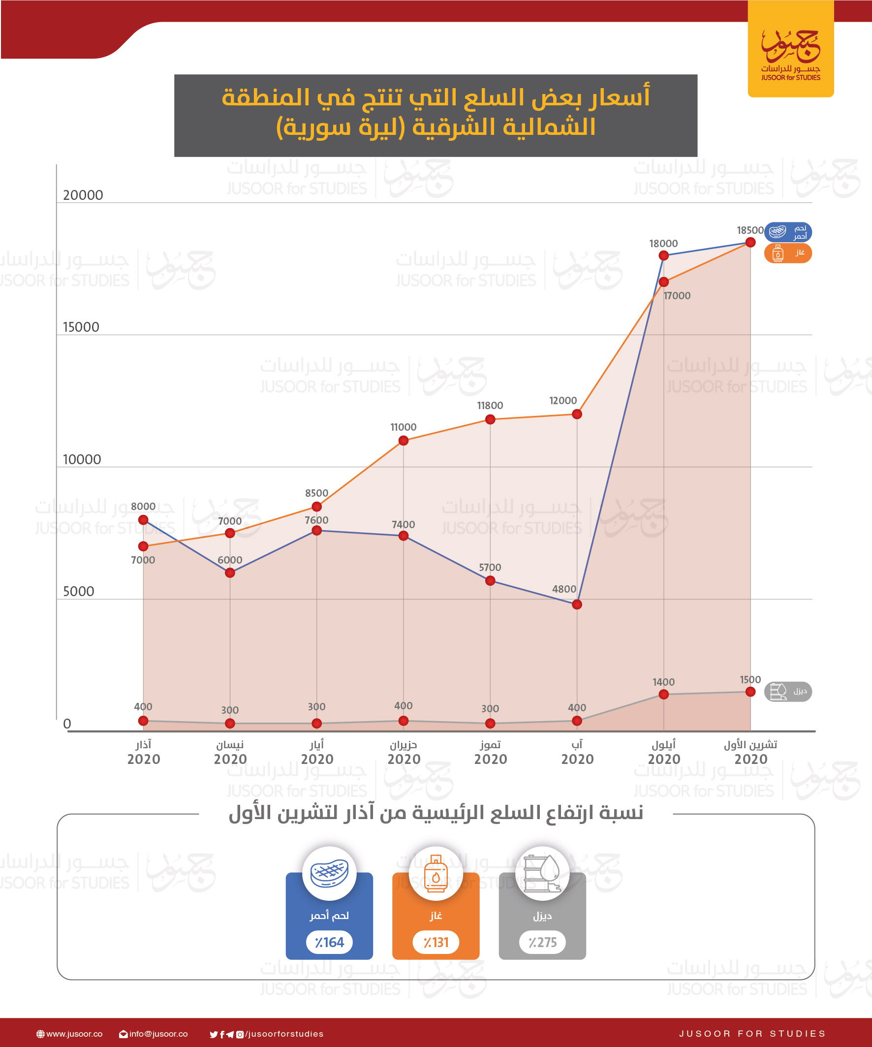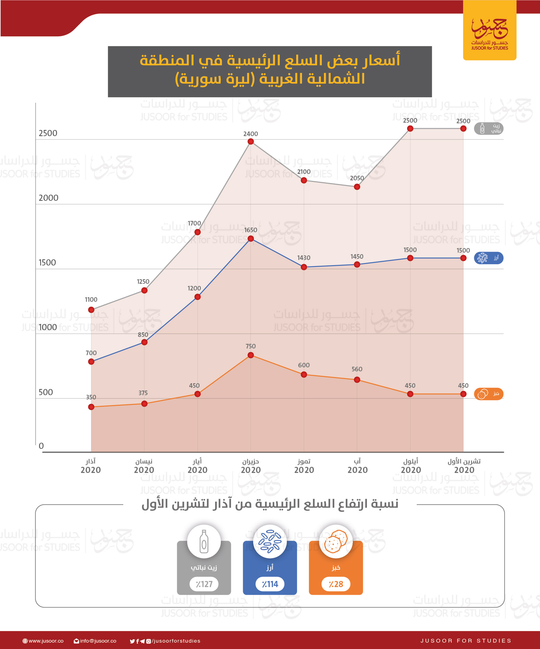 بات الوضع المعيشي في شمال سورية أكثر تردياً في الربع الأخير من عام 2020، حيث أن انخفاض سعر صرف الليرة السورية أثر بشكل جوهري على أسعار السلع والخدمات، ورغم أن التعامل بالليرة التركية حسّن قليلاً من الأسعار لصالح انخفاضها بشكل ملحوظ، إلا أن الليرة التركية سرعان ما أخذت هي الأخرى تتعرض لأزمة تمثلت بانخفاض سعرها مقابل الدولار، وبالتالي انعكست على الأسعار، وهذا ما ظهر واضحاً في حالة ادلب وريف حلب، فسعر ربطة الخبز ارتفع من 300 ليرة سورية مطلع 2020 إلى أكثر من 750 ليرة سورية في شهر أيار-مايو ثم انخفضت قليلاً بعد تثبيته أمام سعر الليرة ليعود إلى 400 ليرة تقريباً، كذلك فإن الأرز ارتفع من 650 ليرة للكيلو مطلع 2020 وصل إلى 1600 ليرة في شهر أيار-مايو، واستقر في تشرين الثاني-نوفمبر عند 1500 ليرة تقريباً.