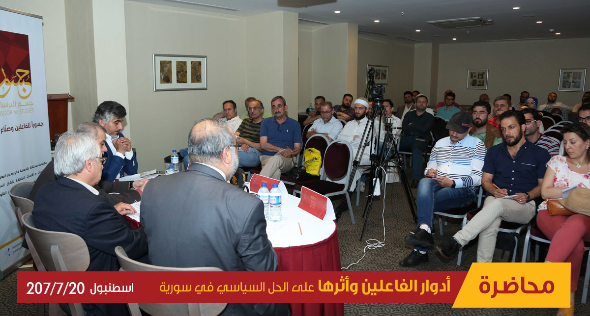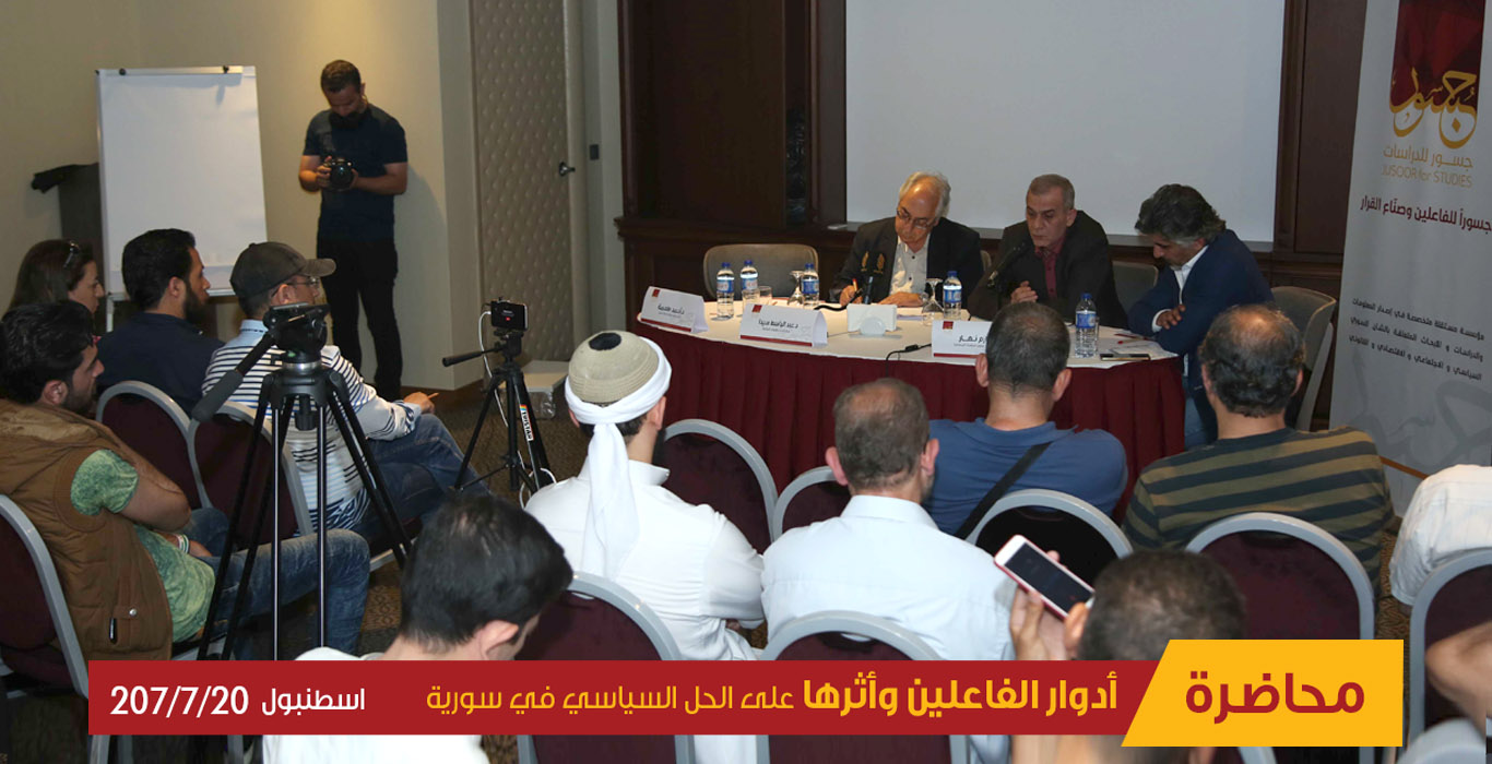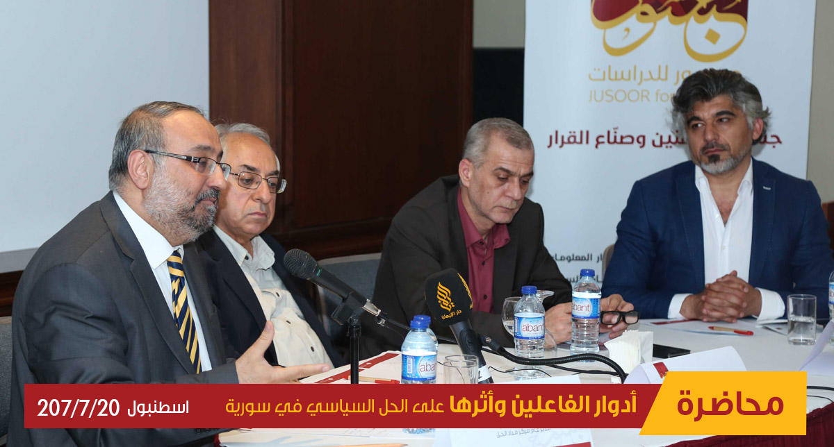 في ظل الأحداث والتحديات الجسام التي تواجهها سورية منذ انطلاقة ثورة آذار 2011، وفي خضم واقع أليم فُرض على سورية جعلها ساحة للصراع الدولي والاقليمي ومعركة لبسط النفوذ، بات من الحاجة الملحة بمكان البحث عن الأدوار الفاعلة الحقيقية القادرة على دفع القضية السورية إلى الواجهة لإيجاد حل سياسي يخرج سورية من أزمتها العميقة. وعليه، نظم مركز جسور للدراسات ندوة بعنوان "أدوار الفاعلين وأثرها على الحل السياسي في سورية" في اسطنبول في 20/ 07/ 2017.