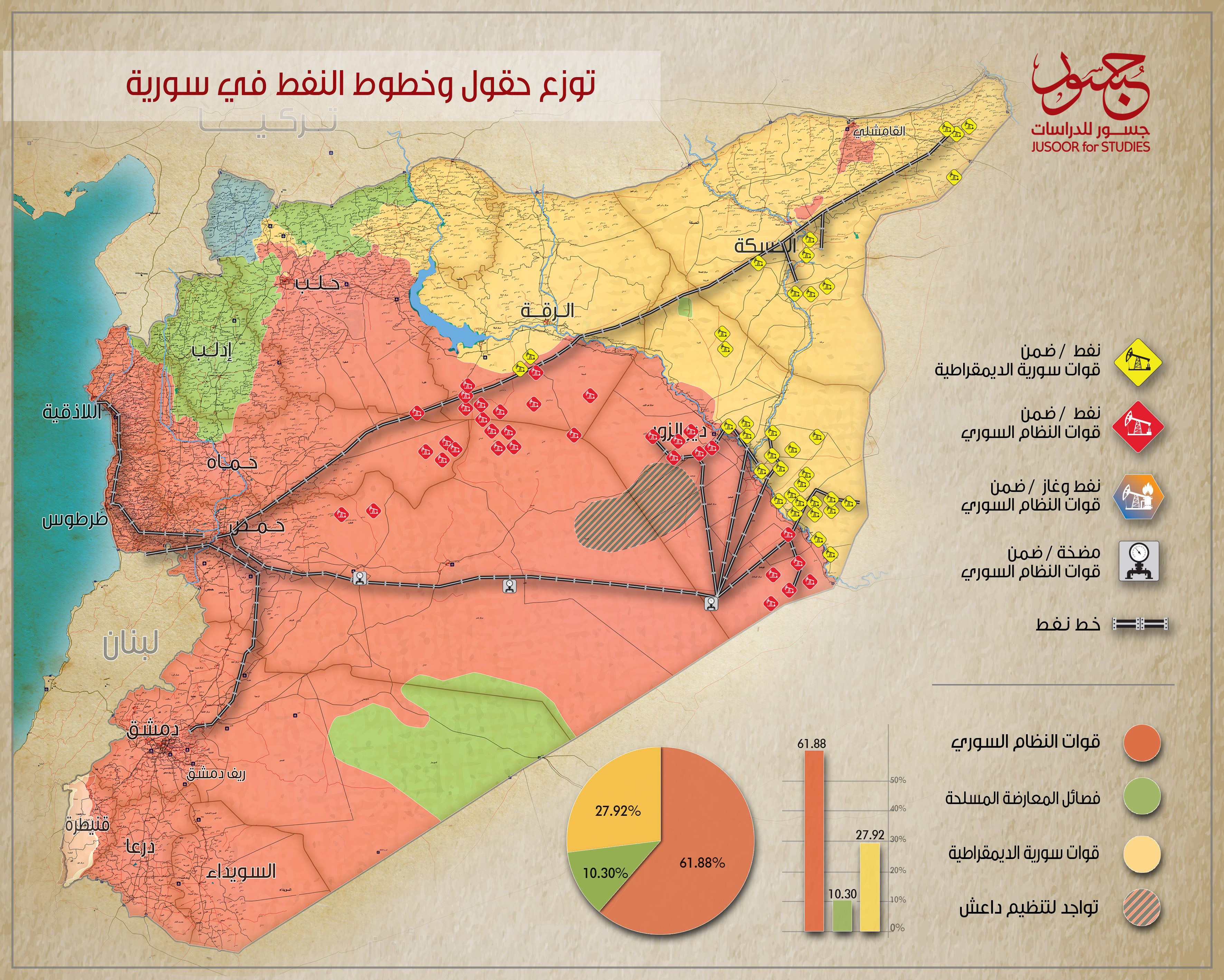 نتيجة الصراع الحاصل في سورية خرجت مناطق مختلفة من يد النظام، بما فيها مناطق النفط والغاز الأغنى في سورية، وقد سيطرت داعش على معظم هذه الأراضي لعدة سنوات، إلا أنها ظلت ملتزمة بتقديم النفط والغاز لصالح الأسد، وأعطت حق إدارة هذه المؤسسات لمهندسي الأسد الذين بقوا حتى لحظات متأخرة في أماكنهم يتقاضون راتباً من النظام وآخر من داعش ( 9 ) ، مع هذا لم تبقَ الحقول بنفس قدرتها الانتاجية السابقة، ولم تتجه كل المخرجات الإنتاجية نحو النظام فقط.