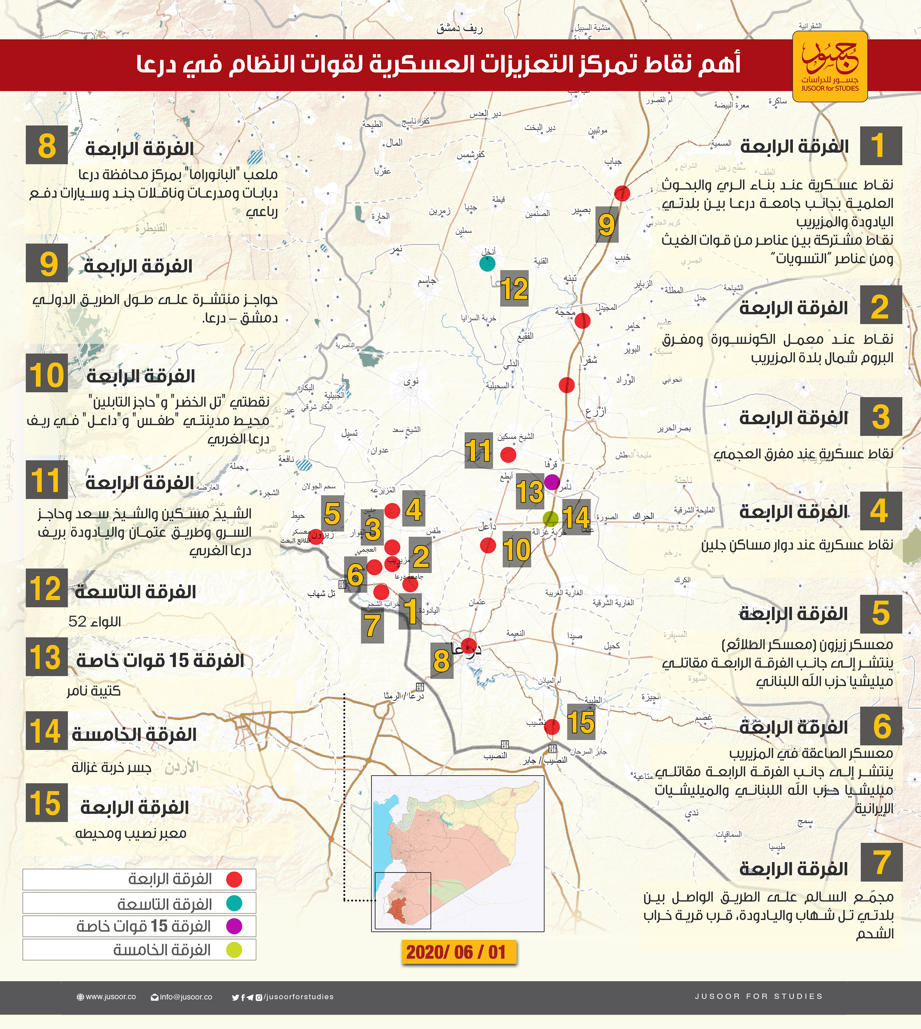 تظهر هذه الخريطة النقاط التي عززتها قوات النظام السوري في محافظة درعا خلال شهر أيار / مايو 2020. الملاحظ أن غالبية نقاط الانتشار الجديدة تركزت في القسم الغربي للمحافظة، التي تعتبر تحت سلطة أبناءها المنتسبين سابقاً إلى فصائل المعارضة السورية المسلحة، كما أن النظام اعتمد بشكل أساسي على الفرقة الرابعة باستقدام قوات الدعم لدرعا.