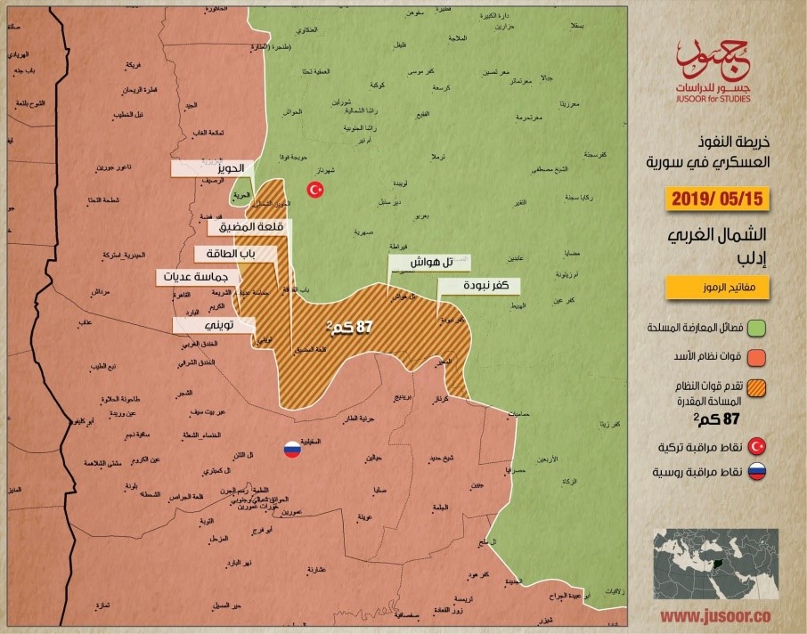 أطلقت روسيا والنظام السوري في 2 أيار/مايو 2019 حملة برية للتوغل في ريف حماة الشمالي والغربي. وجاءت الحملة بالتوازي مع قصف جوي واسع بدأته طائرات النظام والطائرات الروسية قبل أيام من الحملة البرية.
