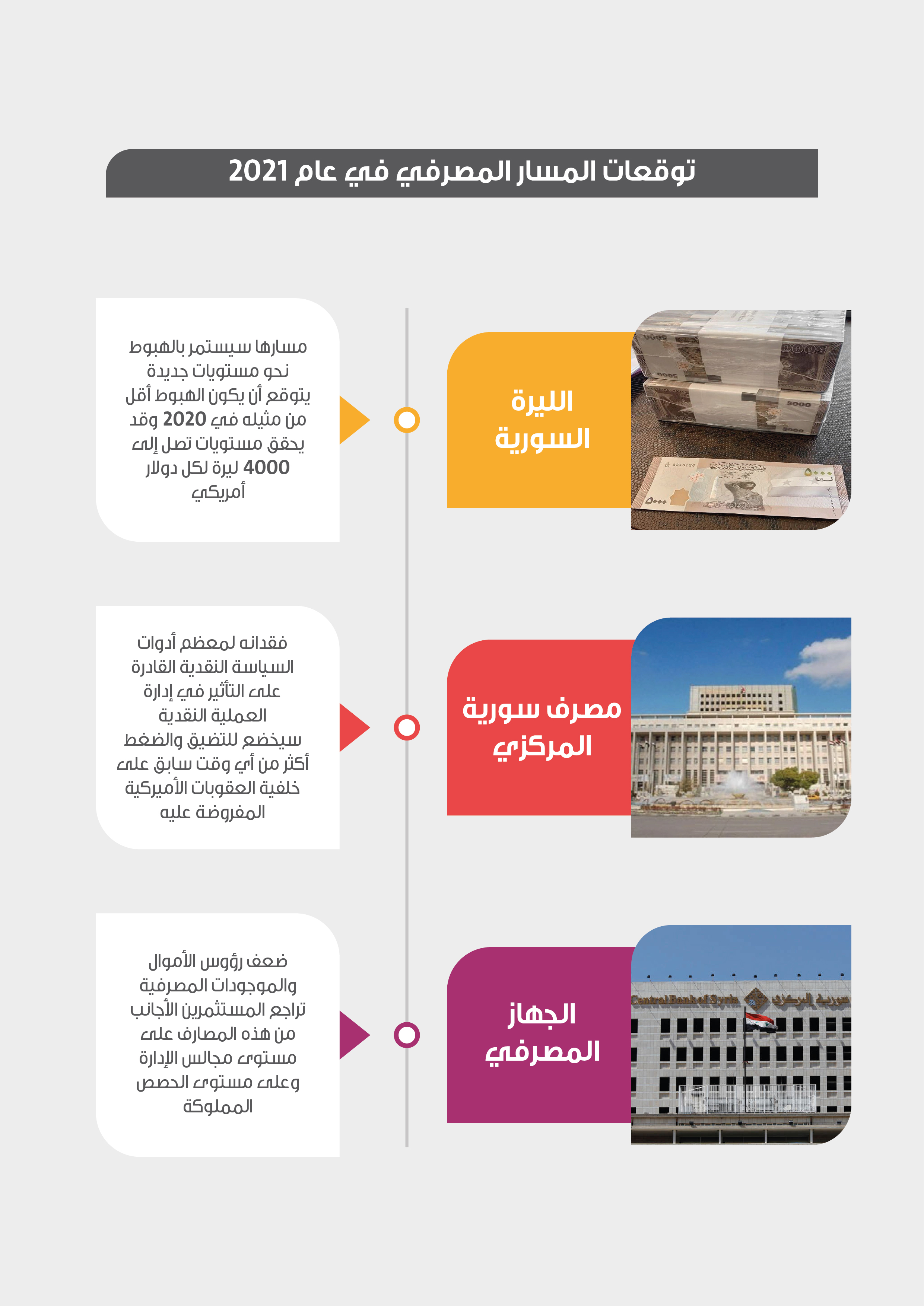 • مسار سعر صرف الليرة السورية أمام العملات الأجنبية سيستمر بالهبوط ولن يكون ثابتاً بأي حال من الأحوال، وقد نشهد انخفاضات متتابعة بنسب صغيرة جداً، مع احتمالية عالية لهبوط أو اثنين بشكل كبير ومفاجئ خلال العام.