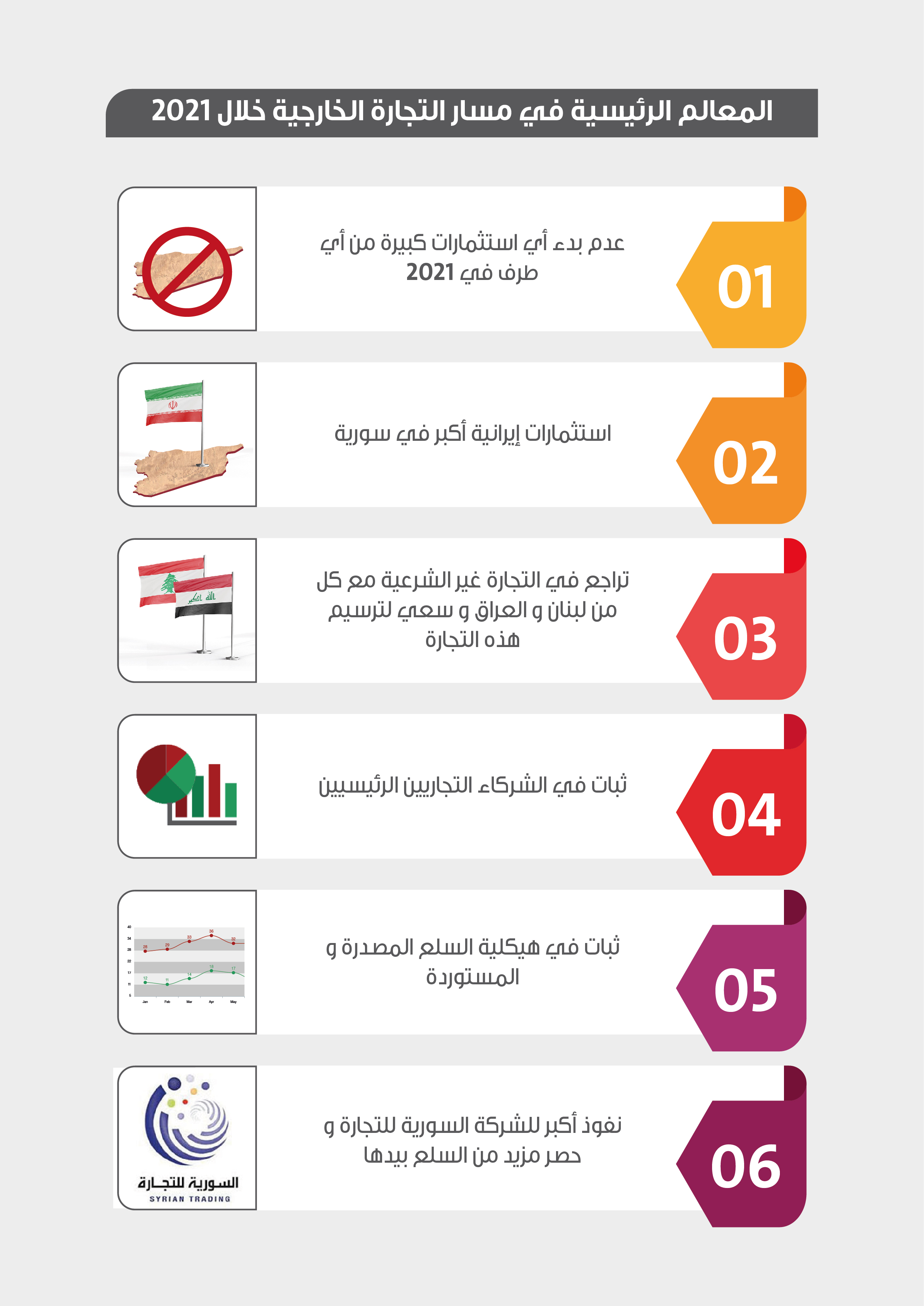 ورغم أن الإحصاءات التجارية مع إيران ستغيب بشكل كبير كما هي عادة السنوات السابقة، إلا أن توقعاتنا أن تحافظ مناطق سيطرة النظام على علاقات تجارية قوية مع إيران خاصة في مجال الغذائيات المصنعة والسجائر.