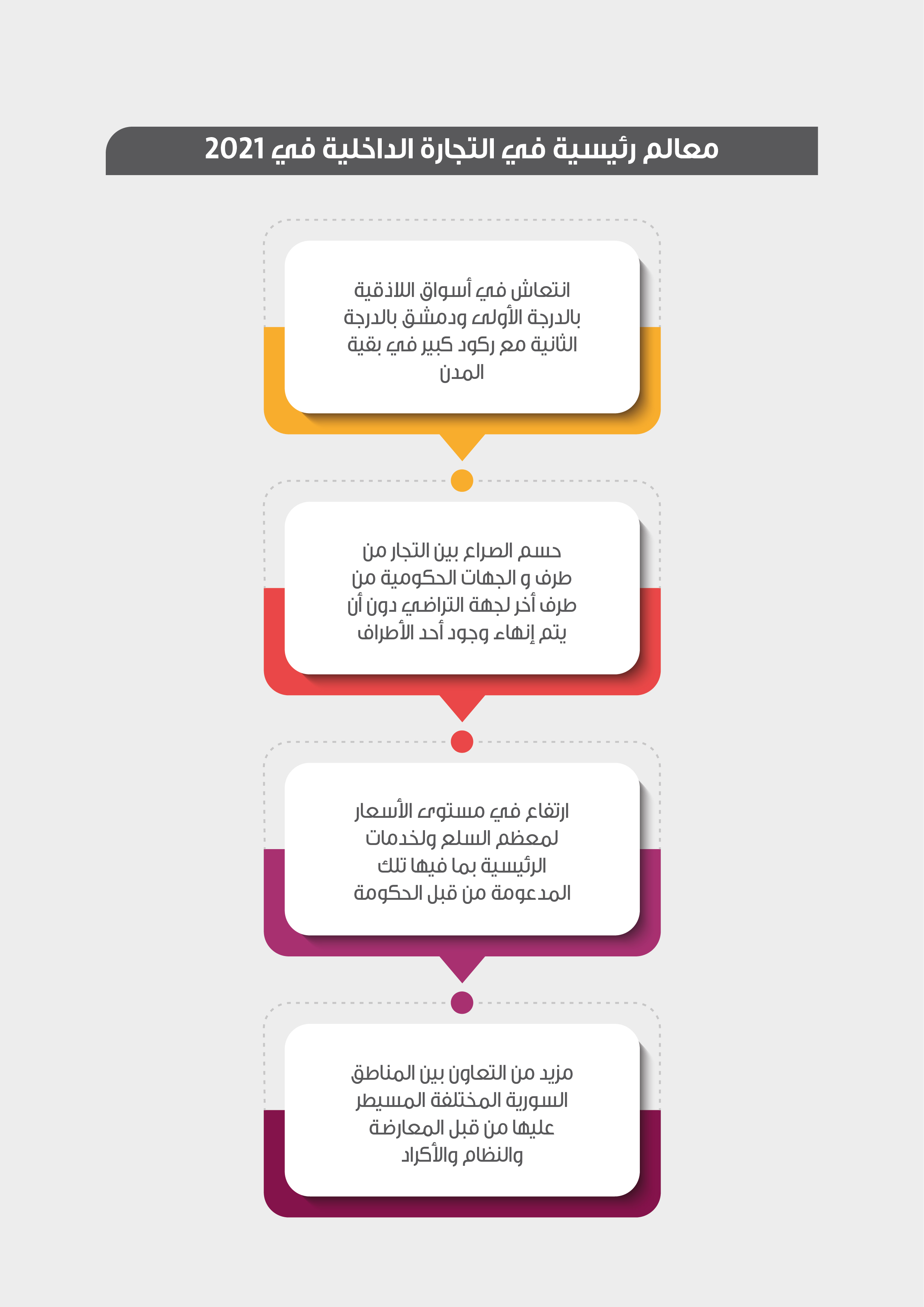الأسواق المنتعشة حالياً في معظمها هي أسواق ساحلية، وستستمر هذه الأسواق في 2021 في تحقيق مزيد من النشاط، خاصة في ظل إهمال الأسواق الأخرى في حمص وحلب وريف دمشق، وستعمل "المؤسسة السورية للتجارة" على ضم مزيد من السلع لبطاقتها الذكية، وتوسيع سلة منتجاتها، وقد تطرح سيارات وسلع رفاهية؛ كالأجهزة الكمبيوترية أو الجوالات وغيرها لتحصيل موارد للخزينة وحصر الموارد في يد الحكومة، ويتوقع أن تزيد الشركة من عدد صالاتها تباعاً وبشكل ملحوظ في 2021.