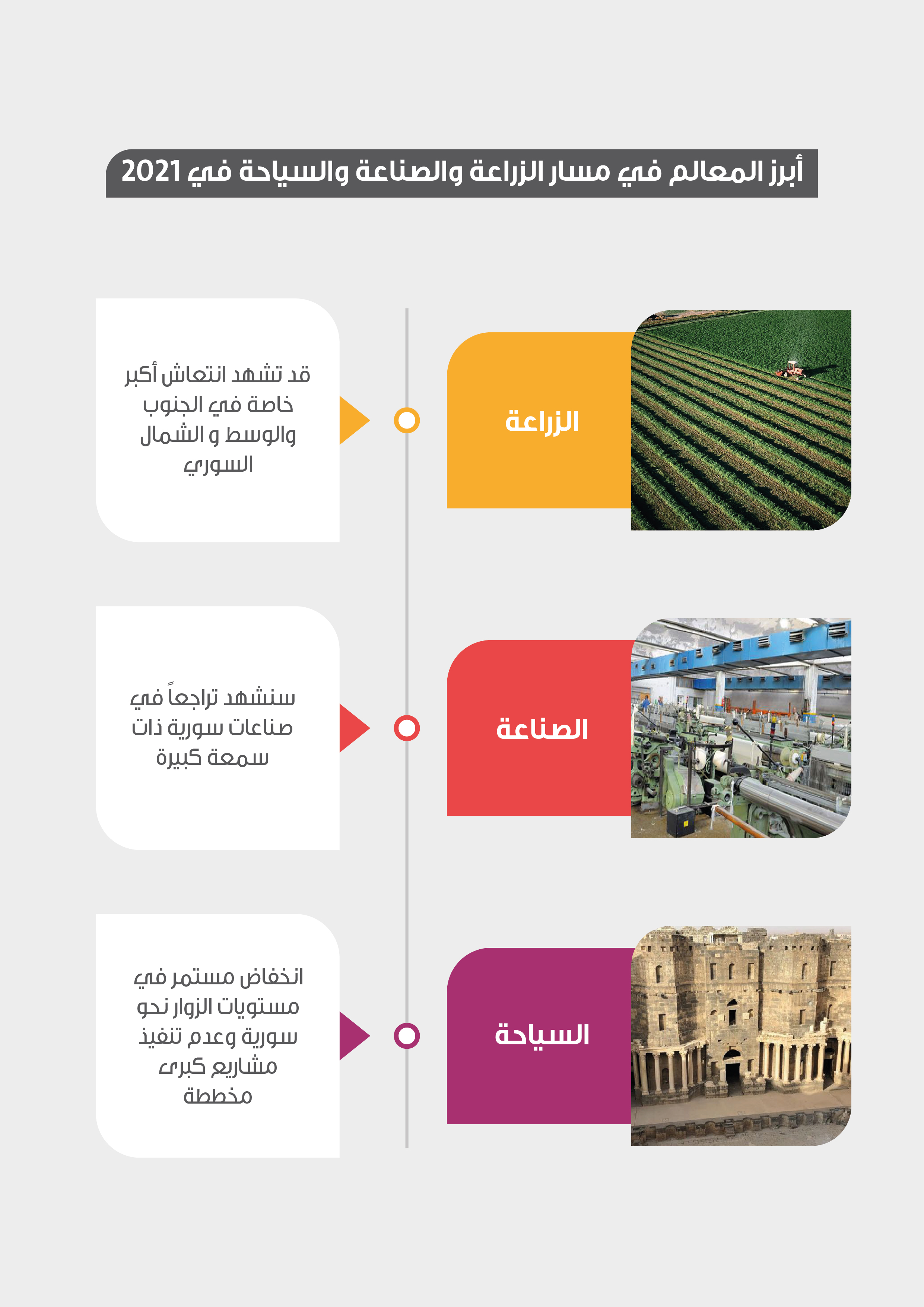 كذلك قد نلاحظ ارتفاعاً في مساهمة الزراعة في الناتج المحلي الإجمالي للبلاد على خلفية انتعاشها المتوقع، وانخفاض بنفس المستويات السابقة لكل من الصناعة والسياحة، مع زيادة في نسب التحويلات من الخارج إلى داخل سورية، وهو ما سيسهم في زيادة الناتج بشكل عام وتحسين جزئي لمستوى المعيشة، حيث أن التضامن يتوقع أن يكون أكبر من الأفراد السوريين الذين يعيشون في الخارج ولهم أقارب أو معارف في الداخل السوري.