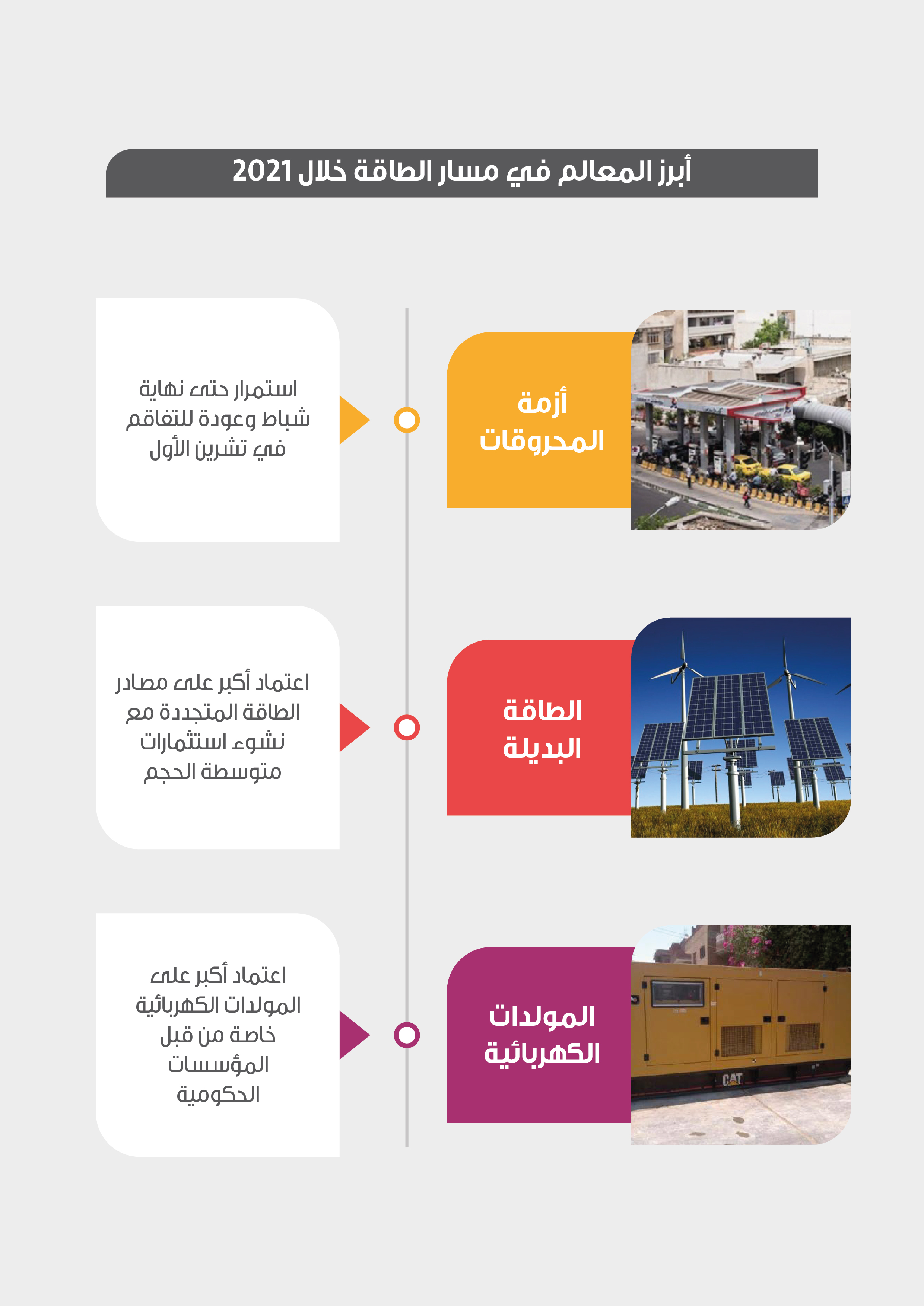 هناك توجه واضح ربما يثمر في 2021 وهو الاعتماد على الطاقة البديلة، من طاقة شمسية وطاقة رياح، حيث دخلت ولا تزال تدخل إلى السوق السورية عدد من الشركات المتوسطة من حيث رأس المال في هذا المجال، ويمكن أن يقدم هؤلاء مشاريع جيدة في هذا الإطار.