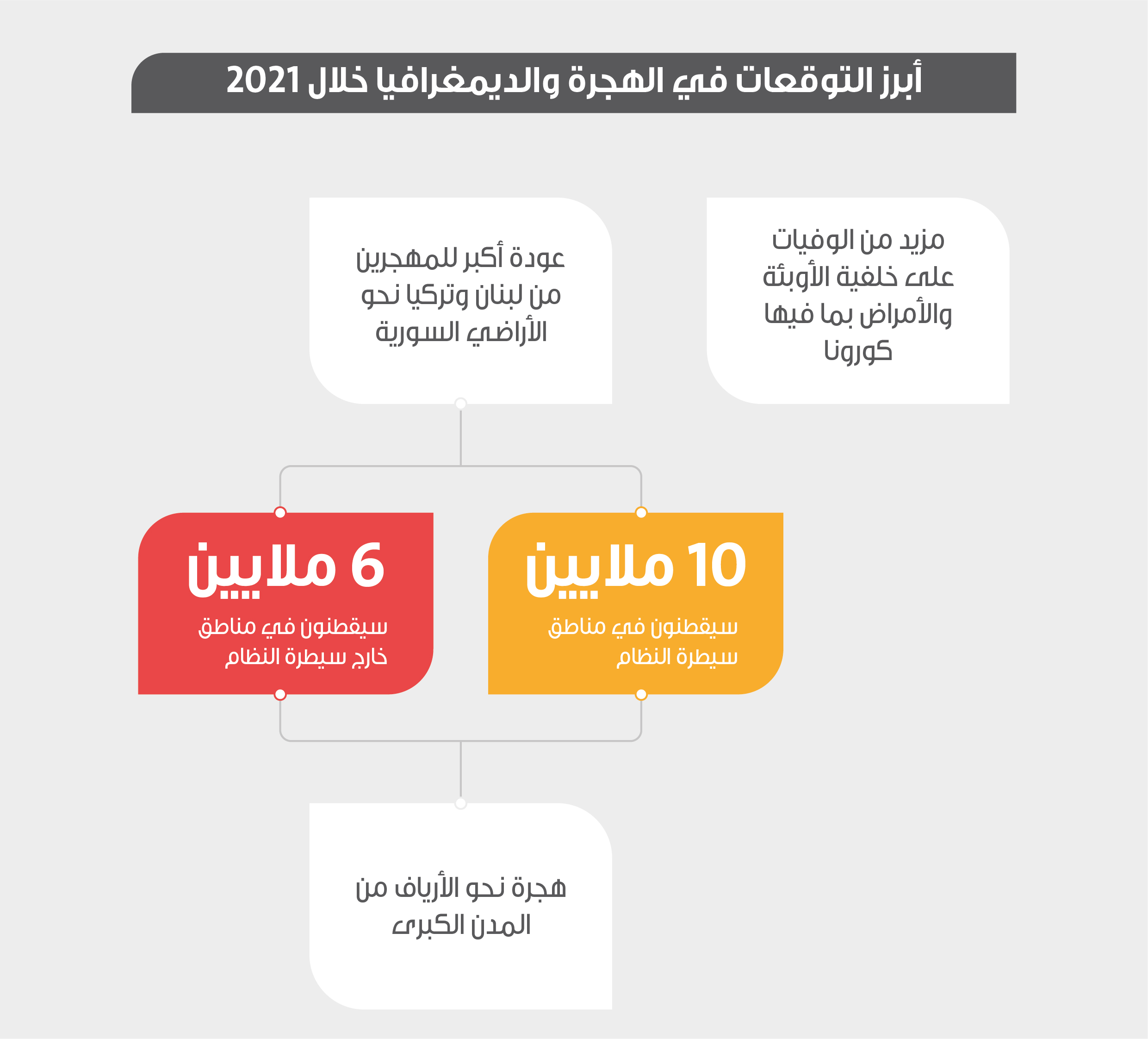 ولا يُعتقد أن هذه التركيبة سيطرأ عليها تغييرات كبيرة في 2021، إلاّ في إطار المتواجدين في لبنان الذين سيستمر عددهم بالتناقص نتيجة للظروف الطاردة في البلاد، حيث سيعود بعضهم لمناطق النظام والبعض الآخر سيحاول الوصول لمناطق الشمال السوري، كما أن توقعات دخول مزيد من السكان السوريين من تركيا نحو الشمال السوري قائمة، حيث يتوقع أن يدخل ما يزيد عن 400 ألف نسمة خلال 2021، وهو عدد غير مسبوق في سنة واحدة.