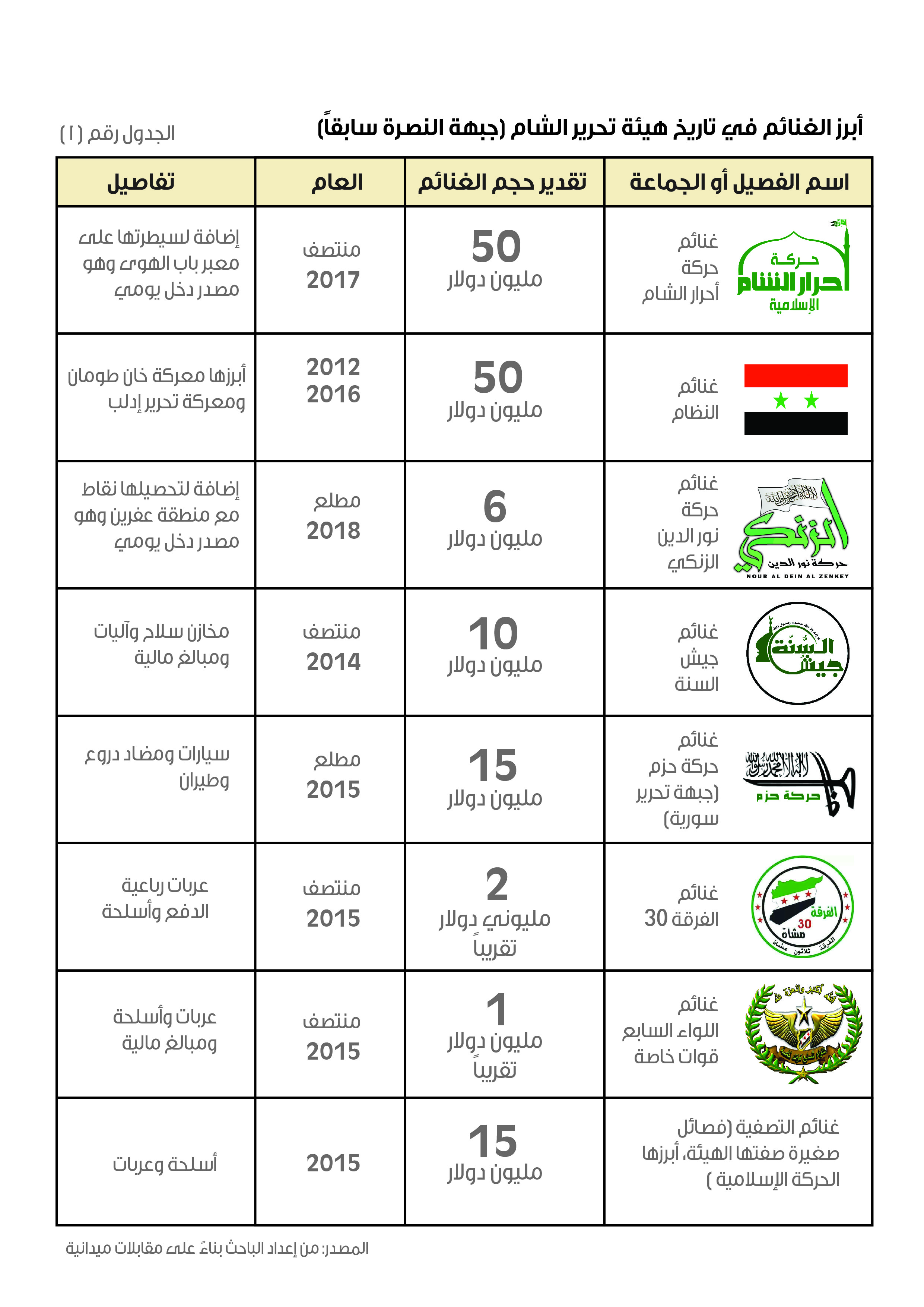 ويمثل هذا التصريح جانباً من الحقيقة. فتمويل الهيئة يأتي بالدرجة الأولى من "الغنائم" التي تأتي من معاركها مع "الآخر"؛ سواءً أكان النظام أو داعش أو الفصائل المعارضة (انظر الجدول رقم -1-)، ففي معركتها نهاية عام 2017 وبداية 2018 مع حركة نور الدين الزنكي، اتبعت الهيئة تكتيكاً يقضي بأن تكون نصف الغنائم للمقاتل والنصف الآخر للفصيل(17) ، الأمر الذي أكسب الهيئة مشاركة جيدة من عدد كبير من مقاتليها ومقاتلين آخرين انضموا إليها طمعاً في هذه المكاسب، وحققوا تقدمات في مناطق عدة.
