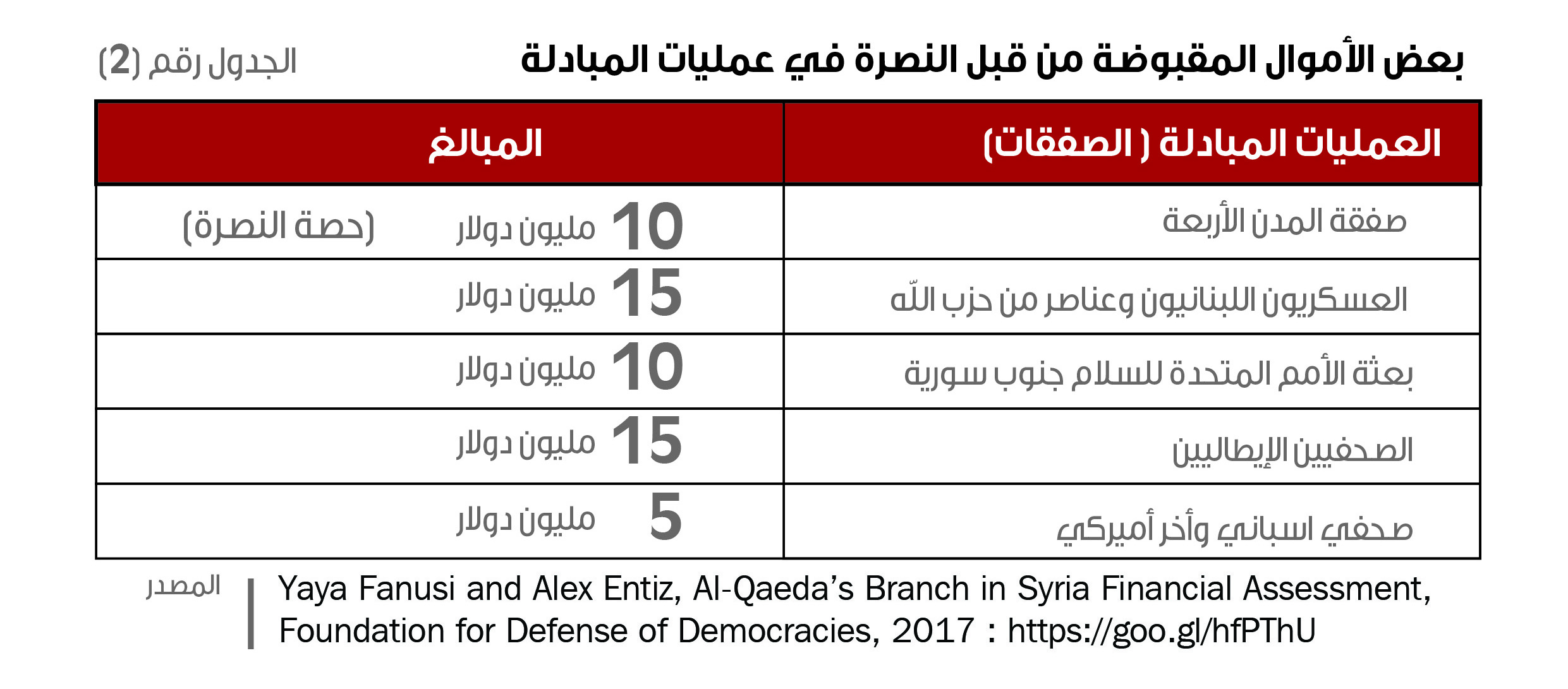 اعتمدت هيئة تحرير الشام في جانب من تمويلها على عمليات مبادلة الأسرى والجثث (انظر الجدول رقم -2-). وتأتي اتفاقية المدن الأربعة على رأس الصفقات الأكبر والأضخم، والتي كانت الهيئة أحد أطرافها والإفراج عن طيار سوري ورهائن من النظام، وتلقت الهيئة خلالها مبالغ مالية كبيرة بملايين الدولارات لم يجرِ الكشف عنها، وكذلك صفقة العسكريين اللبنانيين التي تم دفع مبالغ مالية لا تقل عن خمسة عشر مليون دولار من طرف الحكومة اللبنانية، كما تلقت الهيئة مبلغاً مماثلاً من عملية مبادلة رهائن إيطاليين من الحكومة الإيطالية، إضافة لمبالغ أخرى مقابل صحفيين أجانب وجثث قتلى لحزب الله وإيران، وغيرها من عمليات المبادلة.