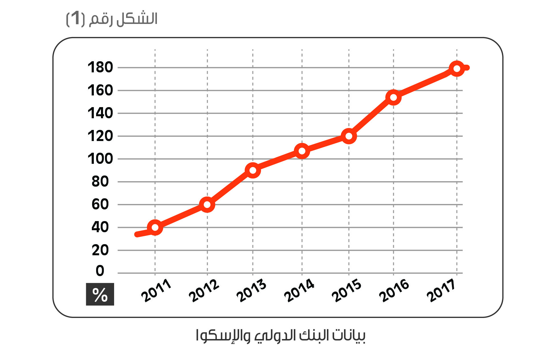 ويُقدّر البنك الدولي ومنظمة غرب أسيا الدين العام السوري بأكثر من مائة وخمسين بالمائة من الناتج المحلي السوري في عام 2017، وهي نسبة تقارب ما كان عليه في تسعينيات القرن الماضي، ويقدر باحثون أخرون الدين العام السوري بأكثر من ذلك بكثير(12) ، وهذا ربما يكون صحيحاً من جهة النفقات العسكرية الإيرانية والروسية والتي لا يتم احتسابها كمبالغ على الحكومة الحالية، بل تتحملها حالياً الدول المصدرة لهذه القوى العسكرية، والتي تفكر بشكل أو بآخر بنقل أعباء هذه النفقات إلى سورية عن طريق استثمارات نفطية أو عقارية أو اتصالات (كما في حالة عقد مصفاة النفط الذي تم إرساؤه على شركة إيرانية شرق حمص، وعقد مشغل الهاتف الخلوي الإيراني).
