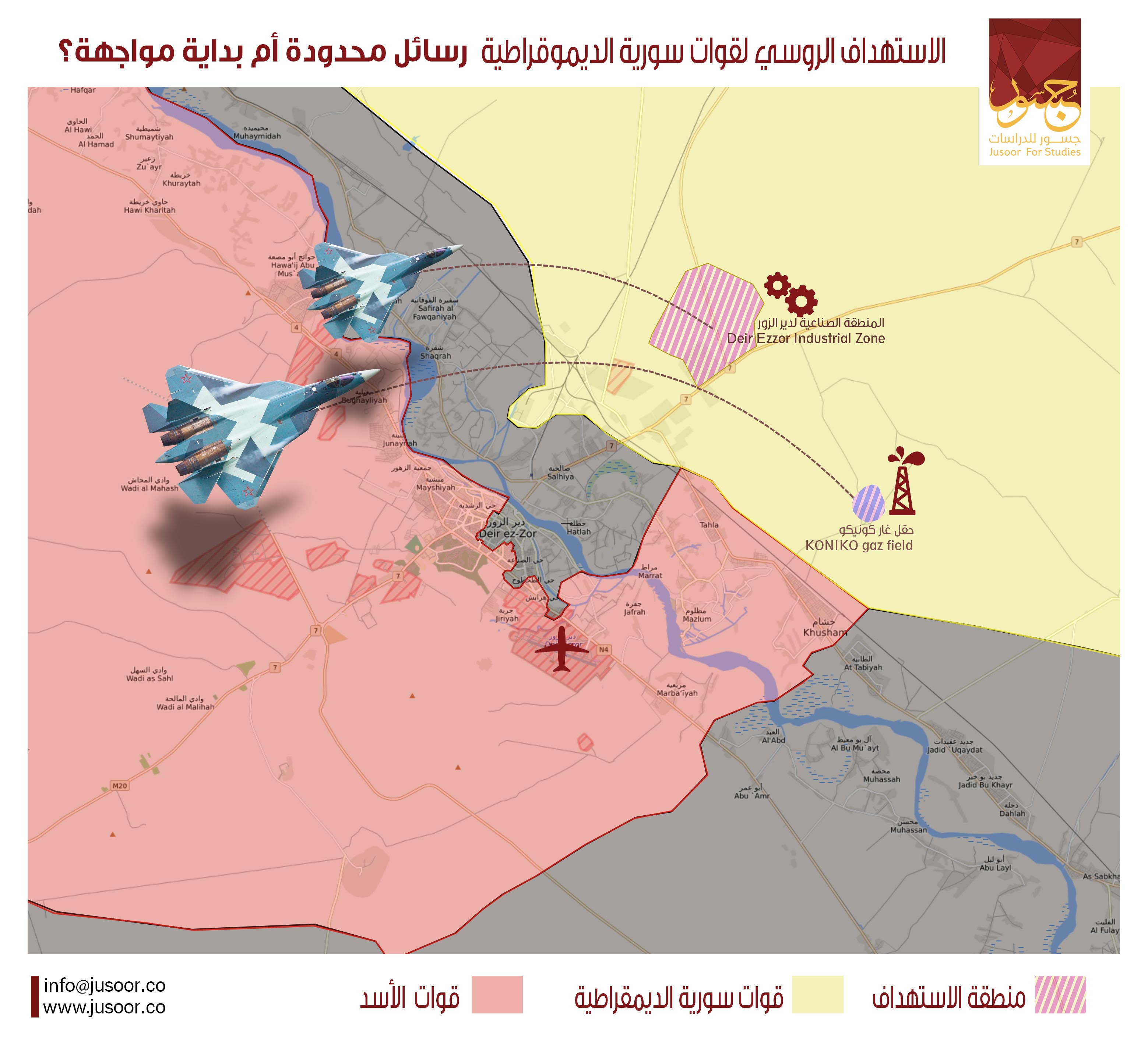 مثّل إطلاق قوات الأسد لمعركتها الخاصة للسيطرة على محافظة دير الزور بداية شهر أيلول/سبتمبر إعلاناً ضمنياً للمحور الذي تقوده روسيا أن محافظة دير الزور والمعركة مع تنظيم داعش هي شأن هذا المحور؛ وأن قوات قسد ليس مرغوباً بها هناك، وأن أي محاولة من الأخيرة لمواصلة الزحف داخل المدينة يعني إشعالاً للصراع المباشر بين الطرفين.