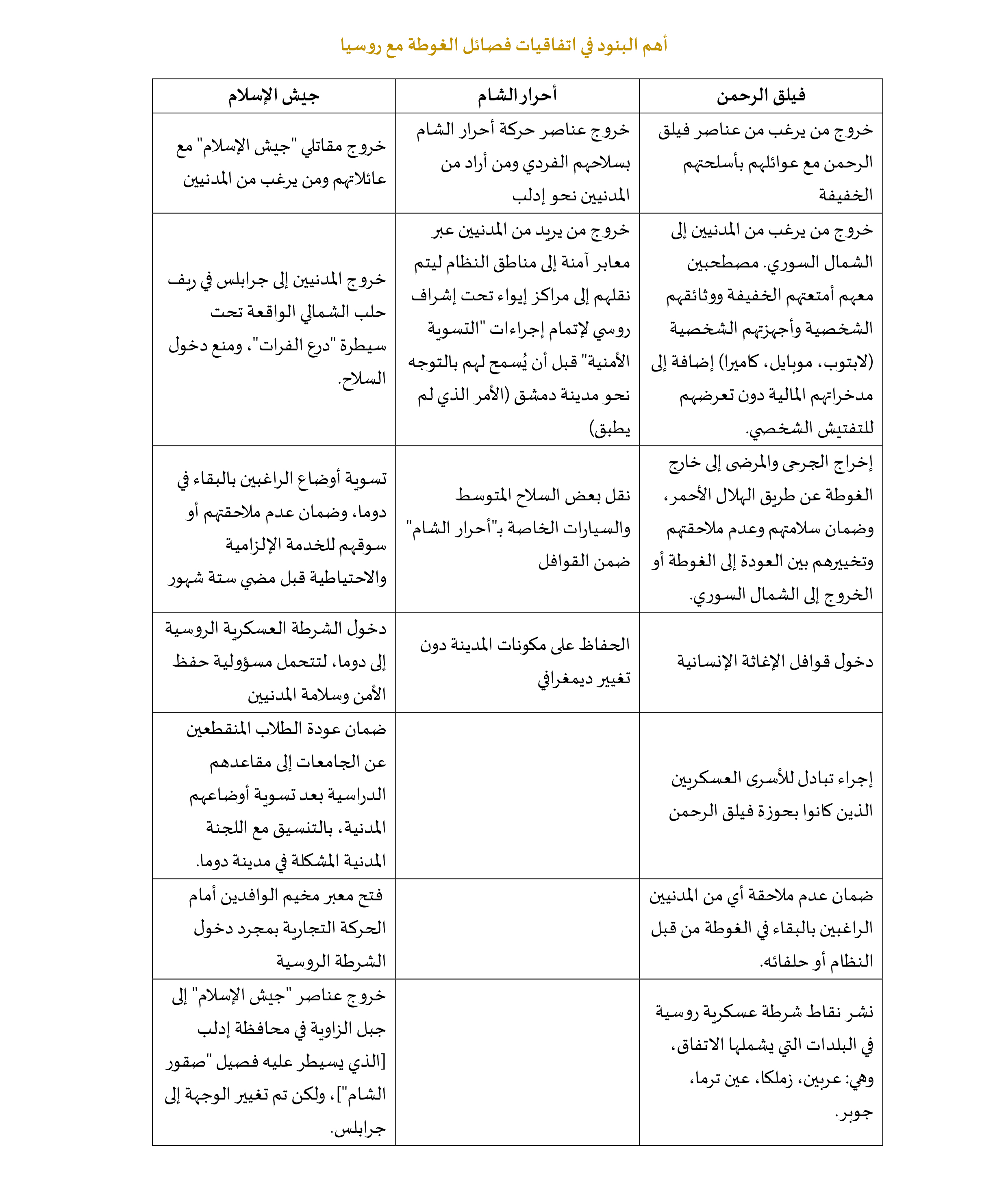 2. أن روسيا الاتحادية هي الطرف المقابل في الاتفاق، وهي الضامن له، دون مشاركة أي جهة أخرى. ويُشير هذا الأمر إلى أن الفصائل لم يكن لديها عملياً أي خيارات أخرى، وأن ضمانة روسيا كانت أفضل الخيارات السيئة المتاحة لها.