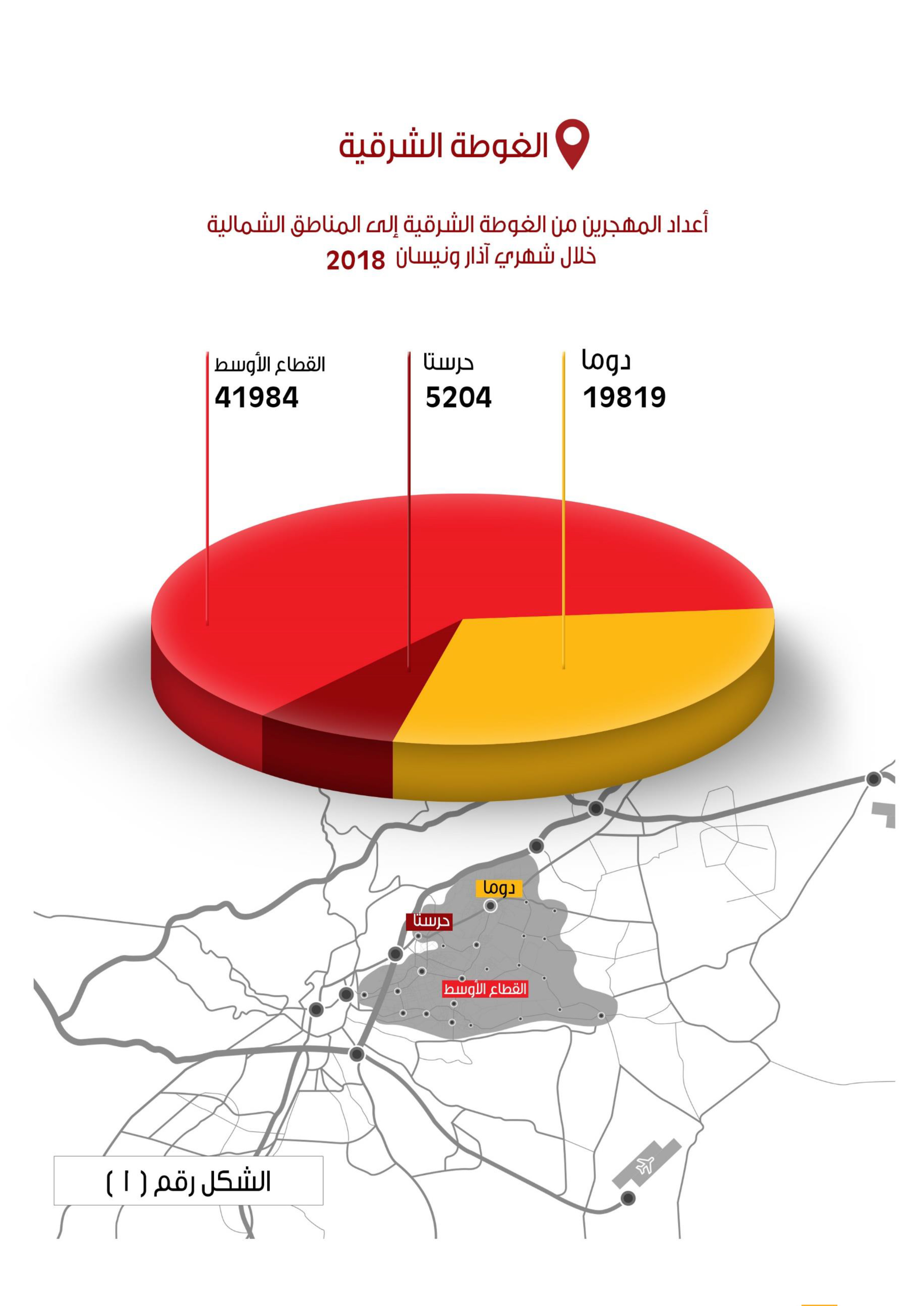 ووفقاً لتقديرات الأمم المتحدة، فقد خرج من الغوطة الشرقية خلال الفترة من 9 آذار/مارس وحتى 18 نيسان/أبريل أكثر من 158 ألف شخص، أي حوالي 40% من سكان الغوطة الشرقية. ووفقاً للتقديرات، فإنّ 92338 منهم توجهوا إلى دمشق وريفها في المناطق الواقعة تحت سيطرة النظام. فيما توجّه الباقون إلى ريف حلب ومحافظة إدلب بناء اتفاقيات التهجير المنظم التي تم توقيعها مع روسيا. ووفقاً لإحصاء مركز جسور للدراسات، فإنّ عدد من توجهوا إلى الشمال يبلغ 66377 شخصاً.