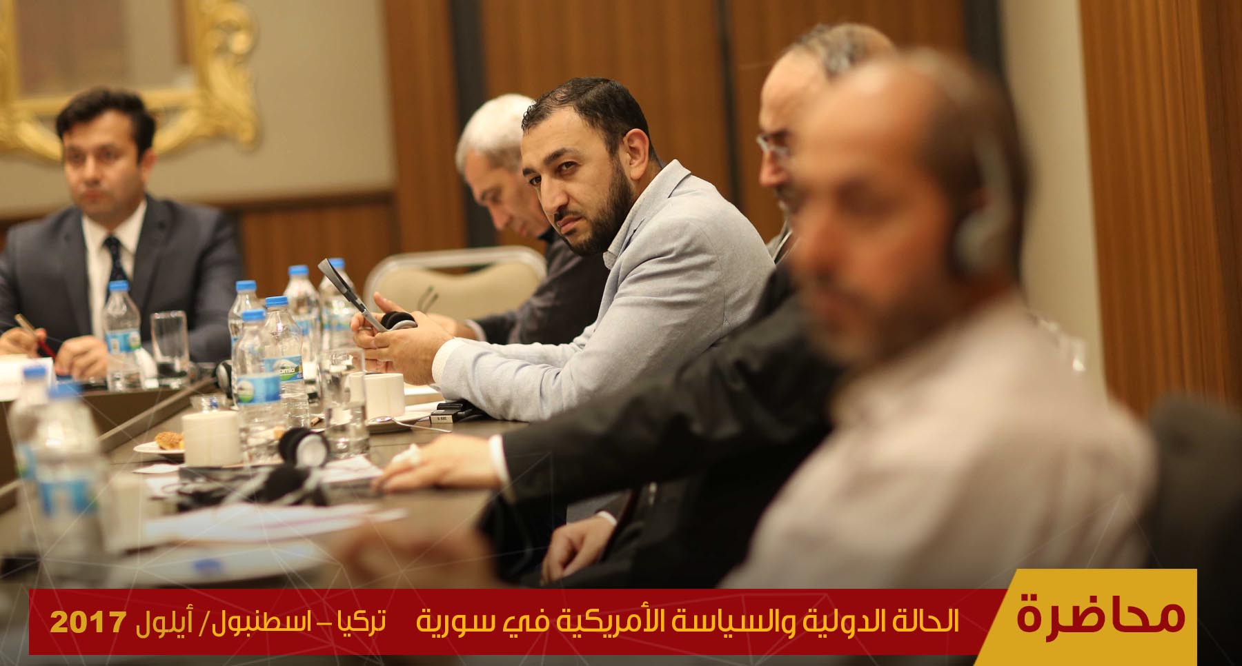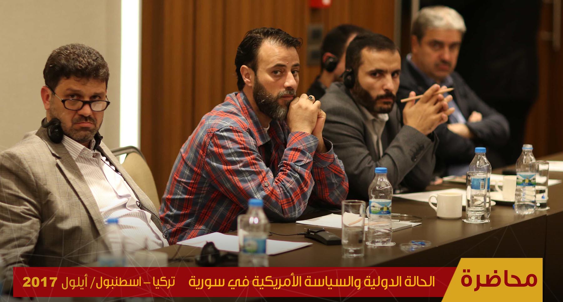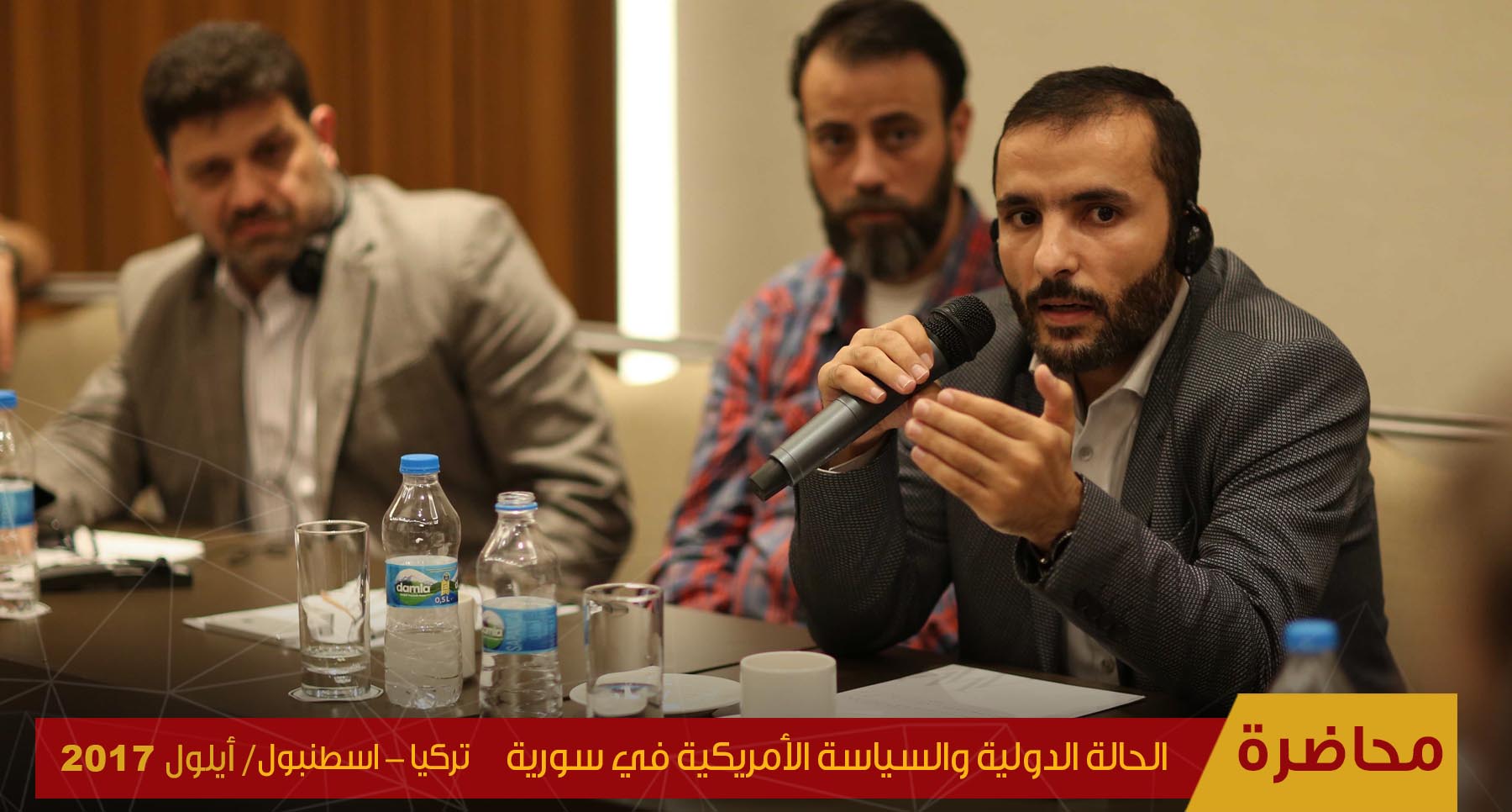 وأوضح أن الموقف الأمريكي تجاه المسألة السورية يتم على مستويين: شعبي يستحضر الصورة النمطية حول الشرقي عموماً في مخيلة الشعب الأمريكي كمسلح متخلف بزي عسكري ذو لحية شعثاء يريد محاربة العالم، فيما يبدو موقف السياسيين الأمريكيين أكثر عمقاً، إذ يقوم على أن سياسة الاحتواء المتعدد هي سيدة الموقف في فترة الرئيس أوباما، وسياسة عدم وجود مسوغات التدخل في الخارج عند الرئيس الحالي ترامب، وأوضح أن الاهتمام بالشأن السوري دائماً ما يقترن ظهوره في أروقة السياسة الأمريكية عند الحديث عن داعش أو عند استخدام السلاح الكيماوي، كما أشار أن دوائر اتخاذ القرار في السياسة الأمريكية تركز في تحركاتها على ملفين اثنين هما: القاعدة والأكراد، وأضاف أن الاهتمام الأمريكي ينصب على مناطق تخفيض التصعيد ومحاربة داعش، وفي سياق التسويق للقضية السورية.