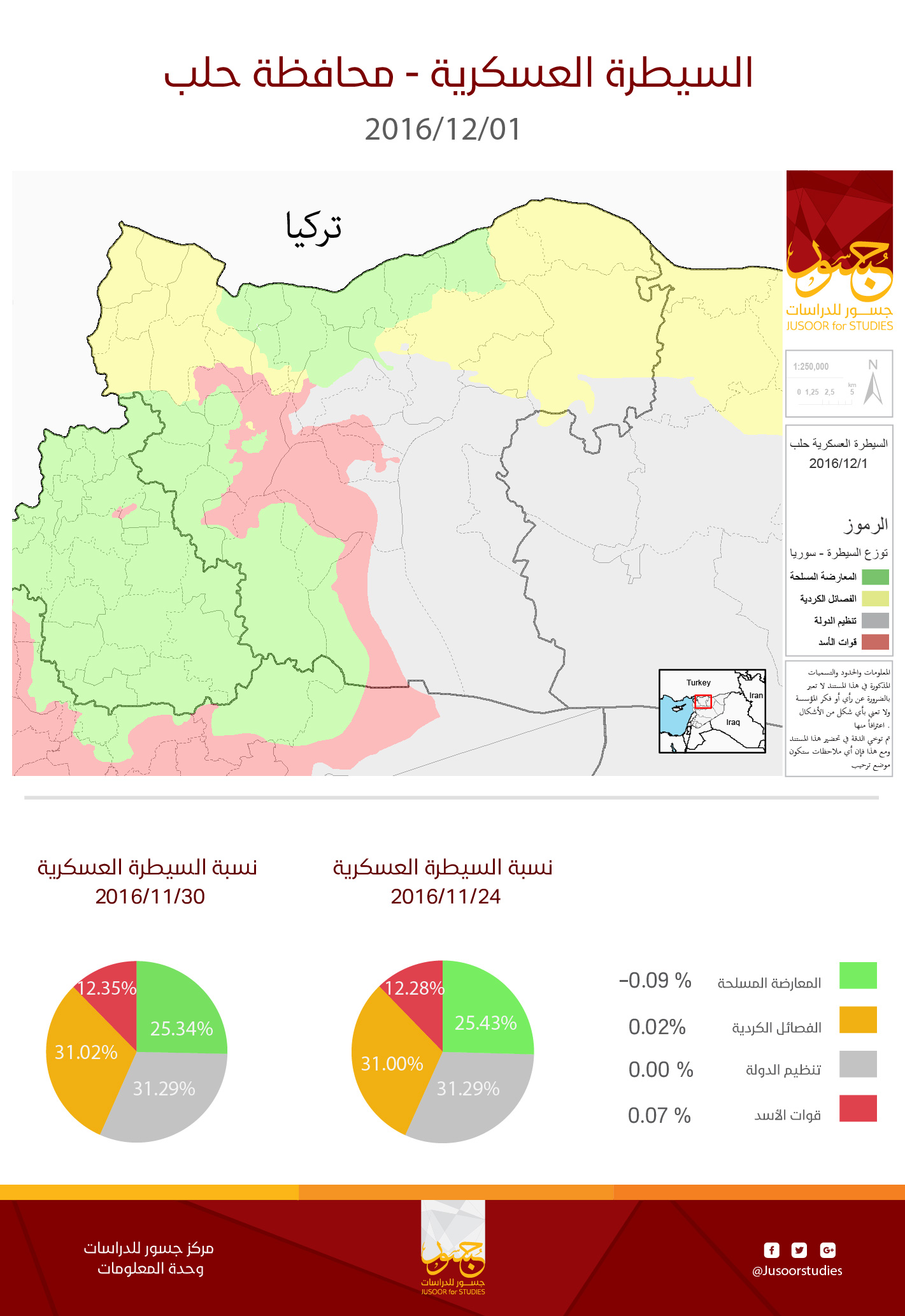 أصدر مركز جسور للدراسات خارطة السيطرة العسكرية على محافظة حلب 01/12/2016