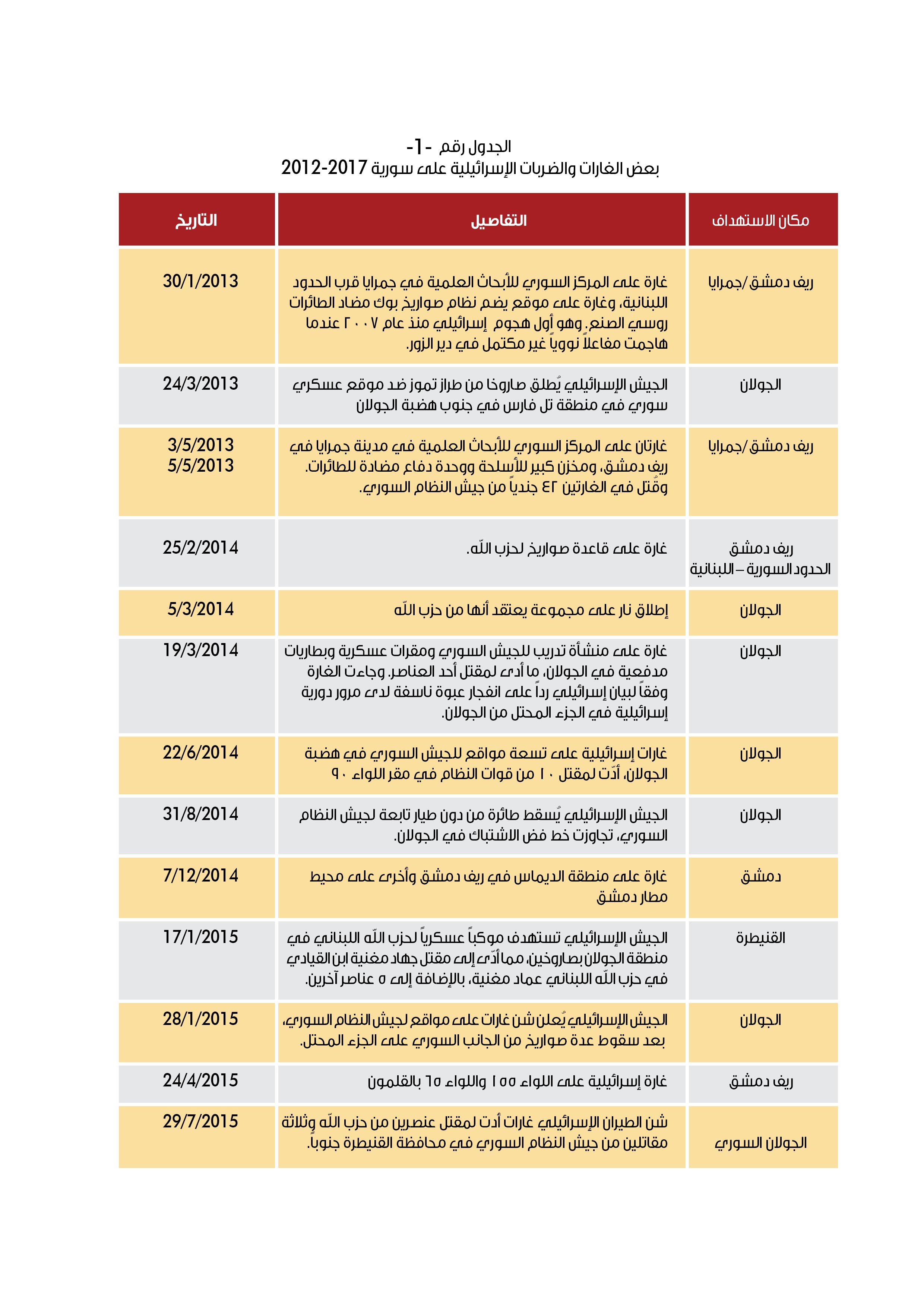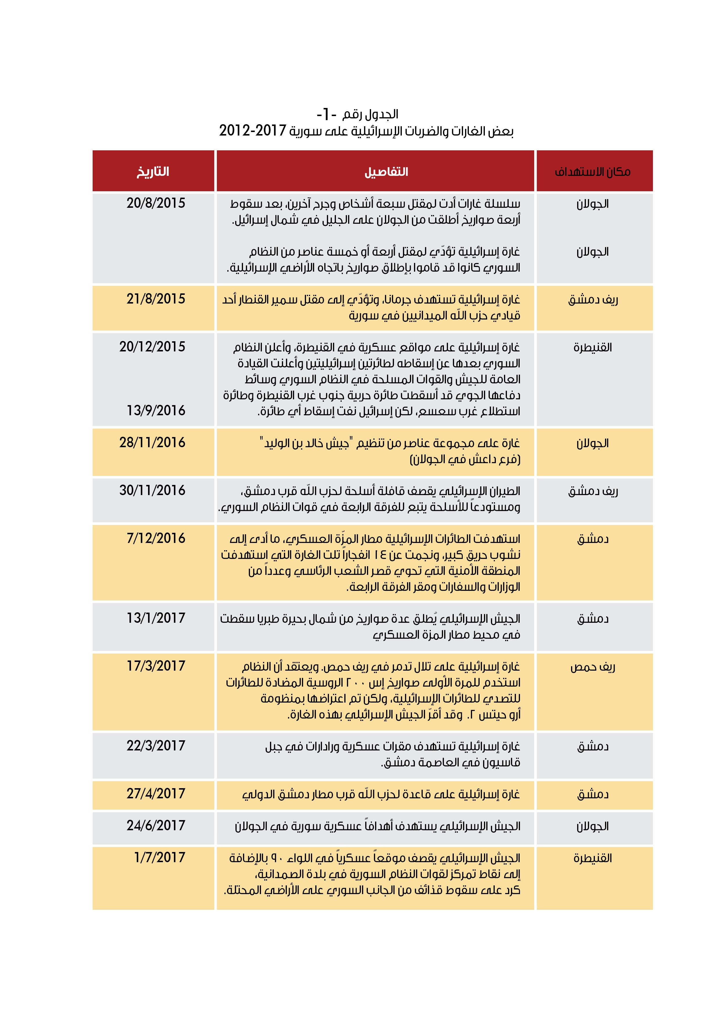 ويلاحظ من الجدول أن 36% من الغارات تركّزت في منطقة الجولان، وهي في الغالب ذات صفة تكتيكية تندرج في إطار قواعد الاشتباك على الحدود بين شطري الجولان السوري.