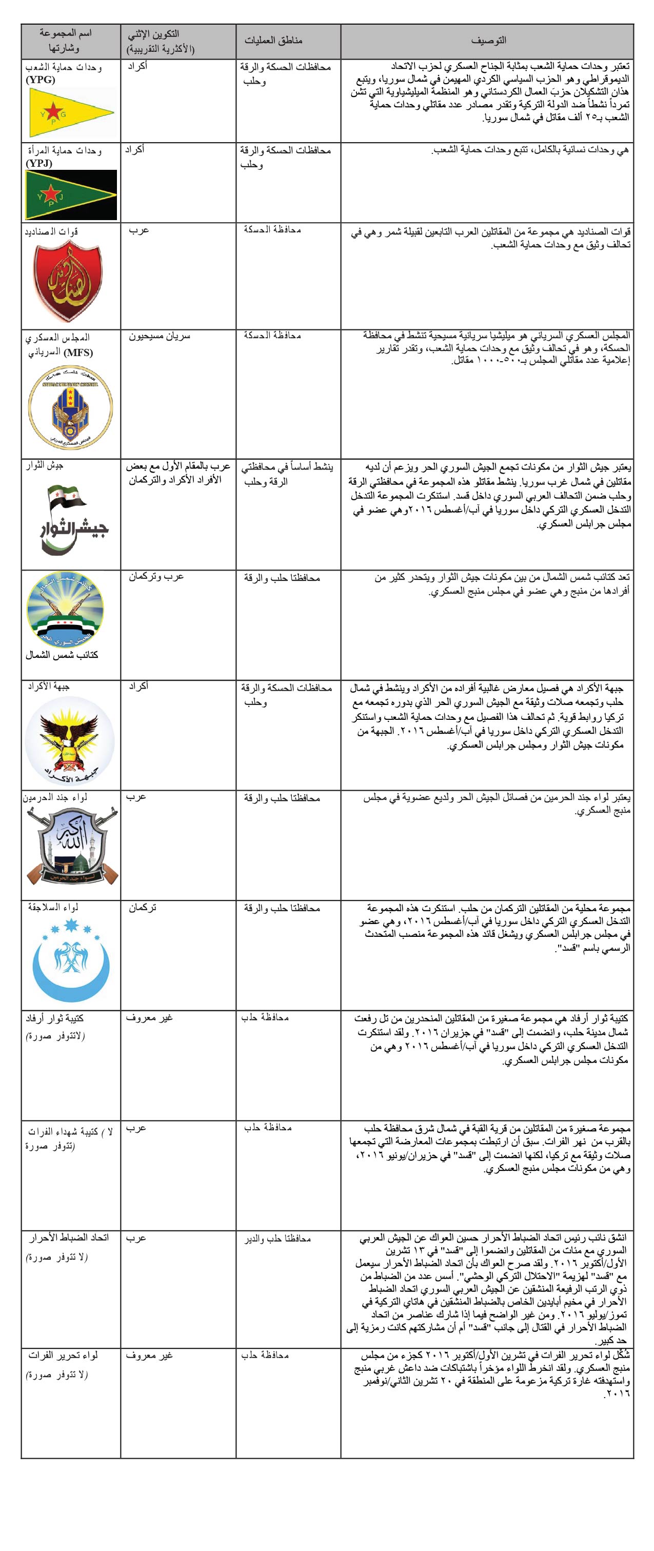 يعرِّف الجدول التالي ببعض أكبر المجموعات داخل "قسد" وأكثرها نفوذاً، مع التنويه بأن هذه القائمة ليست شاملة: