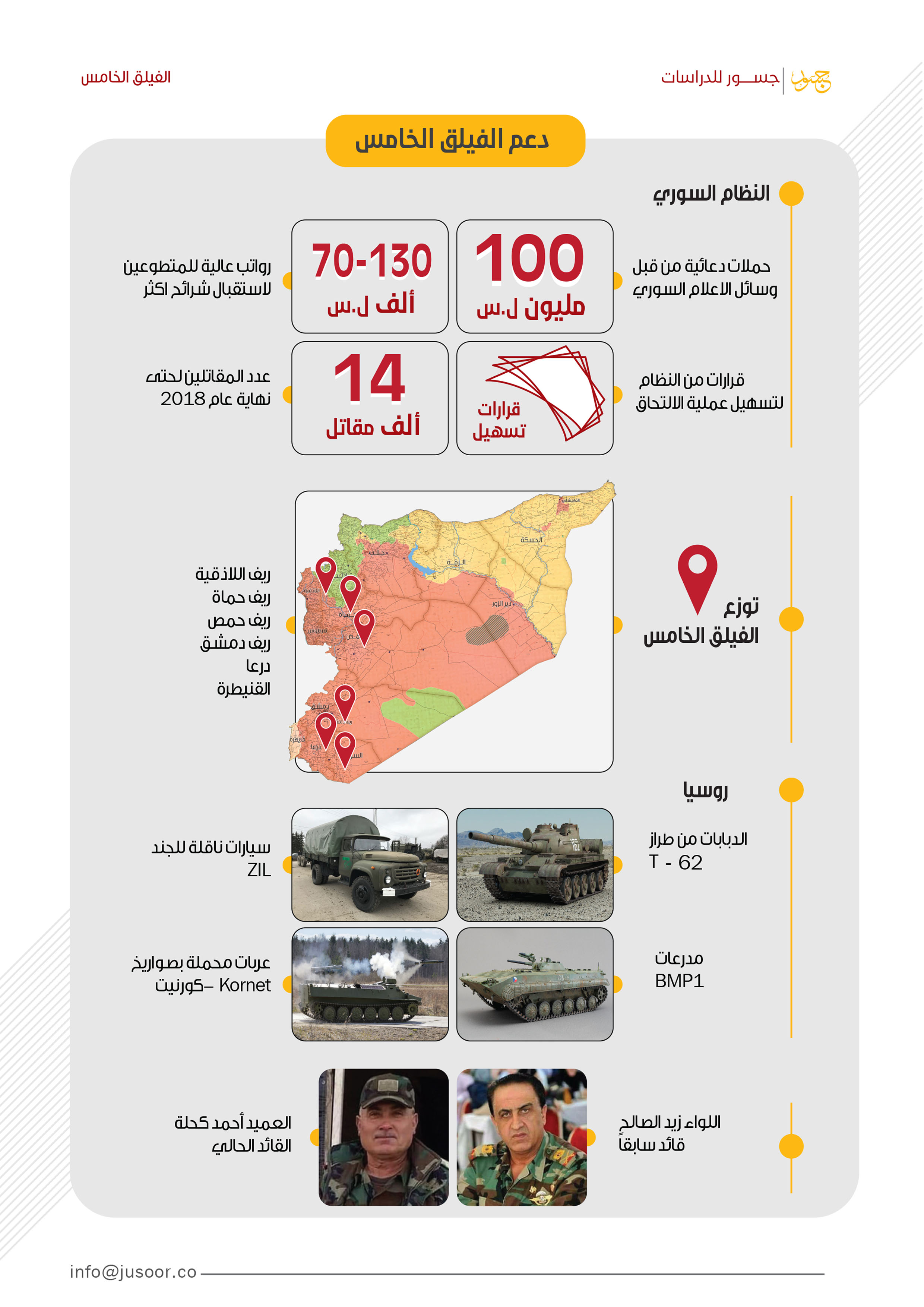 وأصبح الفيلق الخامس منذ تأسيسه الذراع الروسية العسكرية على الأرض، حيث ارتبط مباشرة بقاعدة حميميم، وبات يتحرك بموجب القرار الروسي، وبشكل منفصل عن وزارة الدفاع التابعة للنظام السوري.