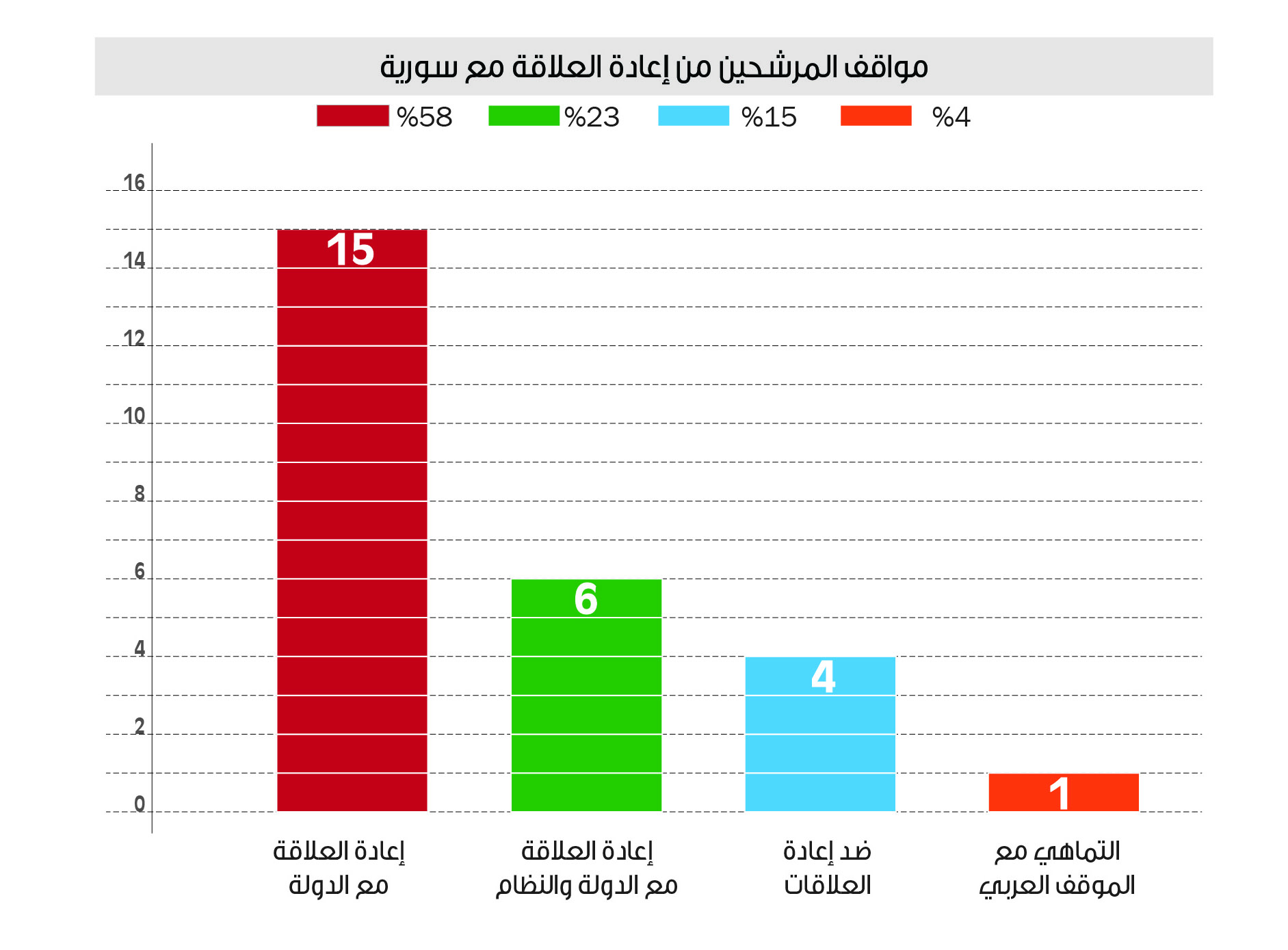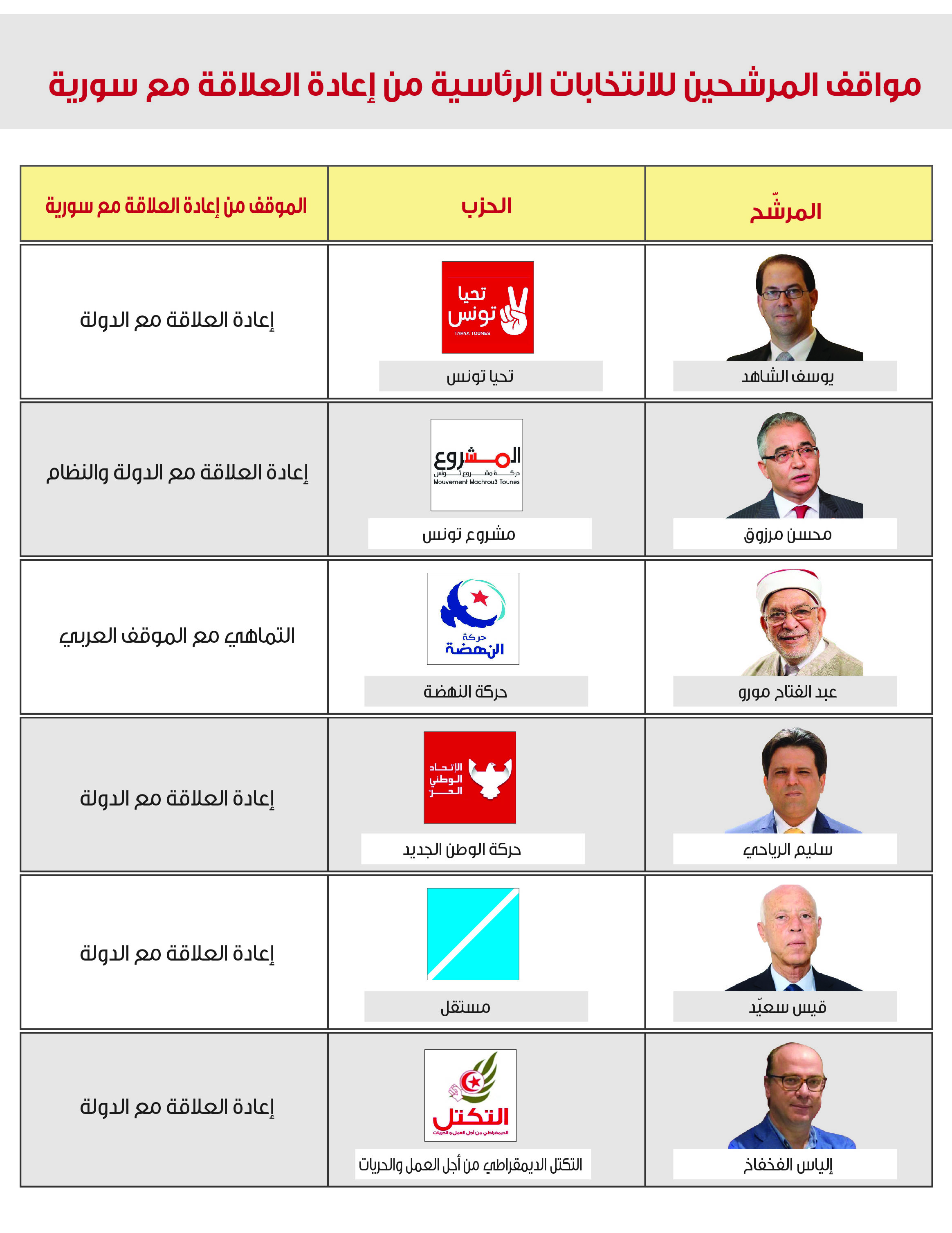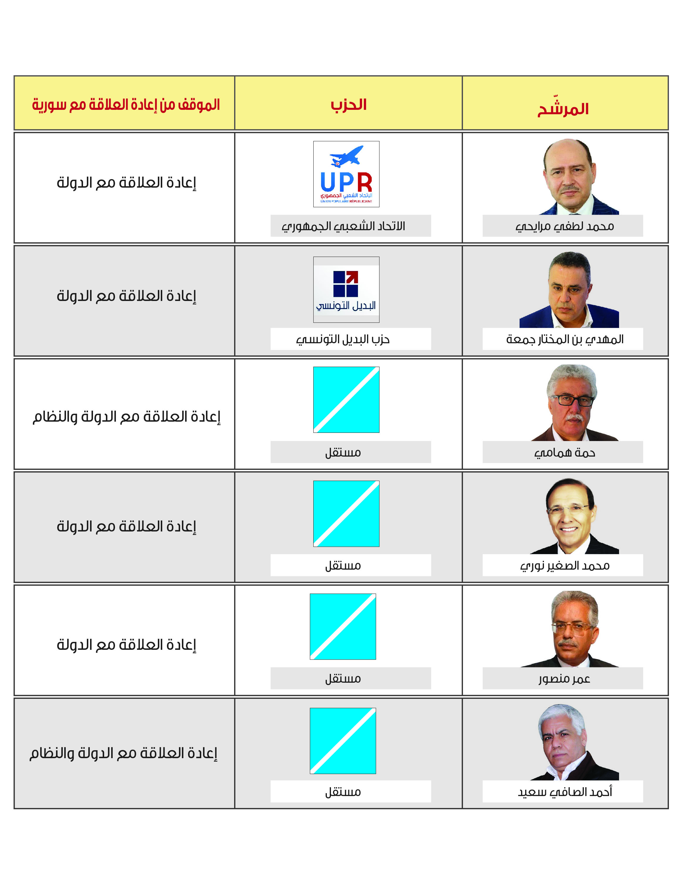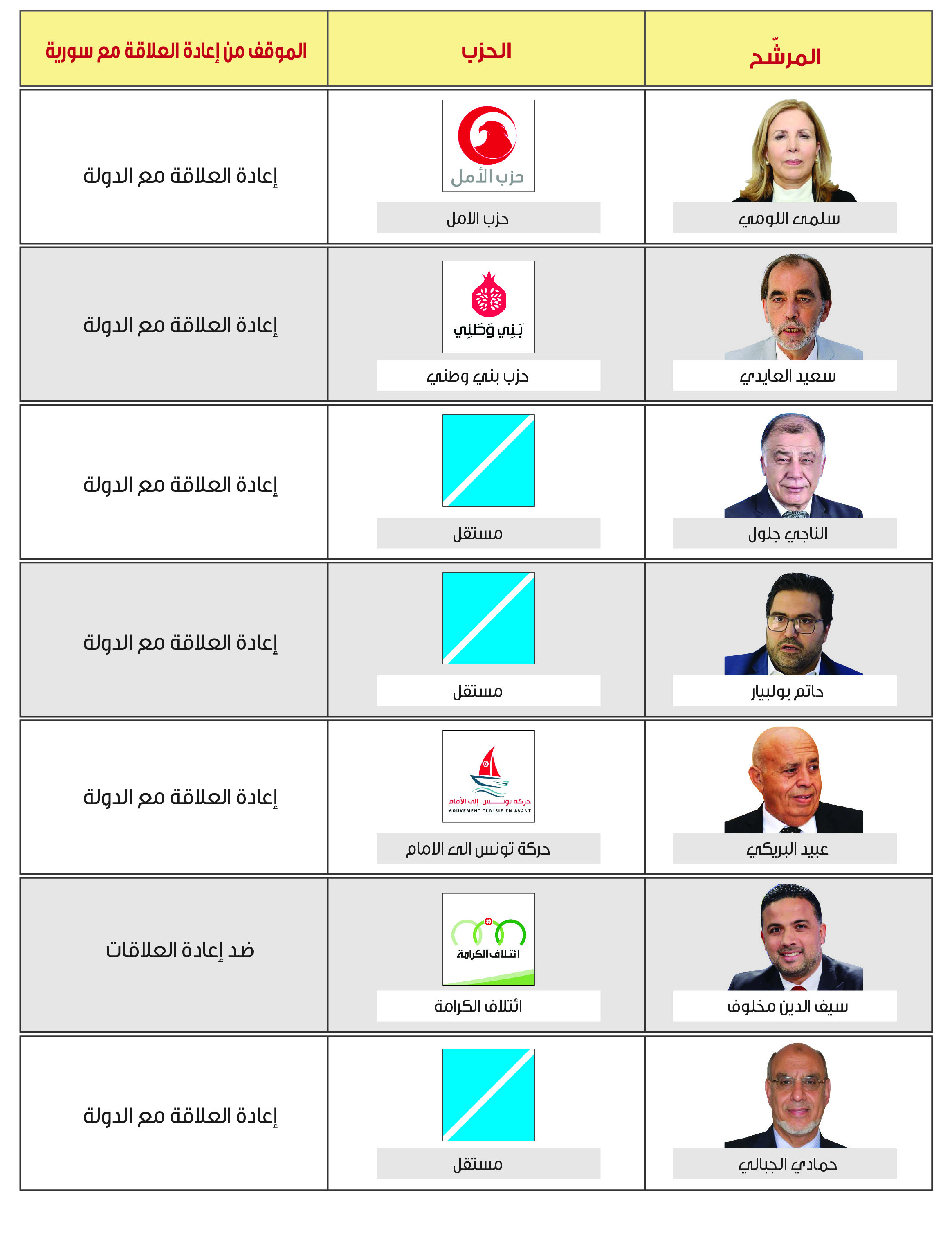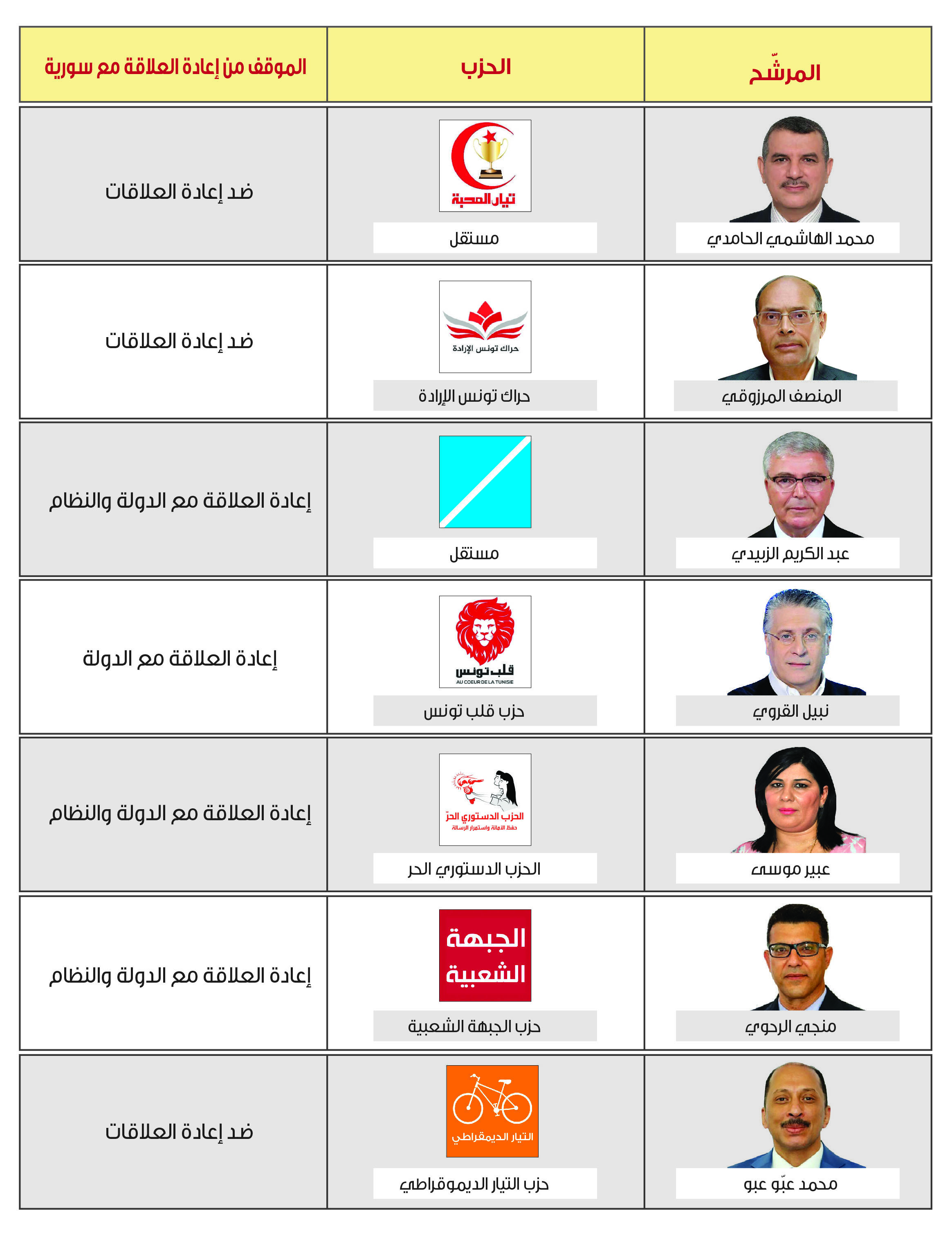 ومن خلال استعراض مواقف كل المرشحين للانتخابات الرئاسية، والبالغ عددهم (26) مرشحاً، يُلاحظ أن حوالي 57% يؤدون إعادة العلاقة مع الدولة، فيما يدعو ستة مرشحين لإعادة العلاقة مع الدولة والنظام، ويدعو مرشح واحد للتماهي مع الموقف العربي. ويرفض أربعة مرشحين عودة العلاقات مع النظام والدولة (انظر الجدول رقم -1- ).