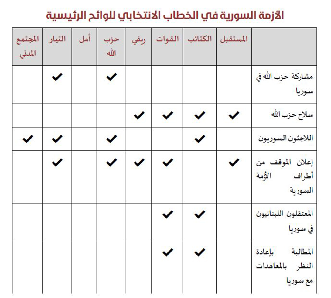 الأزمة السياسية التي تعصف بلبنان منذ أكثر من عشر سنوات، والتي انعكست على تردي الأوضاع الاقتصادية والاجتماعية للبنانيين تتصدر هموم الناخبين. لذا أتى حضور المسألة السورية في الخطابات الانتخابية لضرورات موضوعية "عرضية" أكثر منه كمواقف سياسية ثابتة يحدد على أساسها الناخبون مواقفهم من القوى السياسية يوم الاقتراع. حتى حزب الله الذي بنى شعبيته على "أيديولوجيا" المقاومة ومناهضة "الاستكبار العالمي" لجأ إلى الخطاب التنموي ومحاربة الفساد.