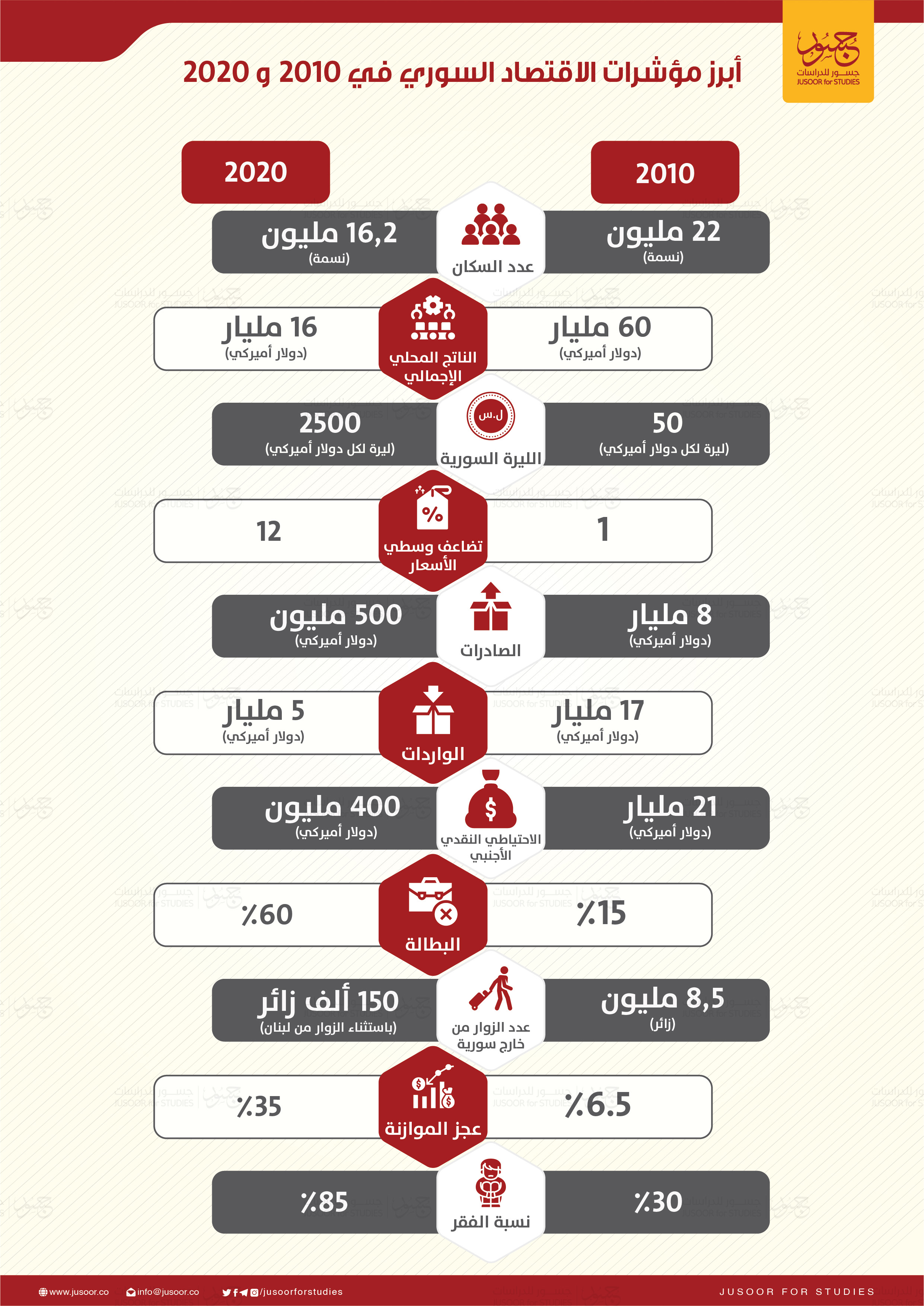 2- للمزيد راجع: أثر تطبيق قانون قيصر على المشهد الاقتصادي السوري، مركز جسور للدراسات، خالد التركاوي، تشرين الثاني-نوفمبر 2020، https://bit.ly/3m7FWdP