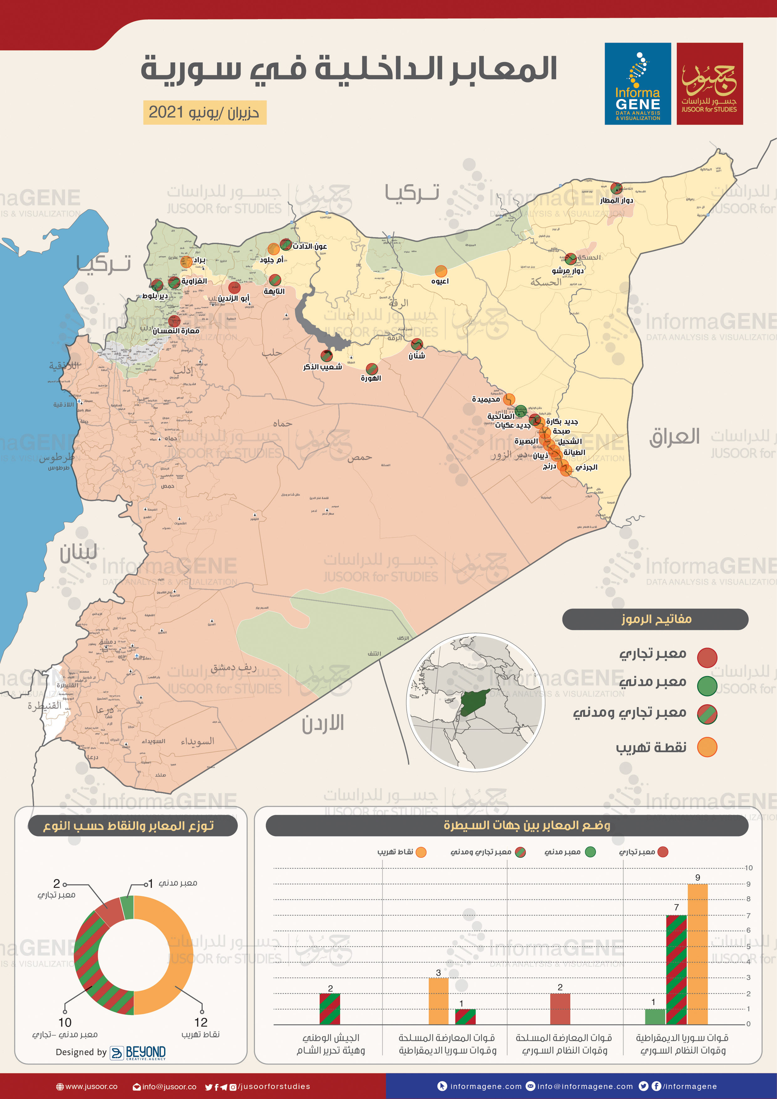 مادة بحثية ترسم حالة المعابر بين أطراف النزاع على الخارطة السورية والتي باتت توصف بالمعابر الداخلية، وكذلك تحدد الخريطة بشكل تقريبي أهم منافذ التهريب بين مختلف مناطق السيطرة ، مع تحليل سياسي واجتماعي واقتصادي للظاهرة وأسبابها وتداعياتها