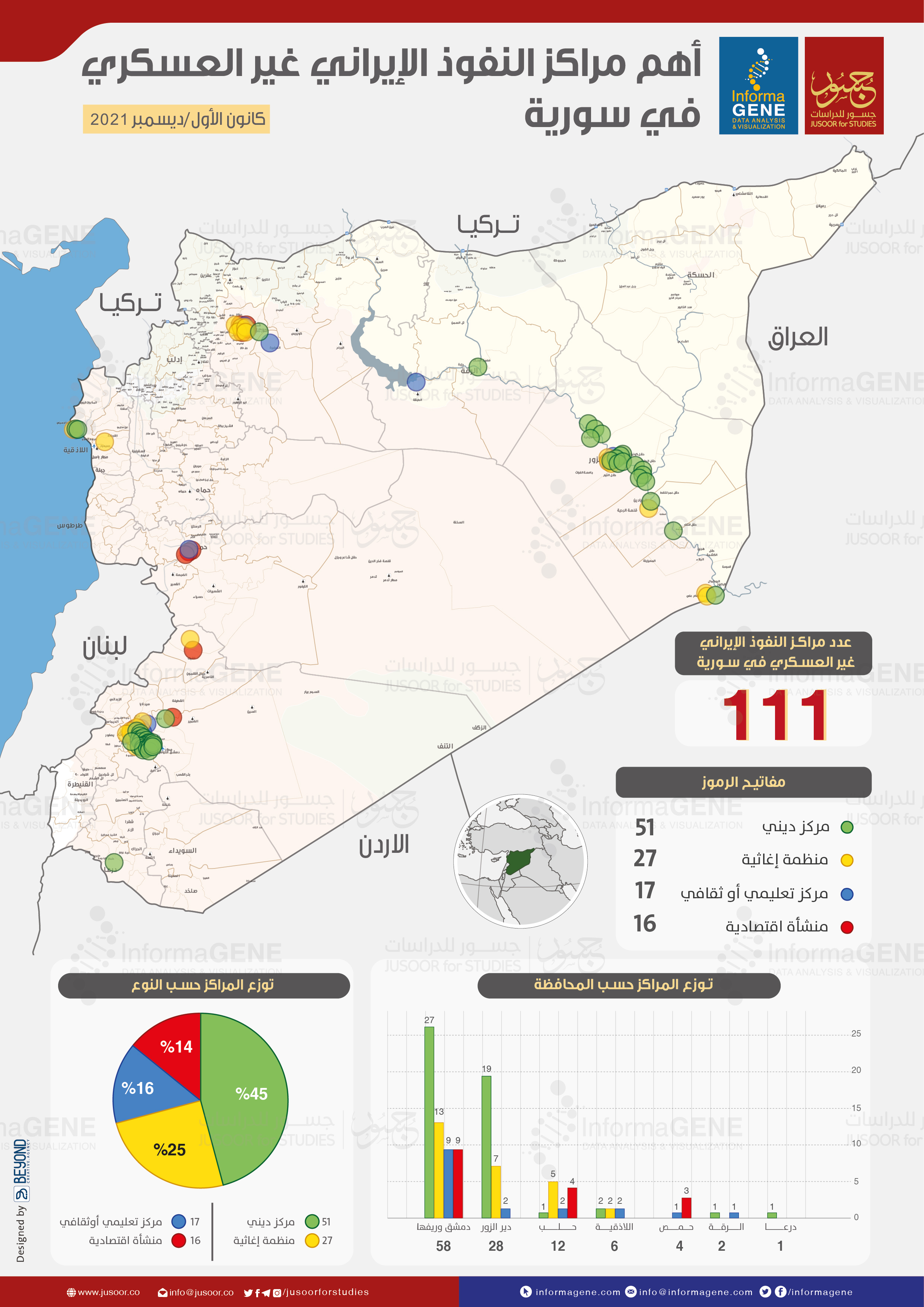 ويقدم "مركز جسور" و "منصة إنفورماجين" مع هذه الخرائط القراءة التحليلية السياسية والاجتماعية لمظاهر الانتشار الإيراني غير العسكري في سورية وأسبابه، لتكتمل صورة هذا المشروع بين يدَي الباحثين والخبراء والساسة صُنّاع القرار المتابعين للقضية السورية، وللمهتمين بدراسة المشروع العامّ العابر لحدود إيران والمهدِّد للمنطقة بشكل كامل، حيث بمتابعة الخريطة والوقوف على تحليلات طبيعة وأسباب الانتشار في سورية يظهر أحد أهداف المشروع الإيراني الممتد بالنفوذ الكامل من طهران إلى البحر المتوسط مروراً ببغداد ثم دمشق ومتفرعاً في مختلف المحافظات الإستراتيجية لبناء هذا المشروع.