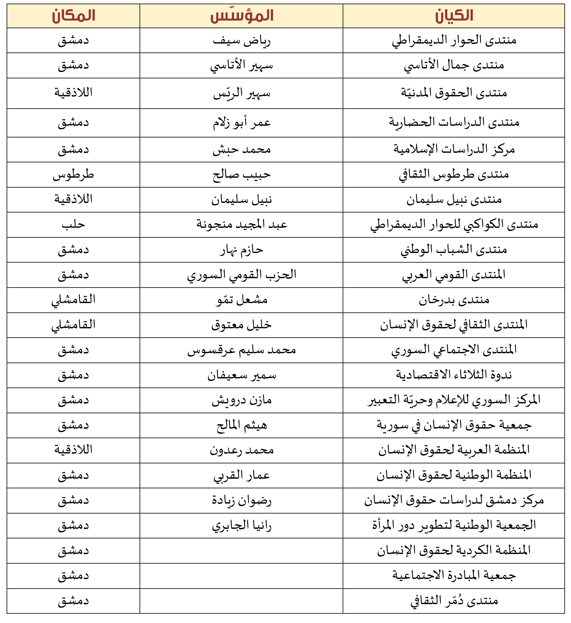 كاد يكون في كل محافظة سوريّة كيان أو أكثر للمجتمع المدني، وأغلبها لم يحمل اسماً عامّاً مع غياب التراخيص من وزارة الشؤون الاجتماعية والعمل(7)، لكنّها –باستثناء منتدى الحوار الوطني الذي أسّسه النائب السابق والمعارض رياض سيف منتصف أيلول/ سبتمبر 2000، ومنتدى جمال الأتاسي الذي أسسته سهير الأتاسي منتصف كانون الثاني/ يناير 2001– لم تستمر طويلاً أو اضطرت إلى ممارسة الأنشطة والبرامج بشكل سري لا علني؛ نتيجة العراقيل التي تعرّضت لها من قبل السلطة(8)