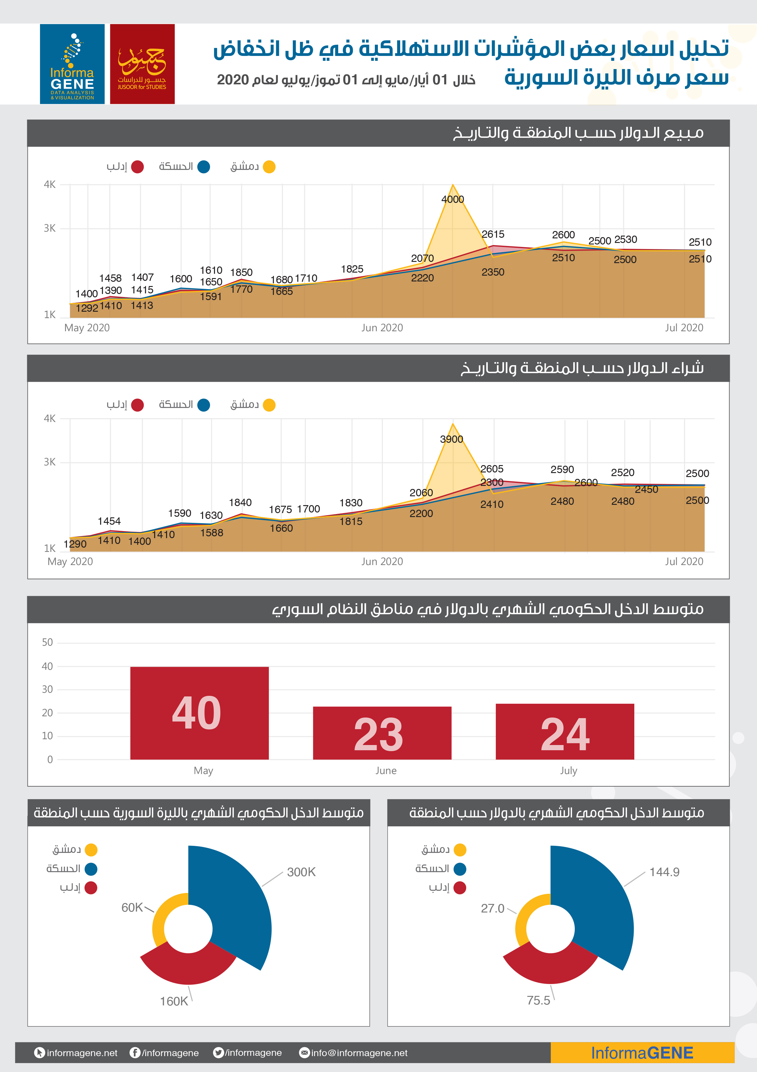 تطور سعر الدولار مقابل الليرة السورية منذ بداية العام بشكل كبير وغير مسبوق ليصل مع نهاية شهر أيار- مايو إلى أكثر من 1800 ليرة ثم يصل في حزيران – يونيو إلى 3900 ليرة ويعود لينخفض إلى أقل من 2500 ليرة سورية مع نهاية حزيران.