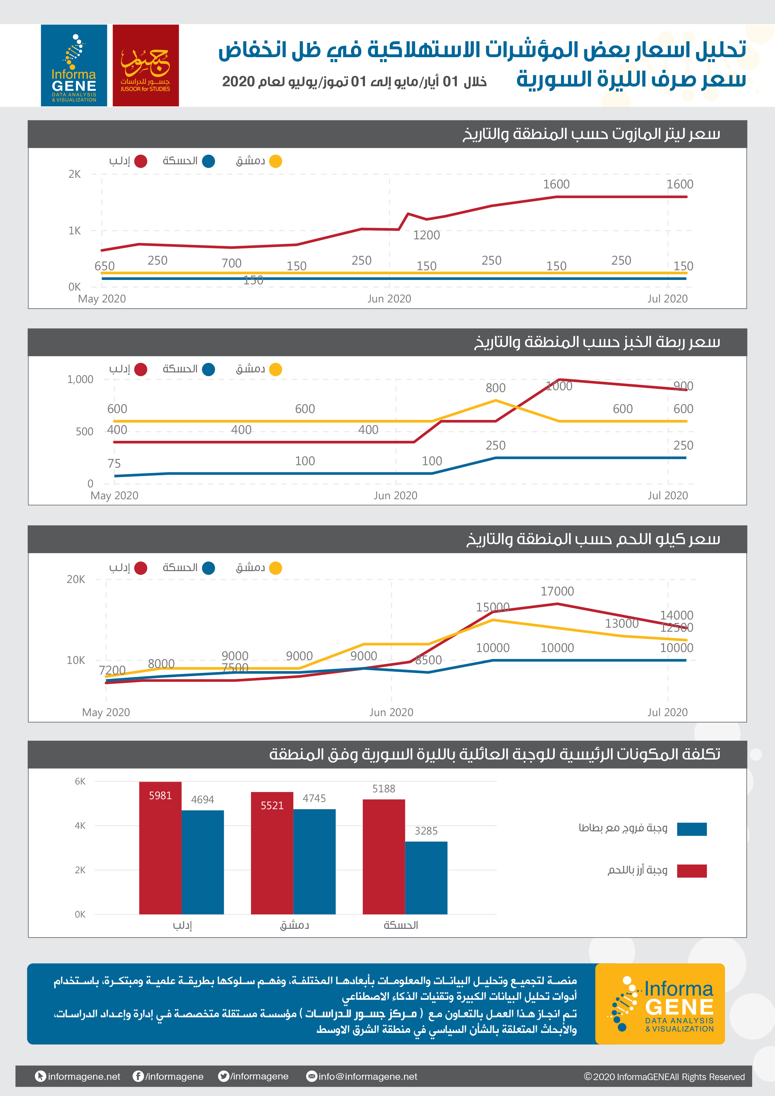 أسعار المواد الرئيسية ارتفعت بشكل كبير ومتفاوت بين منطقة و أخرى فسعر ليتر المازوت وصل إلى 1600 ليرة سورية في ادلب، فيما بقي ثابتاً عند متوسط 200 ليرة في مناطق النظام ( توزيع حكومي) ولكن السعر مختلف في السوق السوداء حيث أنه أكثر ارتفاعاً، أما في مناطق سيطرة سورية الديمقراطية فكان الأقل على الإطلاق بحوالي 130 ليرة وذلك لتوافر الوقود بكميات كبيرة في هذه المناطق.