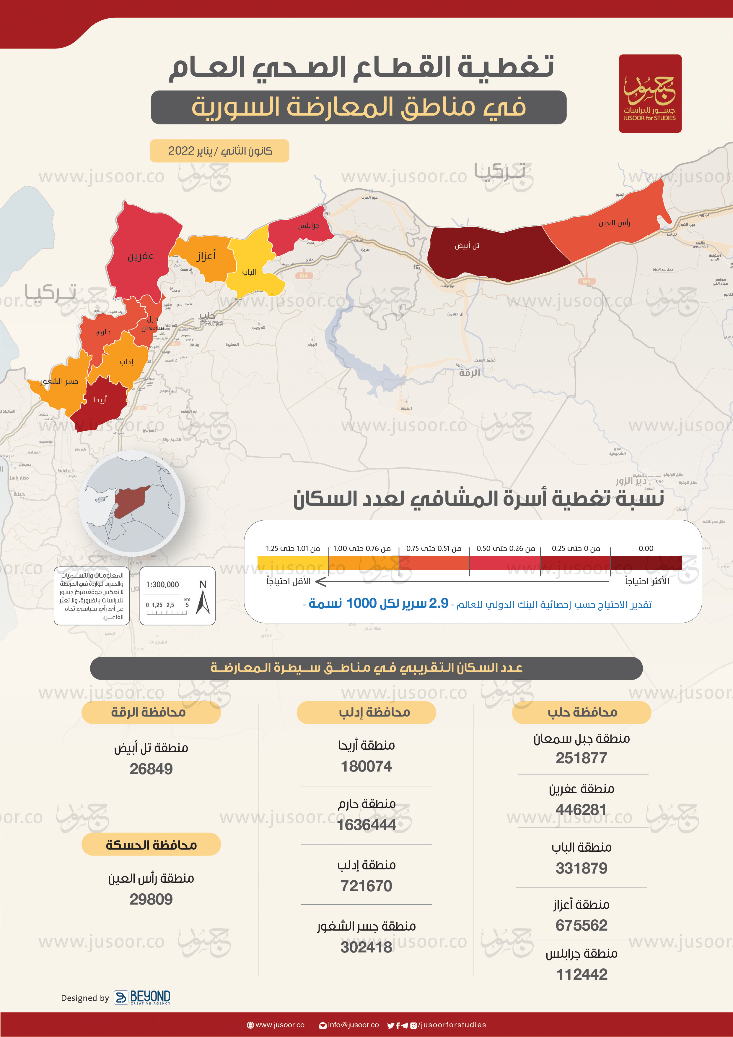 وعليه ينشر "مركز جسور للدراسات" خرائط تحليلية حول ما يغطيه القطاع الصحي العامّ في مناطق المعارضة السورية في ظل ما يعانيه من ضعف البِنْية التحتية والخدمات والكوادر مُقارَنةً بعدد السكّان المحليين.