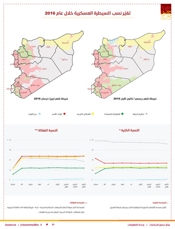 أصدر مركز جسور للدراسات خريطة سنوية ترصد التغيرات الجارية في نِسَب السيطرة العسكرية الكليّة والفعاّلة خلال الفترة الممتدة من شهر نيسان/أبريل عام 2016 وحتى كانون الأول/ديسمبر 2016، وأُرفق معها مخطط بياني يوجز التغيرات الحاصلة.