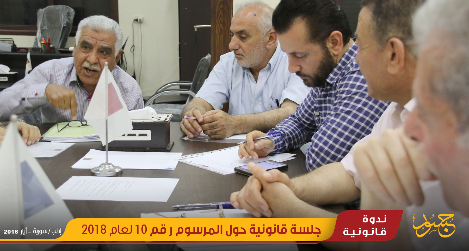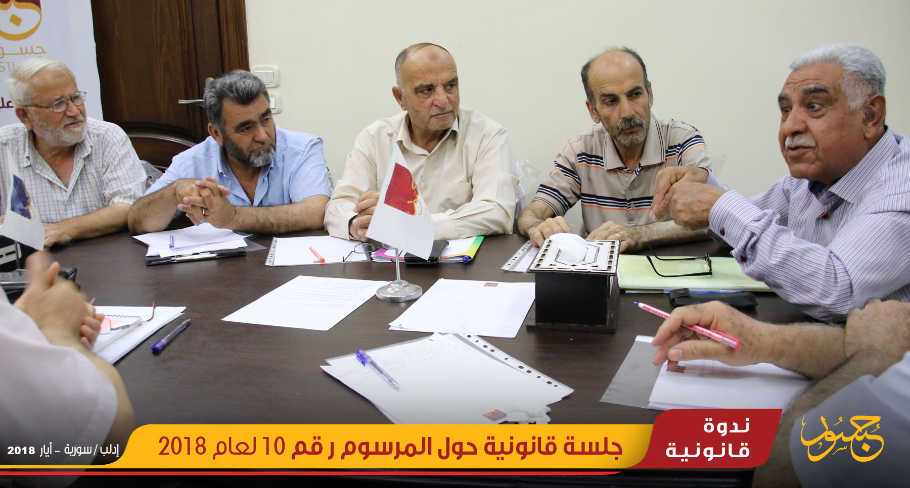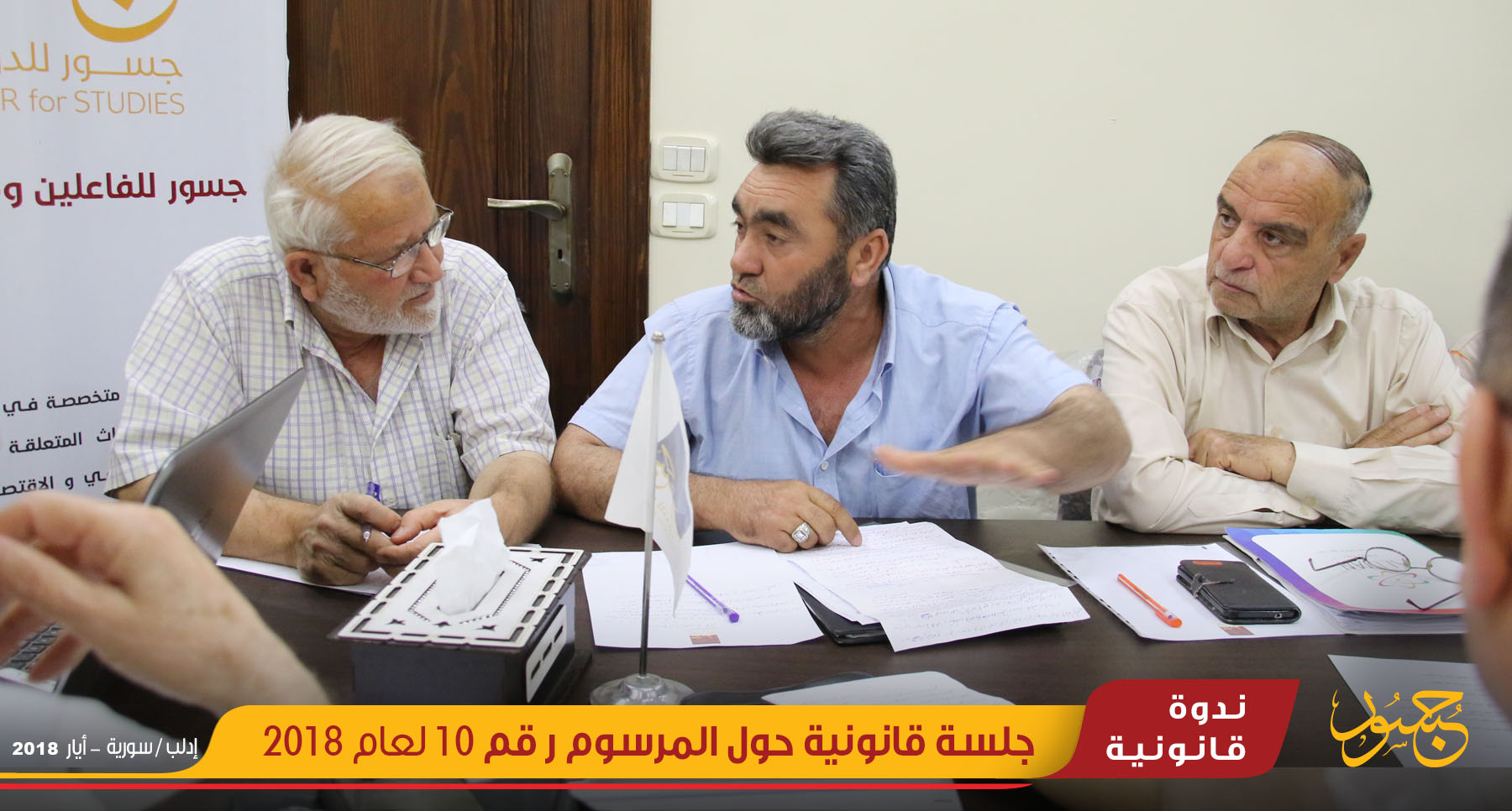 عقد مركز جسور للدراسات، ندوة قانونية حول القانون رقم 10 لعام 2018 الذي صدر عن النظام السوري بتاريخ 2/4/2018 القاضي بجواز إحداث منطقة تنظيمية أو أكثر ضمن المخطط التنظيمي العام للوحدات الإدارية يوم الخميس، الموافق 24 أيار، بمكتب مركز جسور للدراسات في مدينة إدلب، بمشاركة نخبة من القانونين والحقوقيين المتخصصين لمعرفة آراءهم القانونية حول ما تضمنه القانون من نصوص.