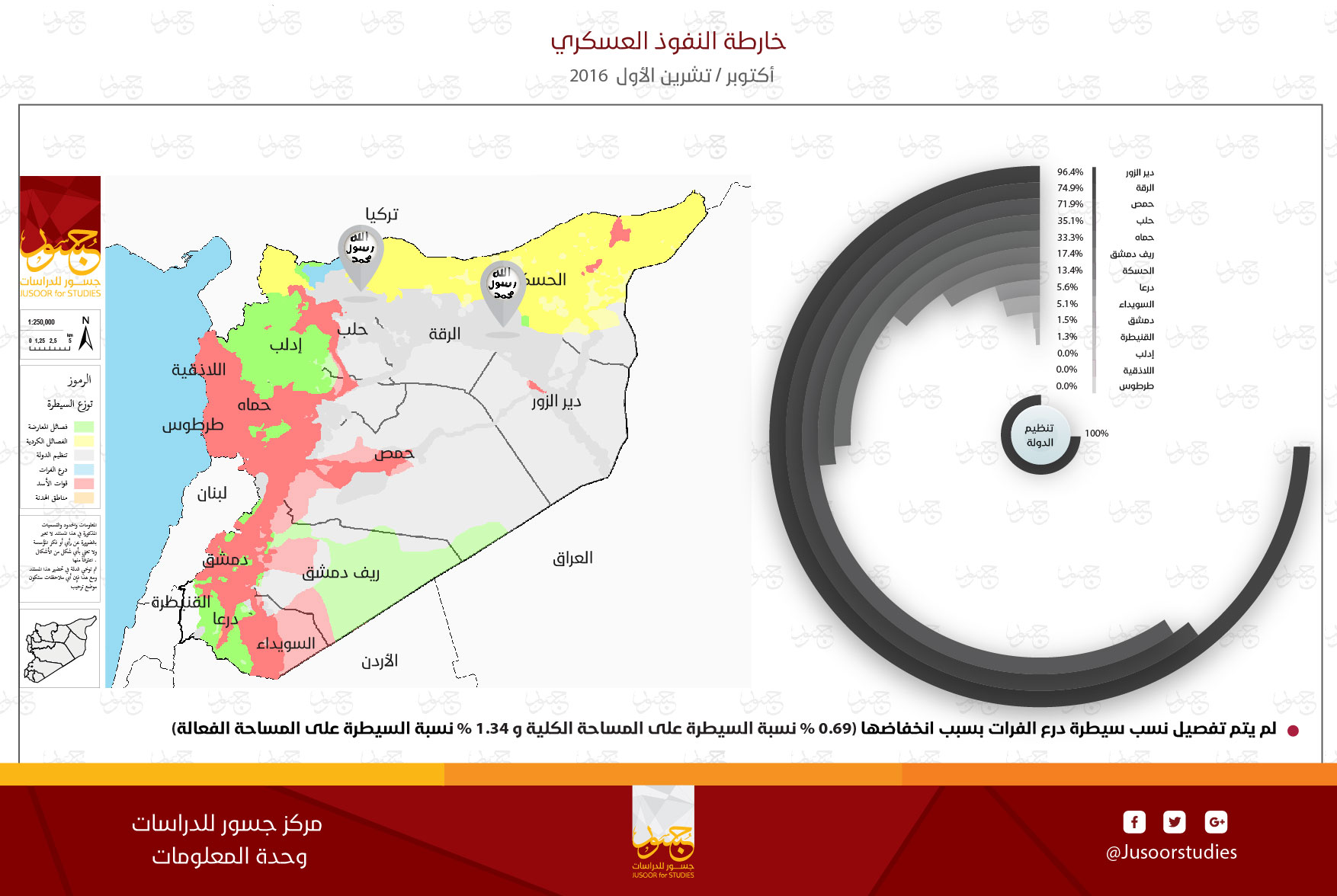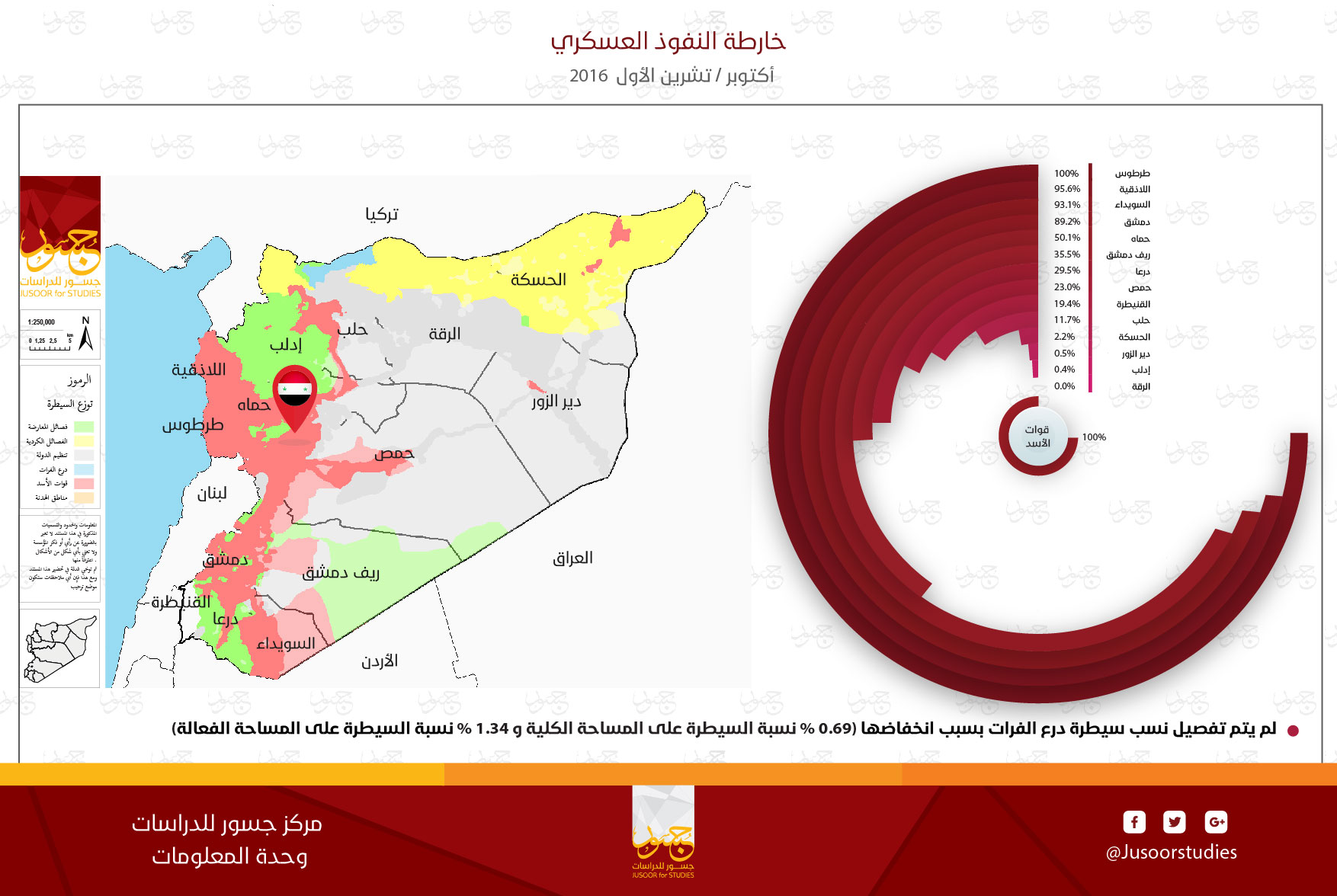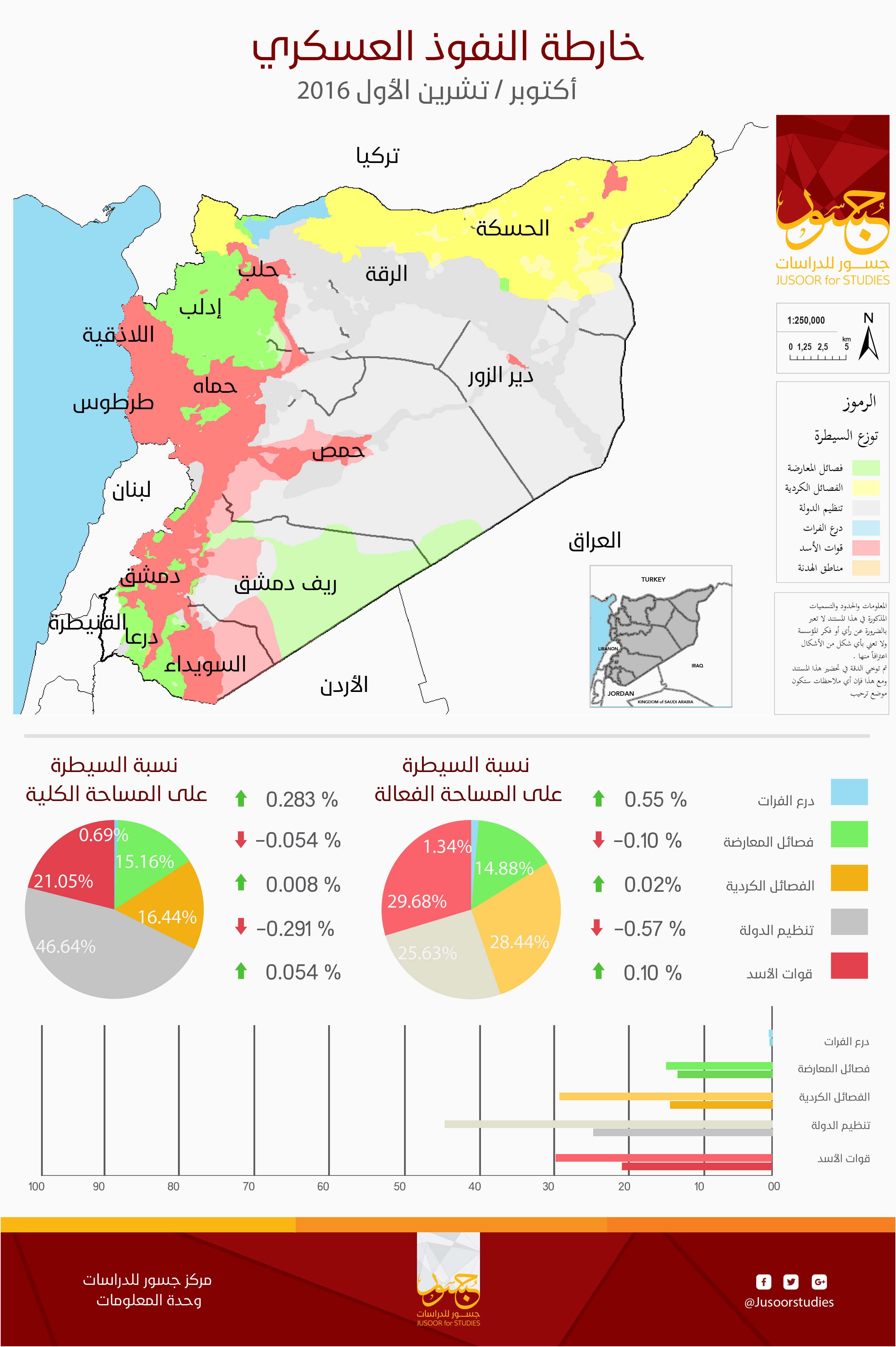 أصدر مركز جسور خارطة النفوذ العسكري لشهر أكتوبر/تشرين الأول 2016، والتي أظهرت بعض التغيرات في نسب السيطرة الكلية، والفعّالة لمختلف الأطراف المتحاربة عن خارطة النفوذ العسكري لشهر سبتمبر/أيلول 2016.