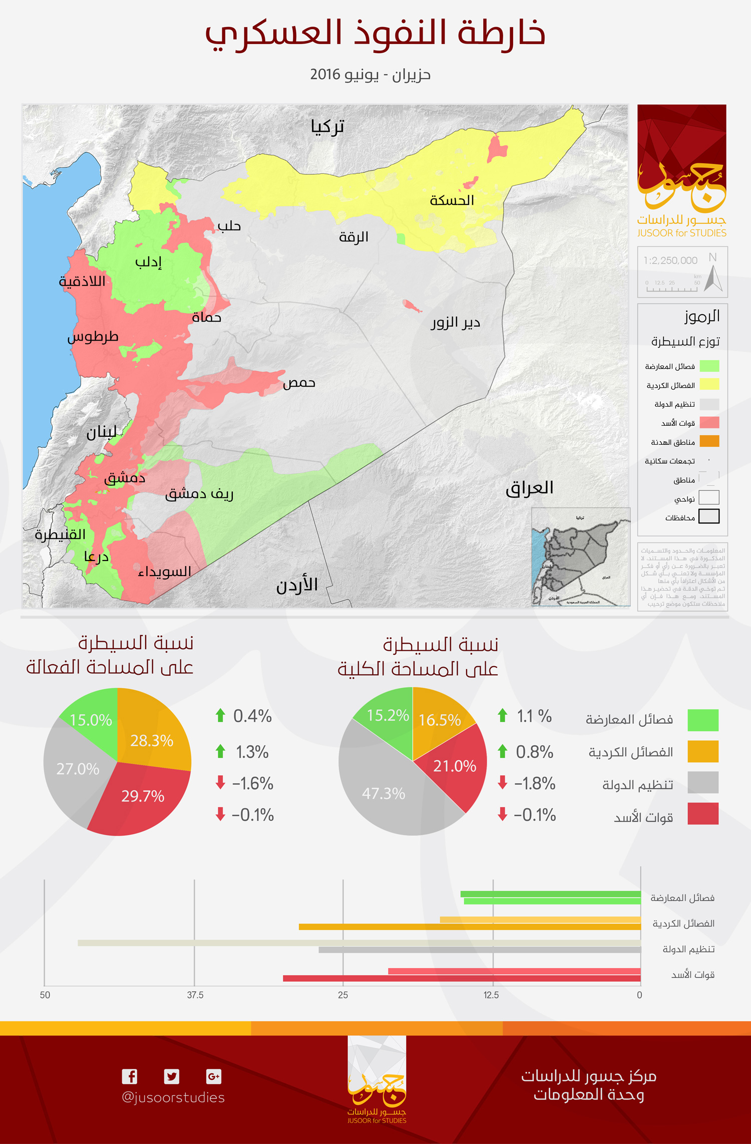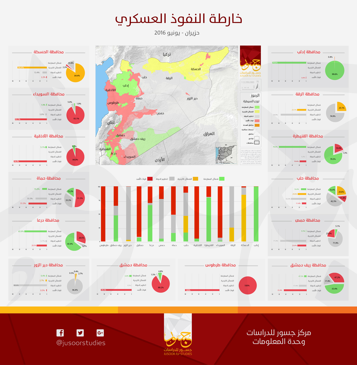أصدر مركز جسور خارطة النفوذ العسكري لشهر حزيران/يونيو 2016، والتي أظهرت بعض التغييرات في نسب السيطرة الكلية والفعالة لمختلف الأطراف المتحاربة عن خارطة النفوذ العسكري لشهر أيار/مايو 2016.