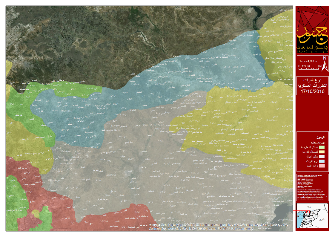 أصدر مركز جسور للدراسات اليوم الثلاثاء 18 تشرين الأول/أكتوبر 2016 خريطة توضح التطورات التي شهدتها عملية درع الفرات في مرحلتها الثالثة، حيث استطاعت الفصائل المعارضة المنضوية تحت عملية درع الفرات السيطرة على بلدتي دابق وصوران في 16 تشرين الأولم/أكتوبر 2016 وذلك بعد تمكنها من الاستيلاء على بلدة اخترين وعدة قرى في محيط مدينة صوران الغربي والشمالي، مستفيدة من التمهيد المدفعي والجوي الذي وفرته لها القوات التركية ومحققة فارقاً نوعياً وموسعة مساحة سيطرتها إلى 1130 كم مربع على طول الحدود في محافظة حلب.