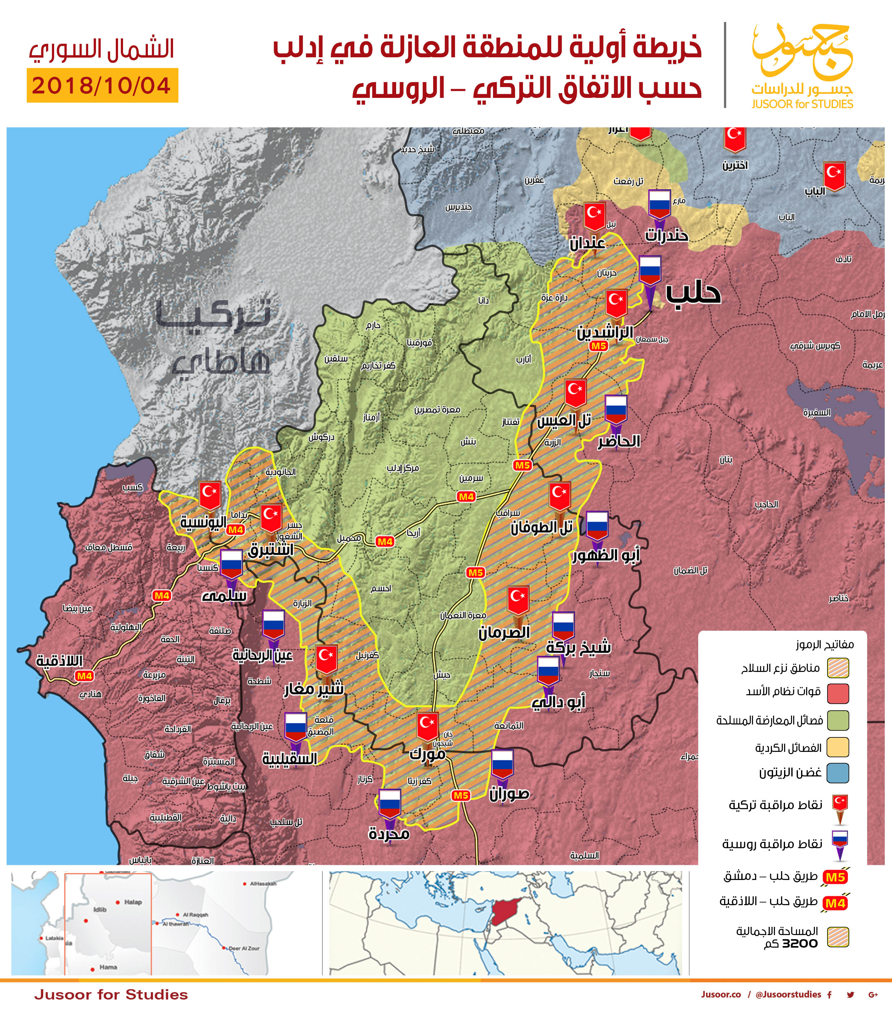وينشر مركز جسور للدراسات الشكل شبه النهائي للخريطة بناء على ملحق البروتوكول الرسمي رقم /1/ الصادر بتاريخ 21 أيلول/ سبتمبر 2018 والموقع من قبل اللجان الفنية الروسية والتركية.