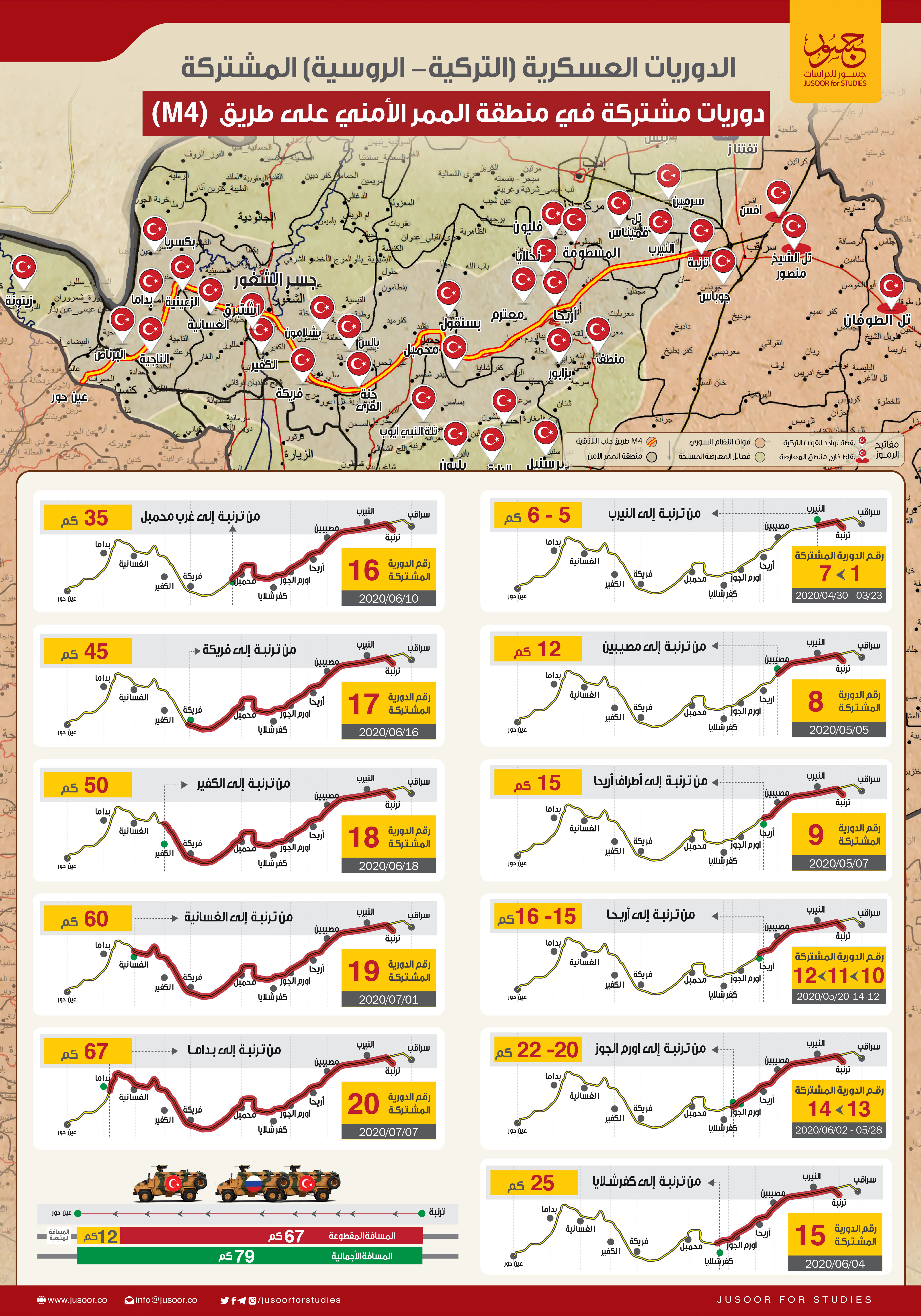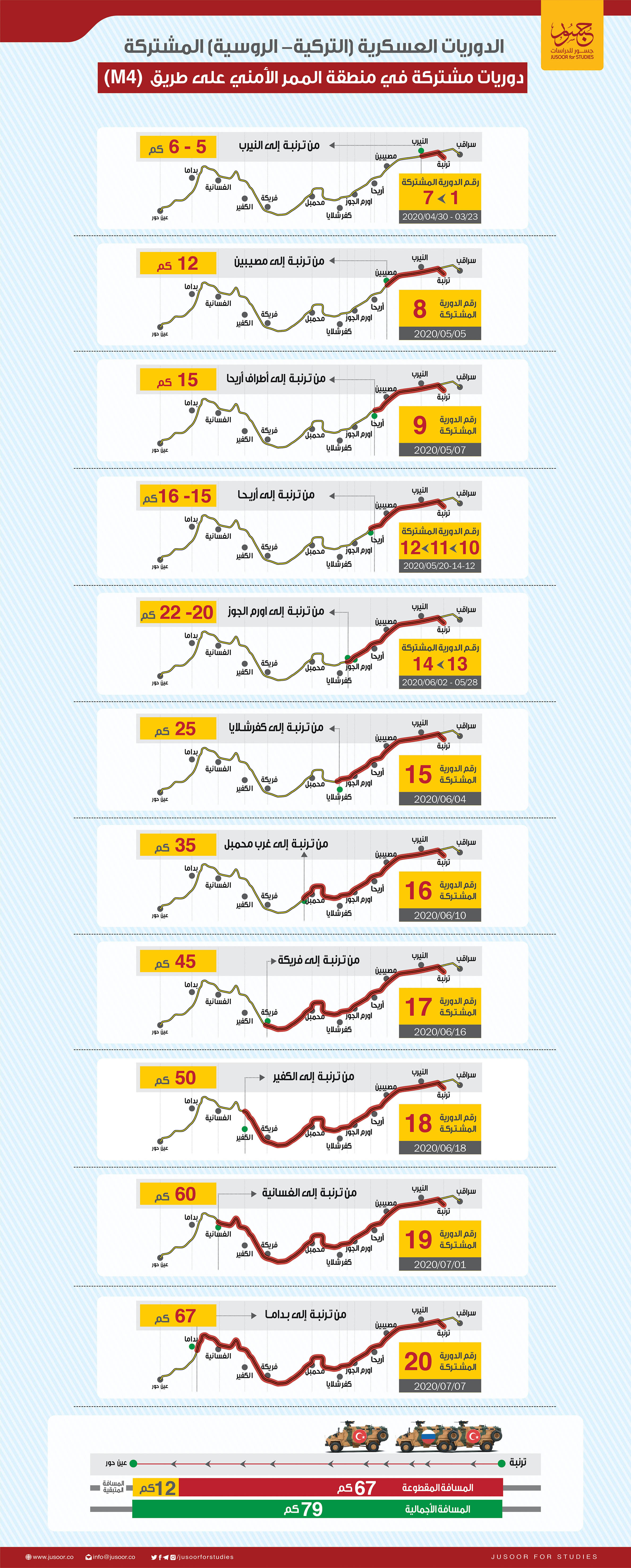 ومنذ توقيع مذكّرة موسكو استطاعت تركيا وروسيا تسيير 20 دورية على طريق حلب - دمشق الدولي M4 كان أطولها الأخيرة التي بلغ خط مسيرها 67 كم انطلاقاً من بلدة ترنبة وحتى بلدة بداما. علماً أنّ عمل الدوريات كان يسير ببطء شديد خلال الجولات السبع الأولى حيث اقتصر مسارها على 6 كم.