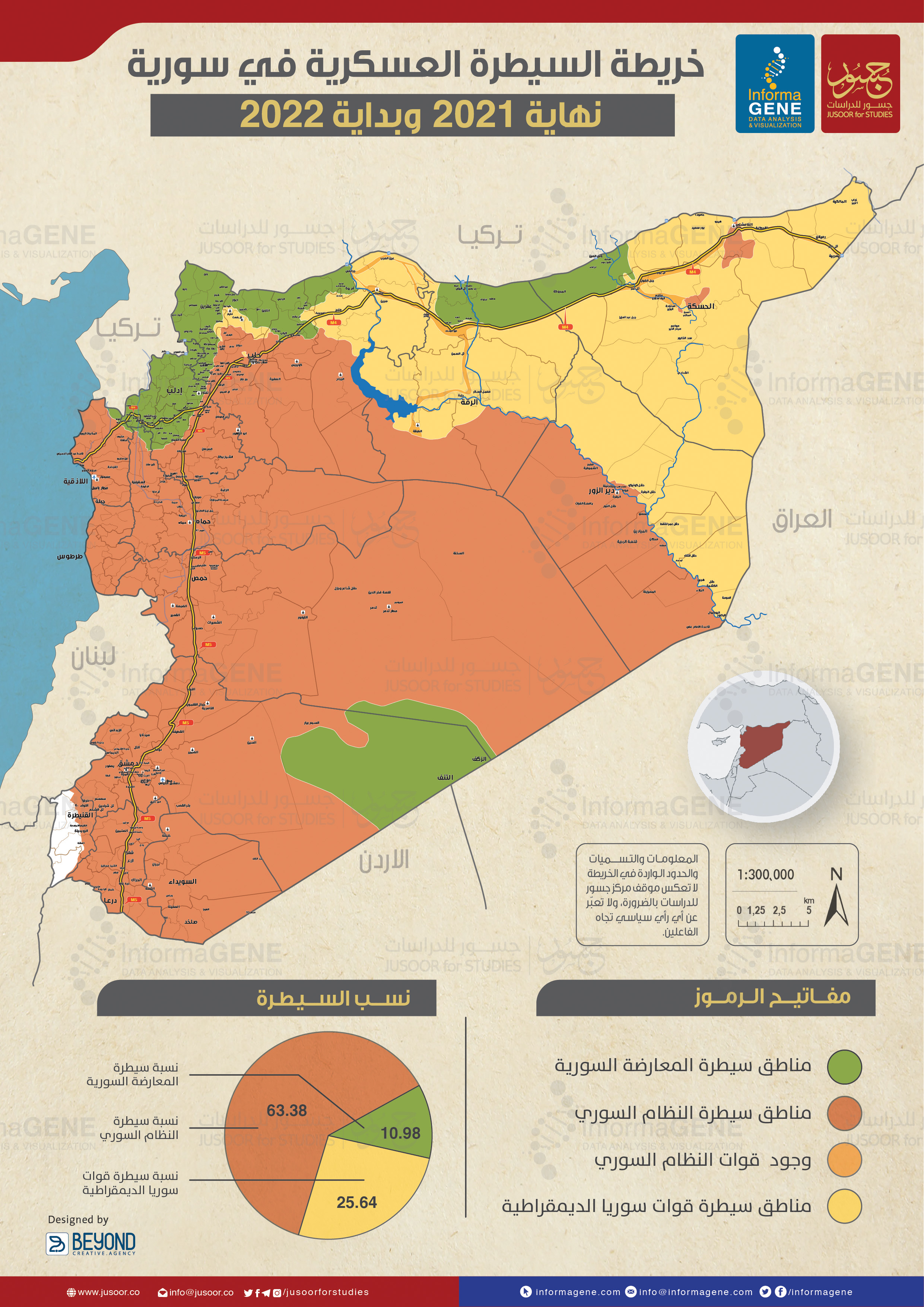 ووفقاً لخريطة السيطرة العسكرية التي يُصدرها "مركز جسور للدراسات" بالتعاون مع "منصة إنفورماجين لتحليل البيانات"، فإنّ نِسَب سيطرة القُوَى على الأرض هي على النحو الآتي: