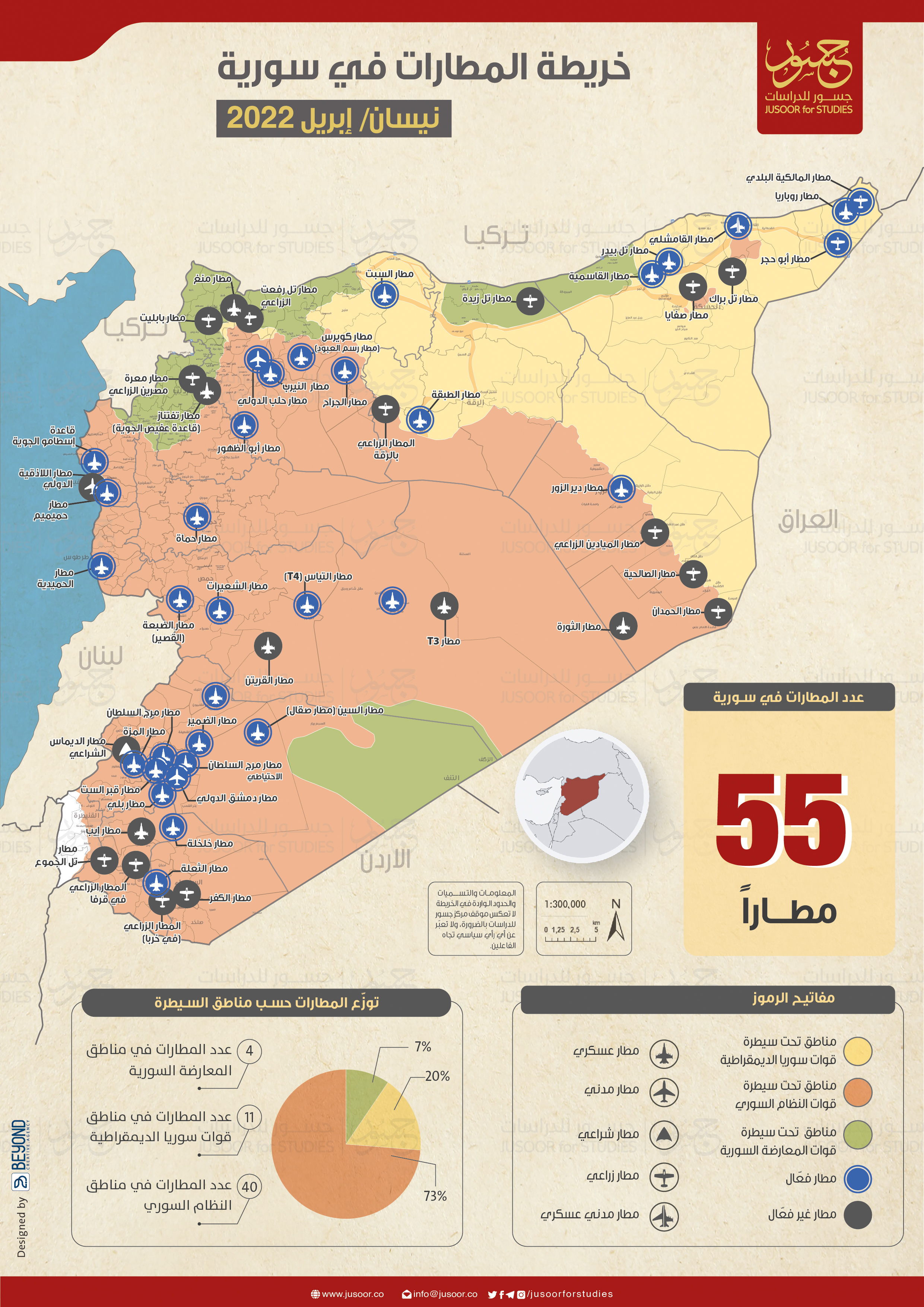 يُصدر مركز جسور للدراسات خريطة المطارات في سورية وعددها 55 مطاراً بأنواعها المختلفة المدنية والعسكرية والزراعية والشراعية، الفعّالة منها كمطارات تقلع وتهبط فيها الطائرات وعددها 33 مطاراً، أو غير الفعّالة منها وعددها 22 مطاراً تحوّل أغلبها إلى قواعد عسكرية. كما أن هناك بعض المطارات الزراعية المهملة بشكل كامل ولا وجود فيها لأي قوات.