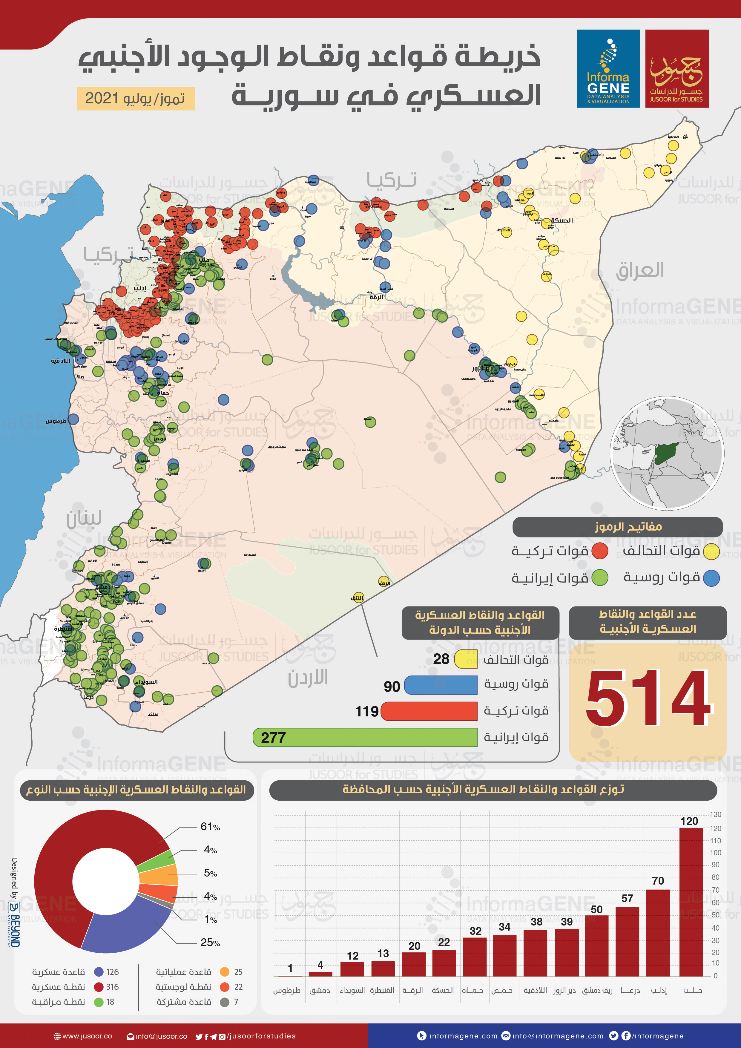 منذ نيسان/ أبريل 2013، بدأت القوّات الأجنبية التأسيس لتواجُد عسكري بعيد الأمد لها في سورية، وحتى منتصف عام 2021، وصل عدد المواقع من قواعد ونقاط إلى 514 لأوّل مرّة في تاريخ البلاد الحديث. يعكس هذا الرقم حجم التأثير الخارجي في الملف السوري، على حساب التأثير الداخلي للفاعلين المحليين جميعًا.