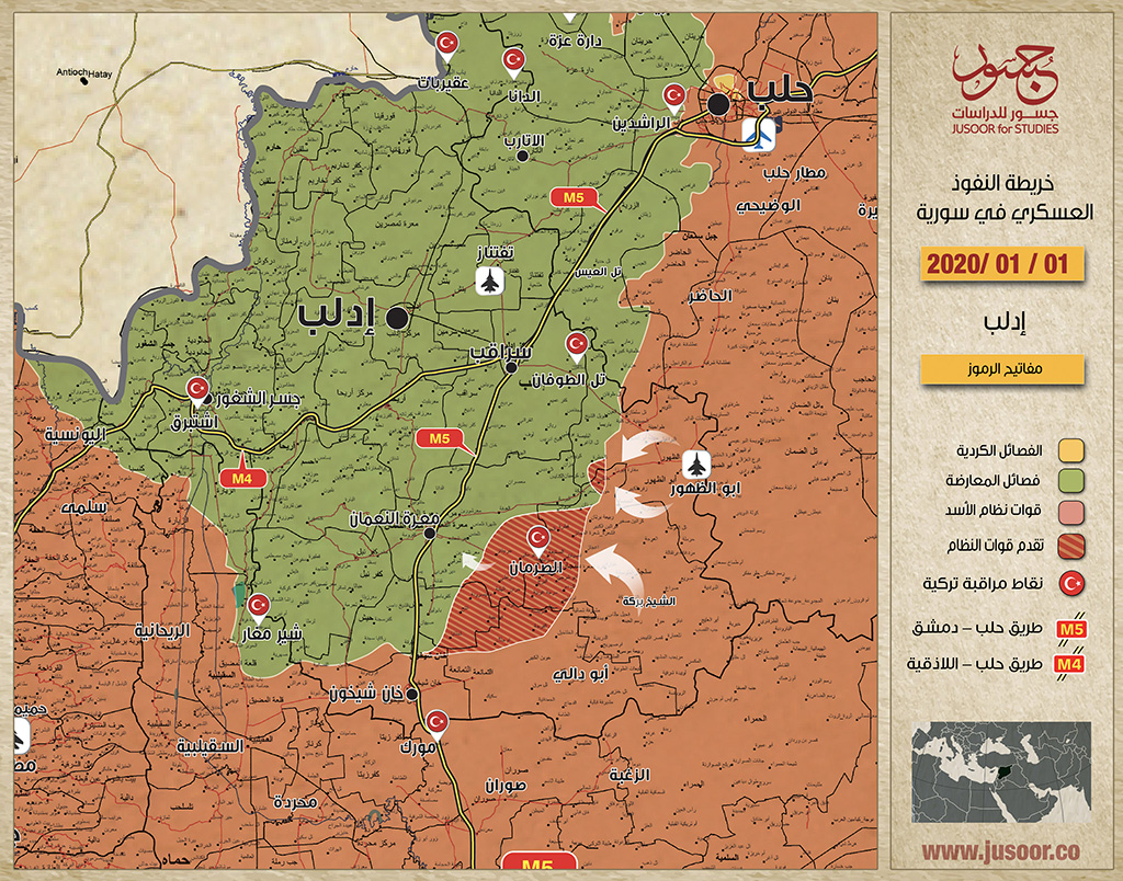 وخلال شهر كانون الأول/ ديسمبر 2019، حققت قوّات النظام السوري تقدّماً ملموساً في منطقة خفض التصعيد بعد استئنافها للعمليات القتالية في تشرين الثاني/ نوفمبر 2019، جنوب شرق إدلب، ما أدّى إلى تغيّر ملحوظ في خارطة النفوذ ضمن المنطقة العازلة؛ حيث باتت نقطة المراقبة التركية في تل الصرمان مطوّقة بالكامل مع اقتراب قوّات النظام السوري بشكل كبير من مدينة معرّة النعمان الاستراتيجية.