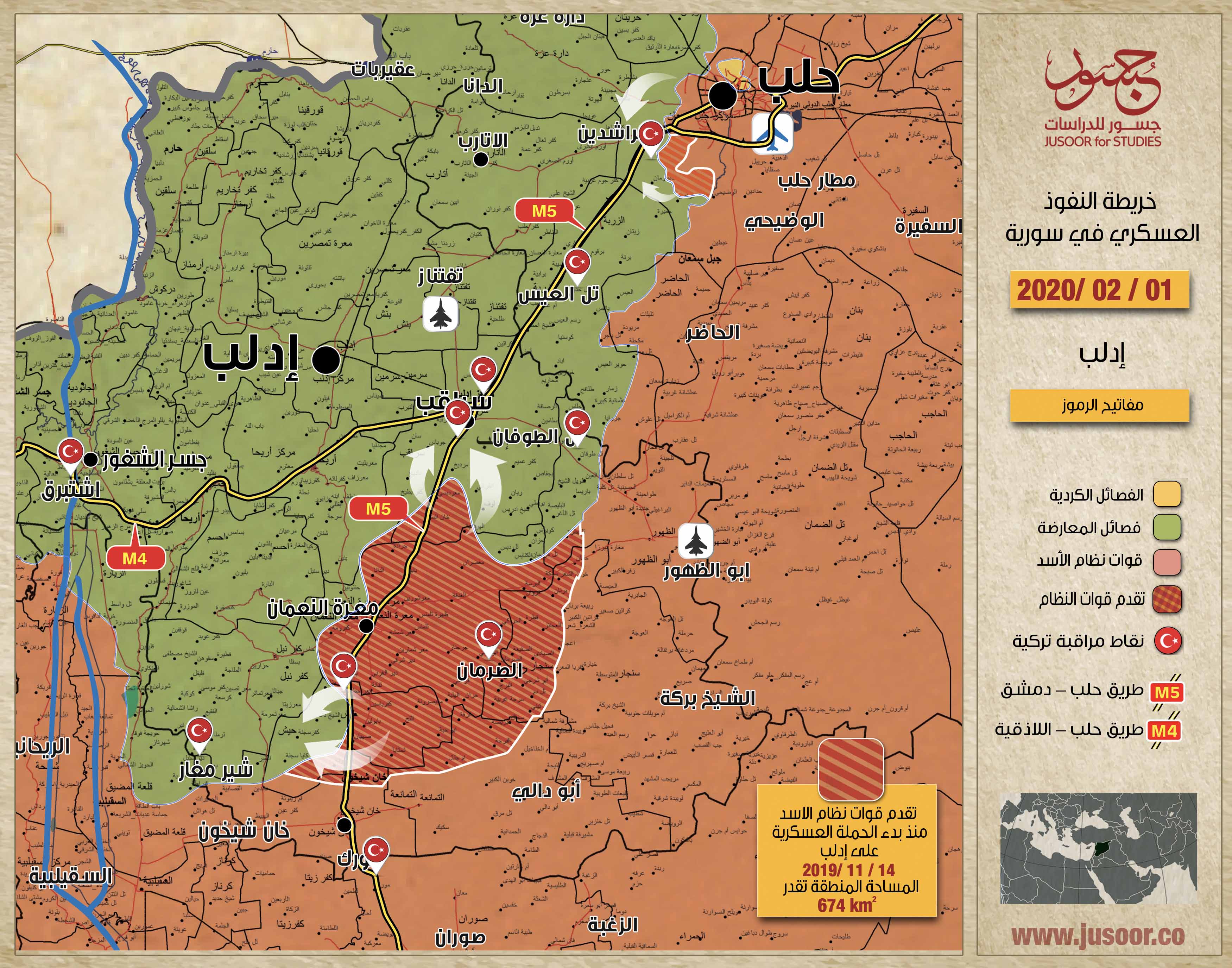 • سيطرت قوّات النظام السوري على مدينة معرّة النعمان الاستراتيجية شرق إدلب وباتت على بعد كيلومترات من مدينة سراقب. علماً أنّ مساحة تقدمها خلال شهر كانون الثاني/ يناير 2020 تبلغ 335 كم مربّع.