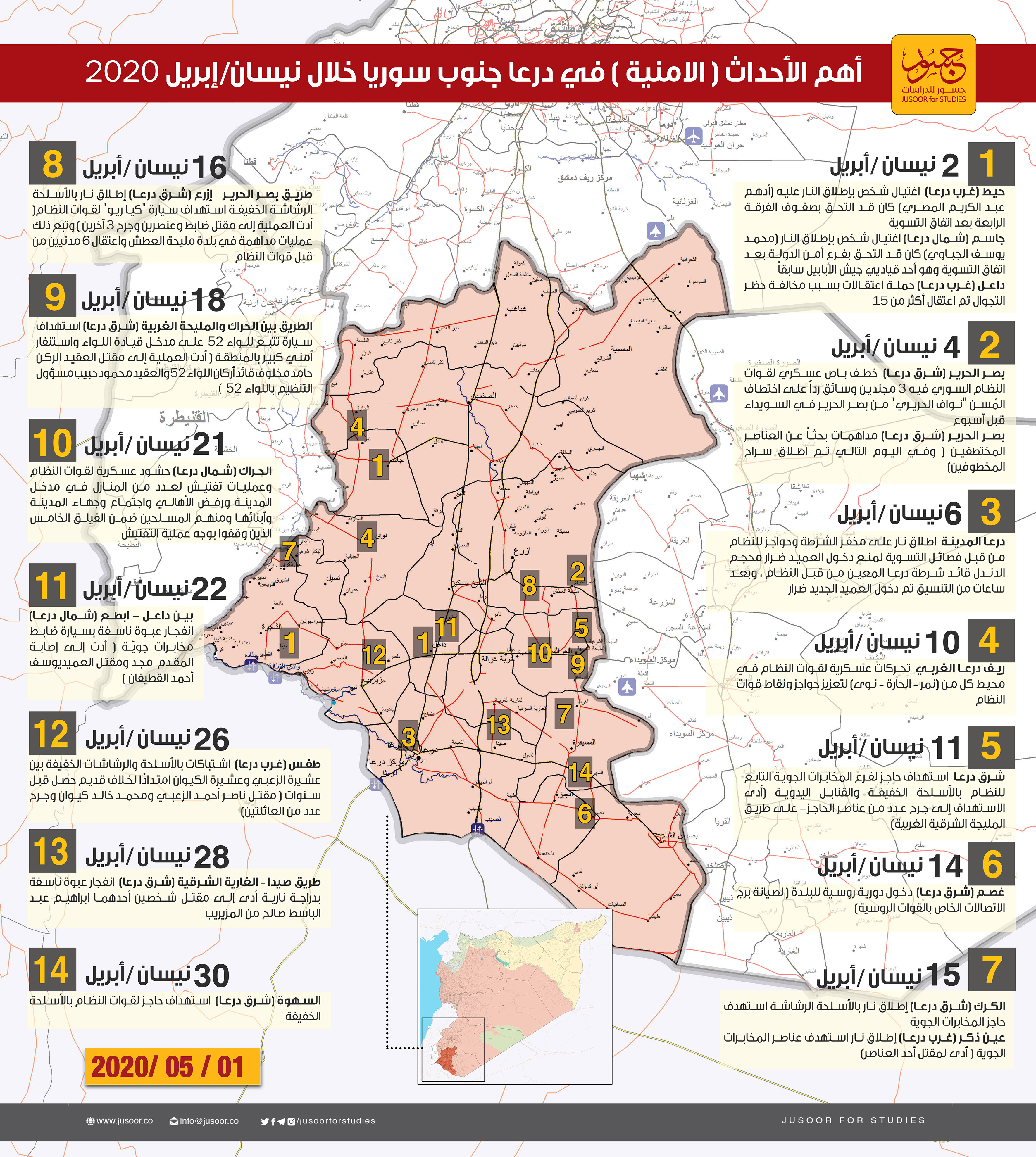 كما، يُصدر مركز جسور للدراسات مرفقاً لخريطة تتضمن أبرز العمليات الأمنية التي شهدتها محافظة درعا جنوب سورية خلال شهر نيسان/ أبريل 2020، والتي اقتربت من 40 حدثاً يشمل الهجمات وعمليات الاختطاف، الاقتحام، الاغتيال، المداهمة والملاحقة، والتي تطال مصالح النظام السوري، و السكّان المحليين وعناصر التسويات.