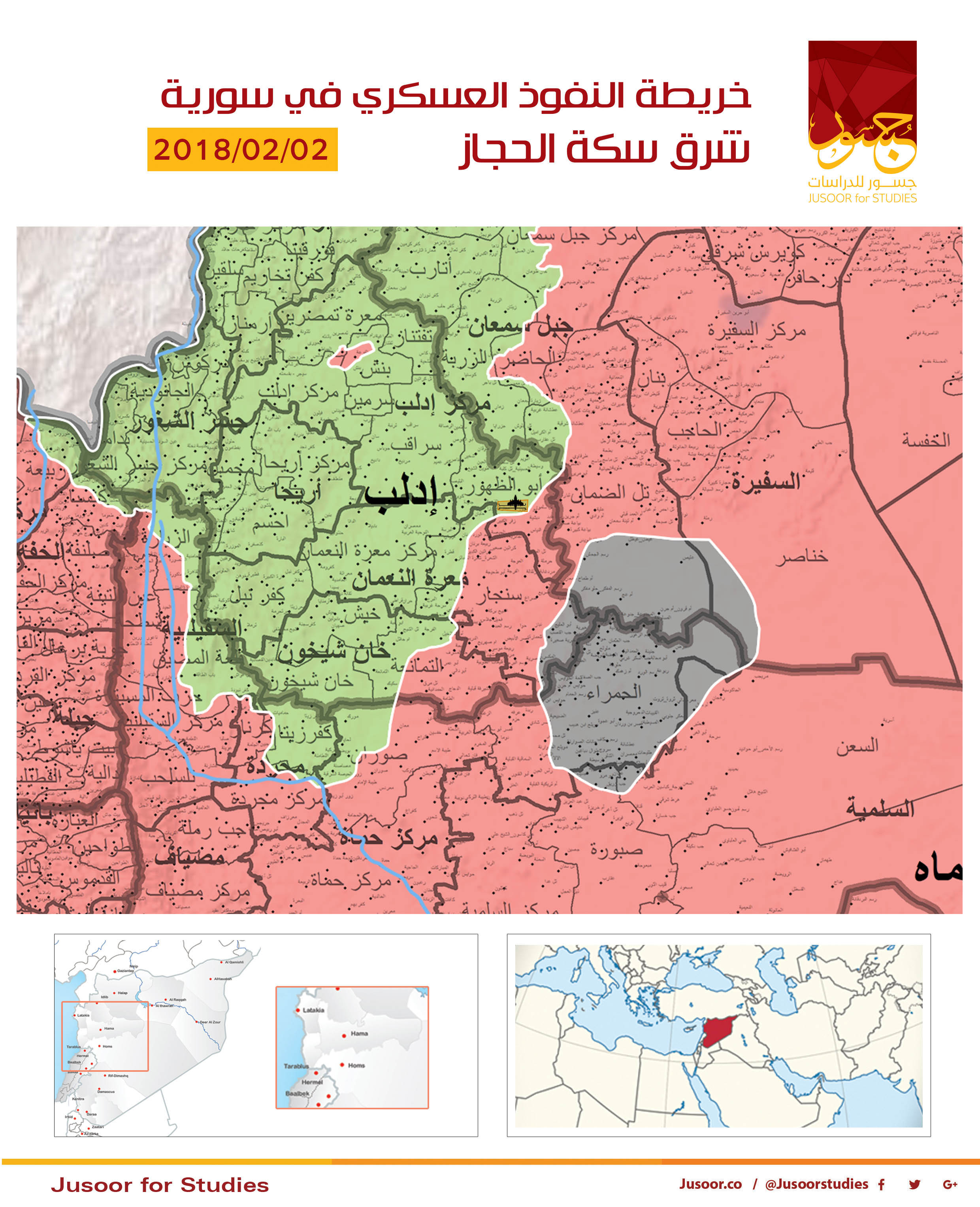 أصدر مركز جسور للدراسات خارطة النفوذ العسكري في سورية لشهر كانون الثاني/ يناير 2018، والتي تُظهر استمراراً في تغير نسب السيطرة الكلية بين أغلب القوى، حيث تتزايد مساحة سيطرة النظام السوري بشكل ملحوظ، وازدياد نسبي في مساحة سيطرة تنظيم داعش، مقابل تراجع مساحة سيطرة فصائل المعارضة وقوات سوريا الديمقراطية.